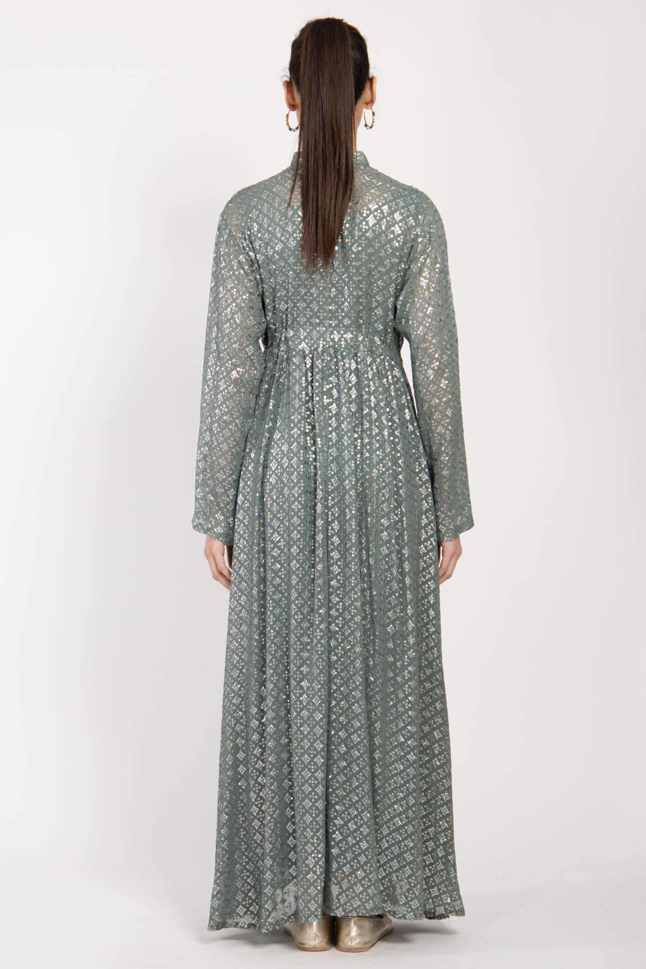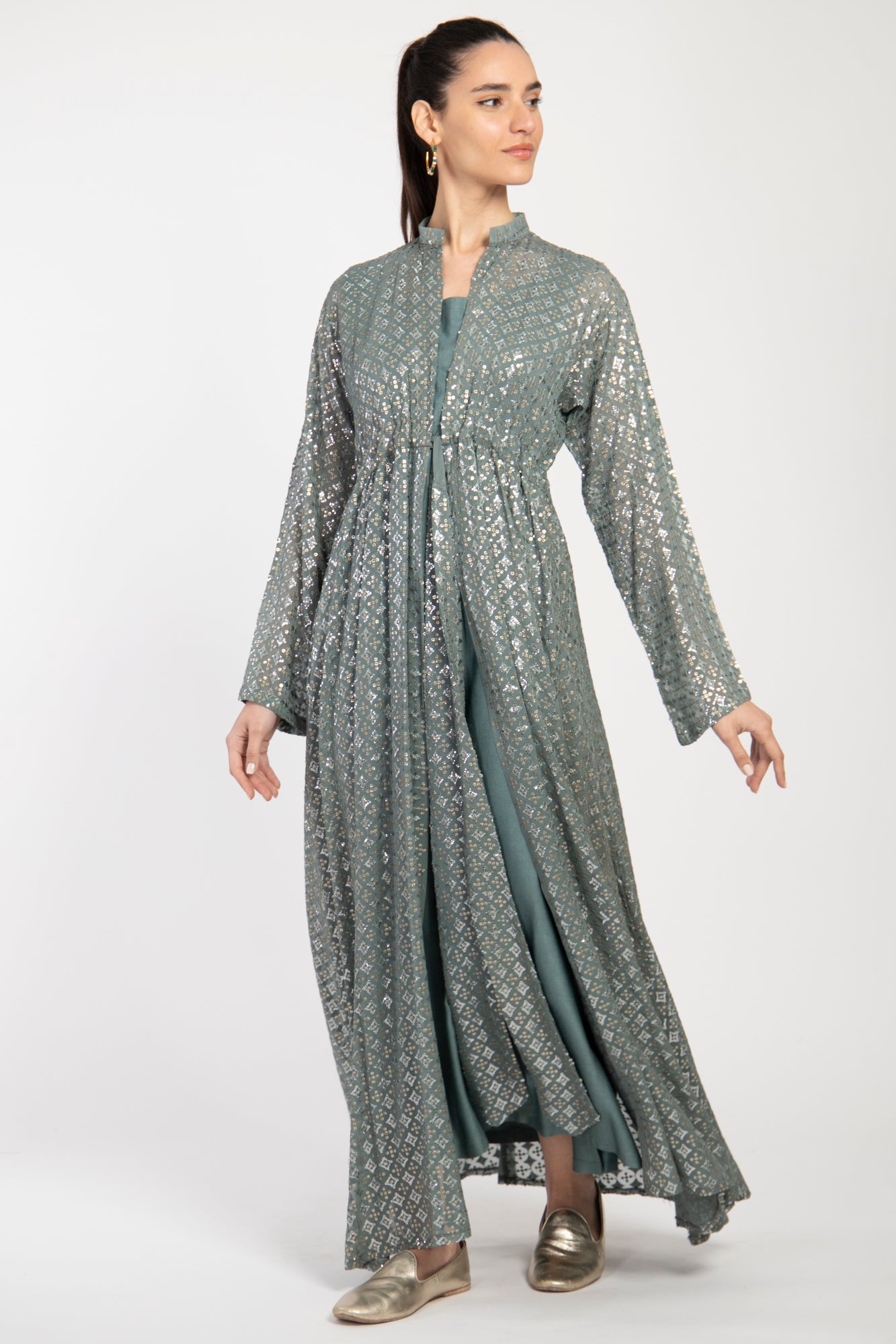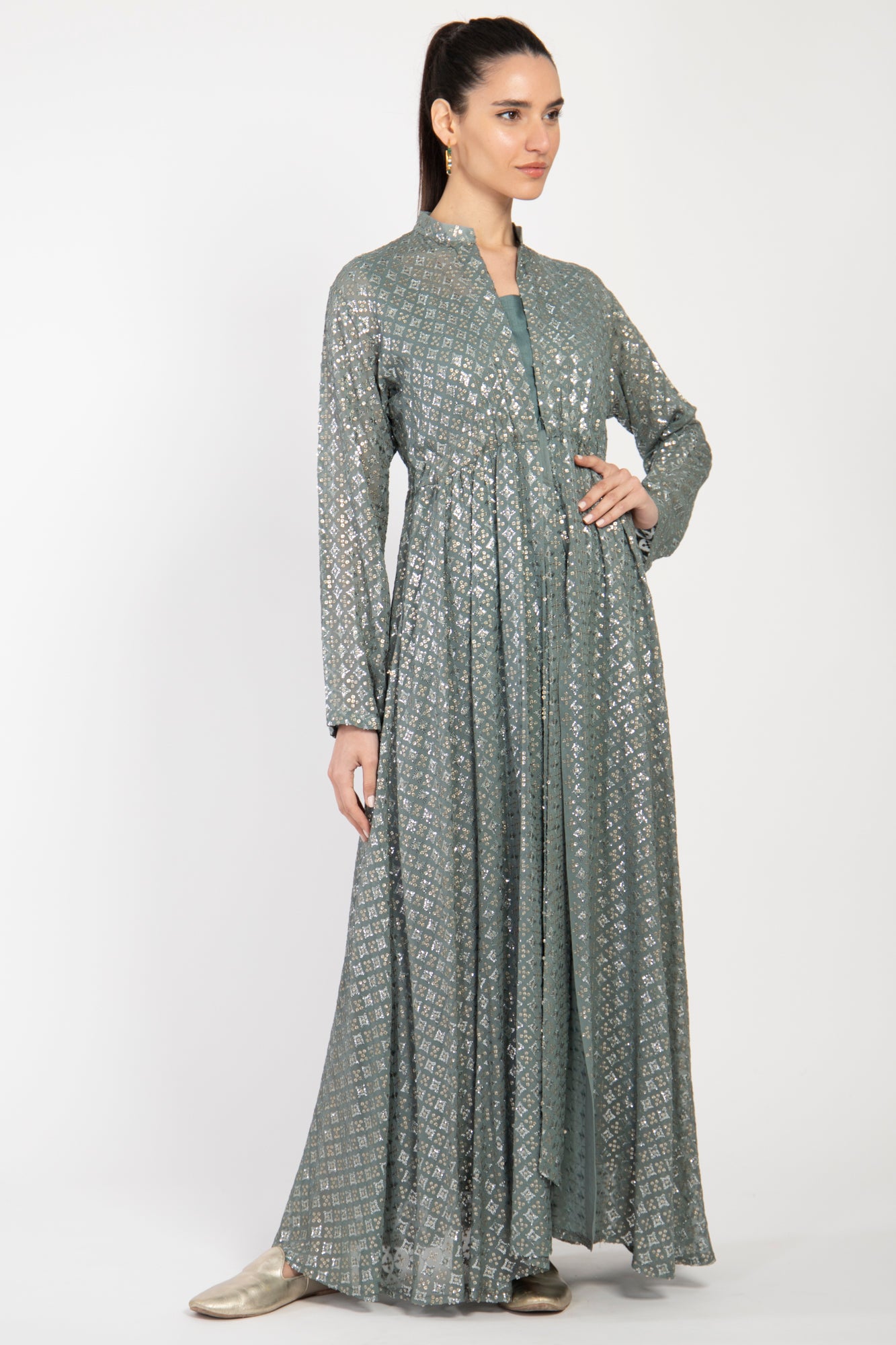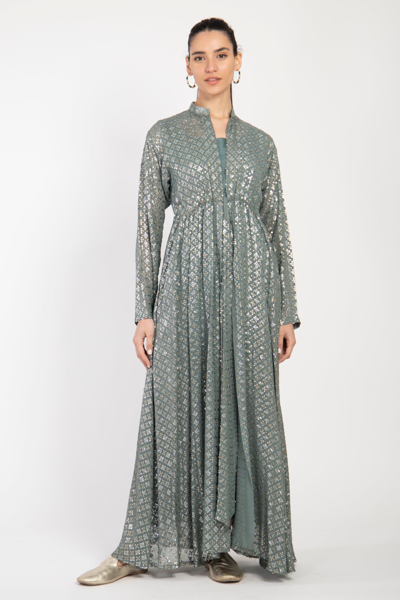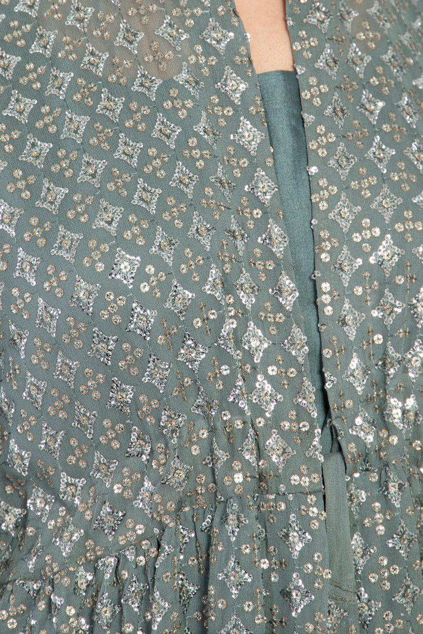 The Rayan set blends tradition and modernity through its intricate metallic embroidery and flowing silhouette. Made from silk georgette, the full-length outer layer features subtle gathers at the waist and is paired with a matching underdress for added elegance and ease.