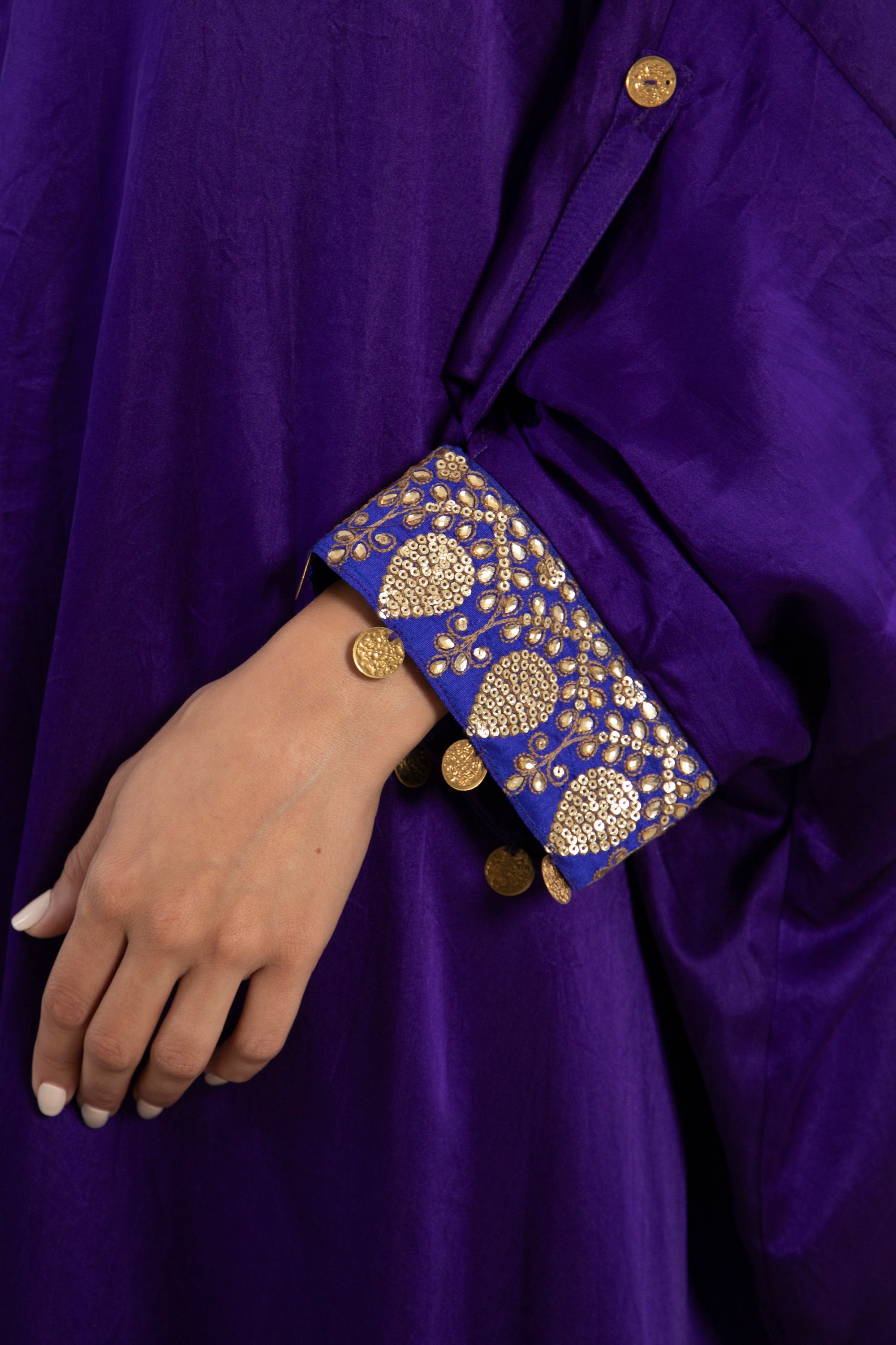 The Zinate set is a striking two-piece ensemble in deep purple silk, accented with shimmering gold coins along the cuffs and hem. The relaxed kaftan-style top pairs effortlessly with tapered pants for an elevated yet comfortable silhouette.