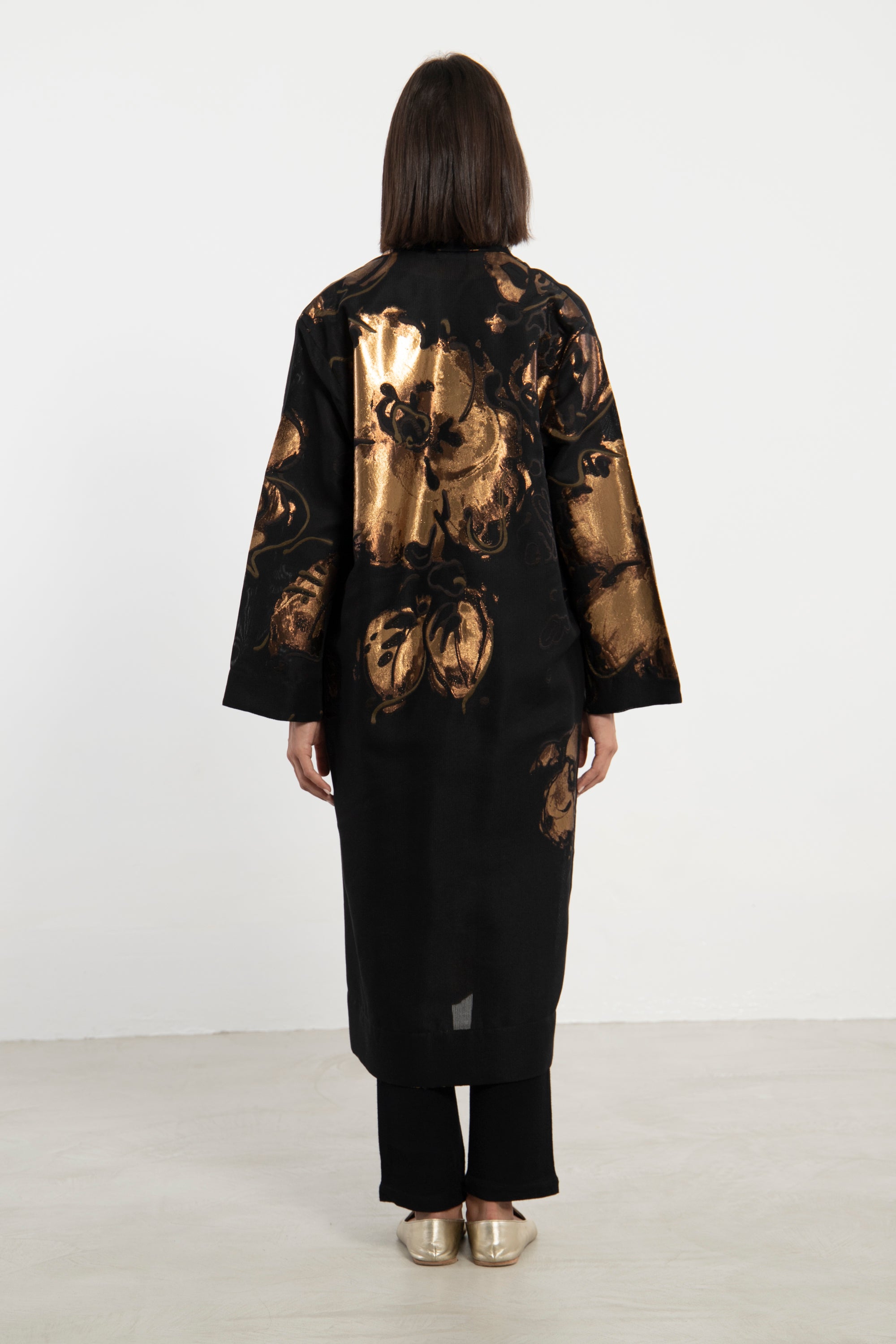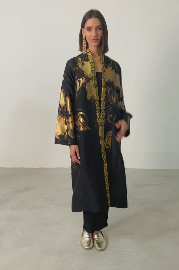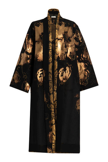 The Fay coat is a statement layering piece crafted from structured thick tulle. Featuring bold gold floral motifs and brocade trim along the front and cuffs, it merges rich texture with dramatic elegance. Designed in a free-size silhouette for ease and versatility.