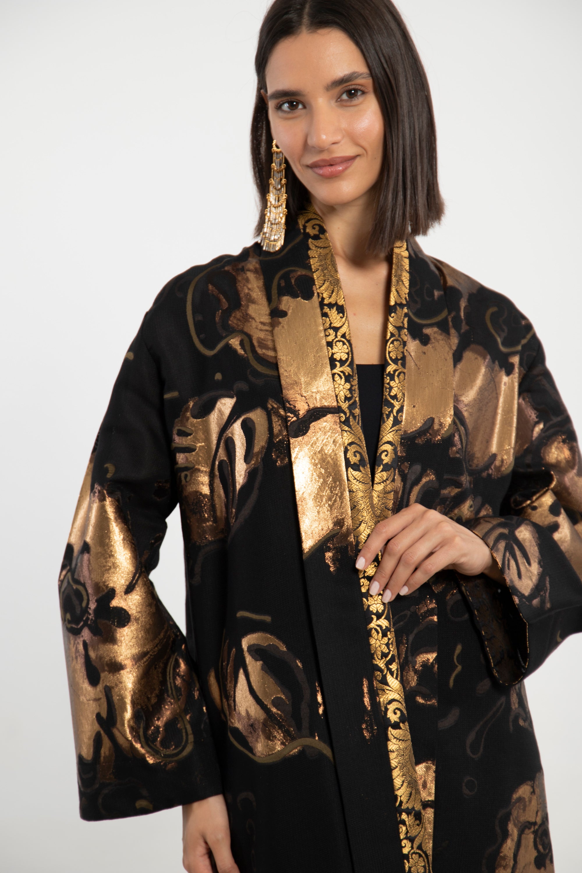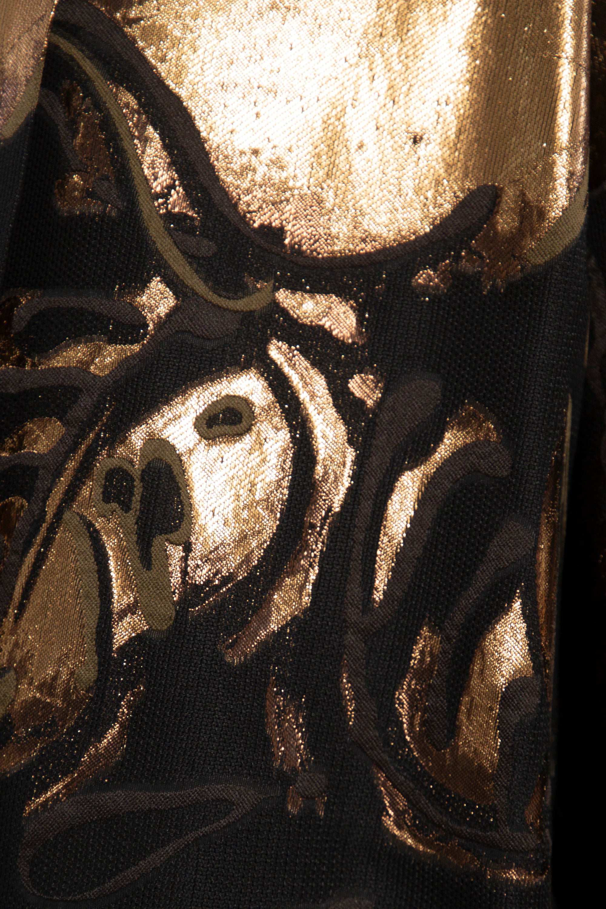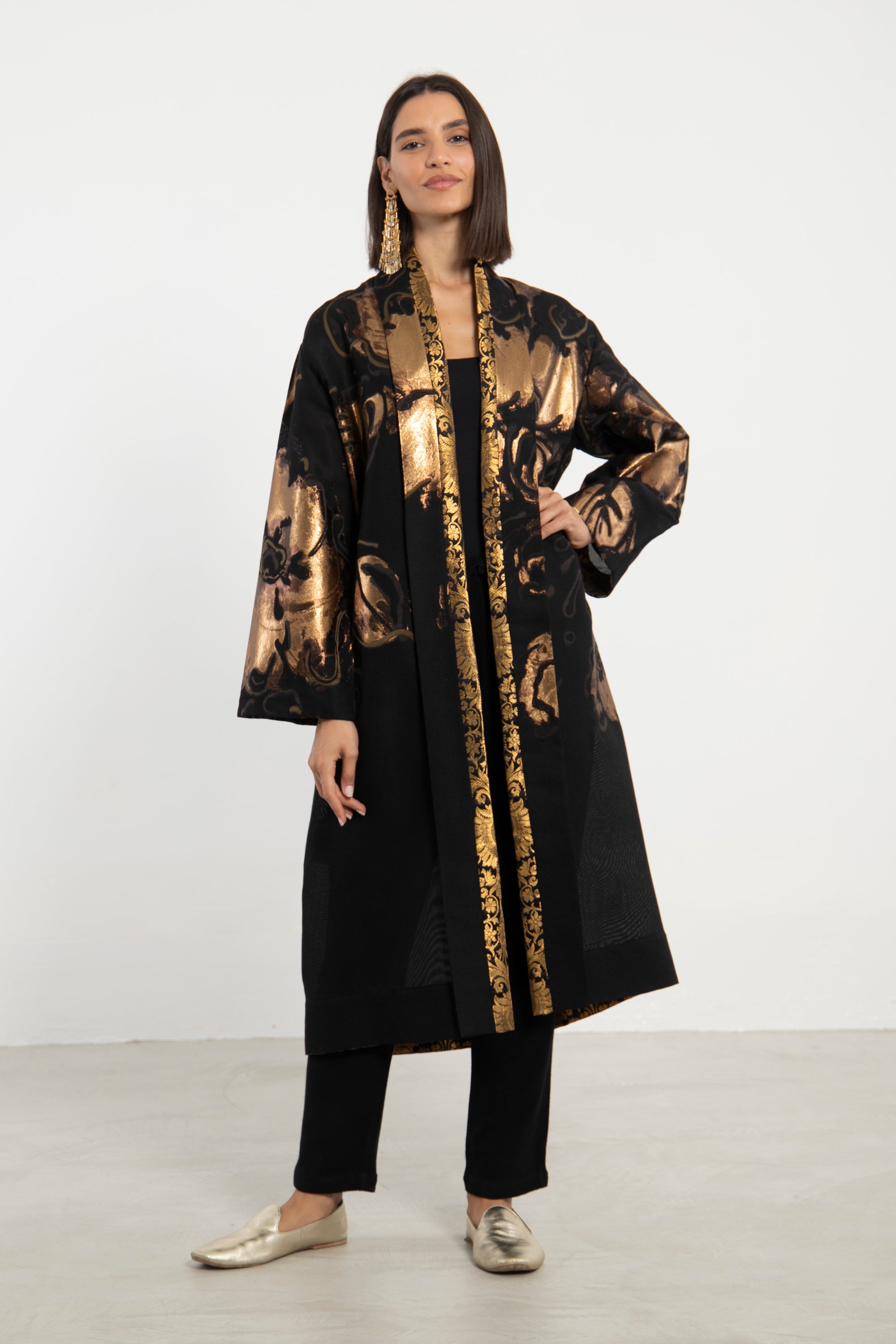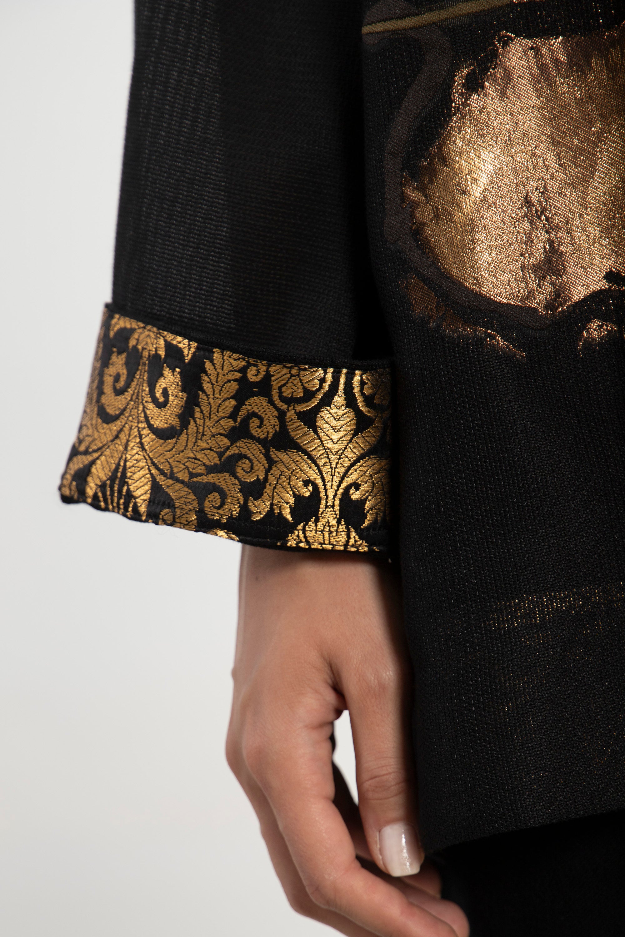 Details: Open-front coat with gold floral detailing and brocade accents