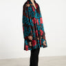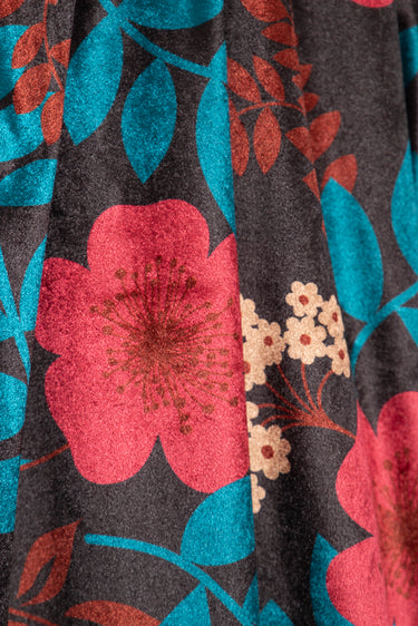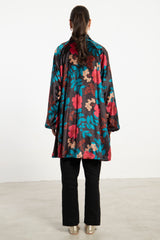 The Magda Jacket is crafted from soft velvet and features an all-over floral motif in vibrant shades of red, teal, and ochre on a deep black base. Its loose silhouette and open front offer ease and elegance in equal measure.