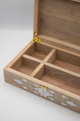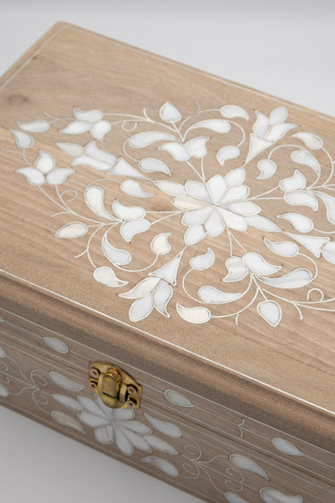 Created entirely by hand and layered with mother of pearl inlay, this jewelry box is a statement to craftsmanship.