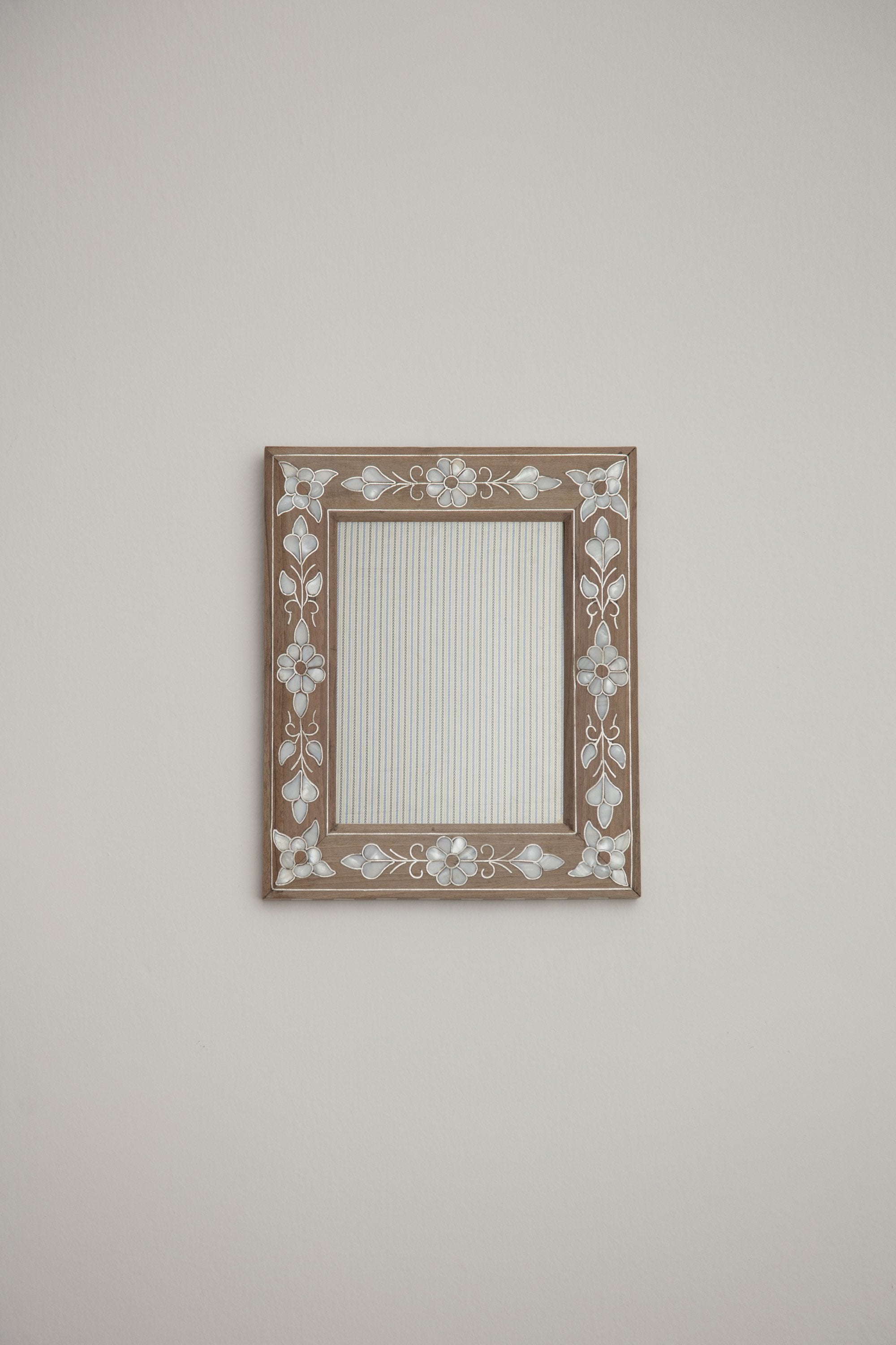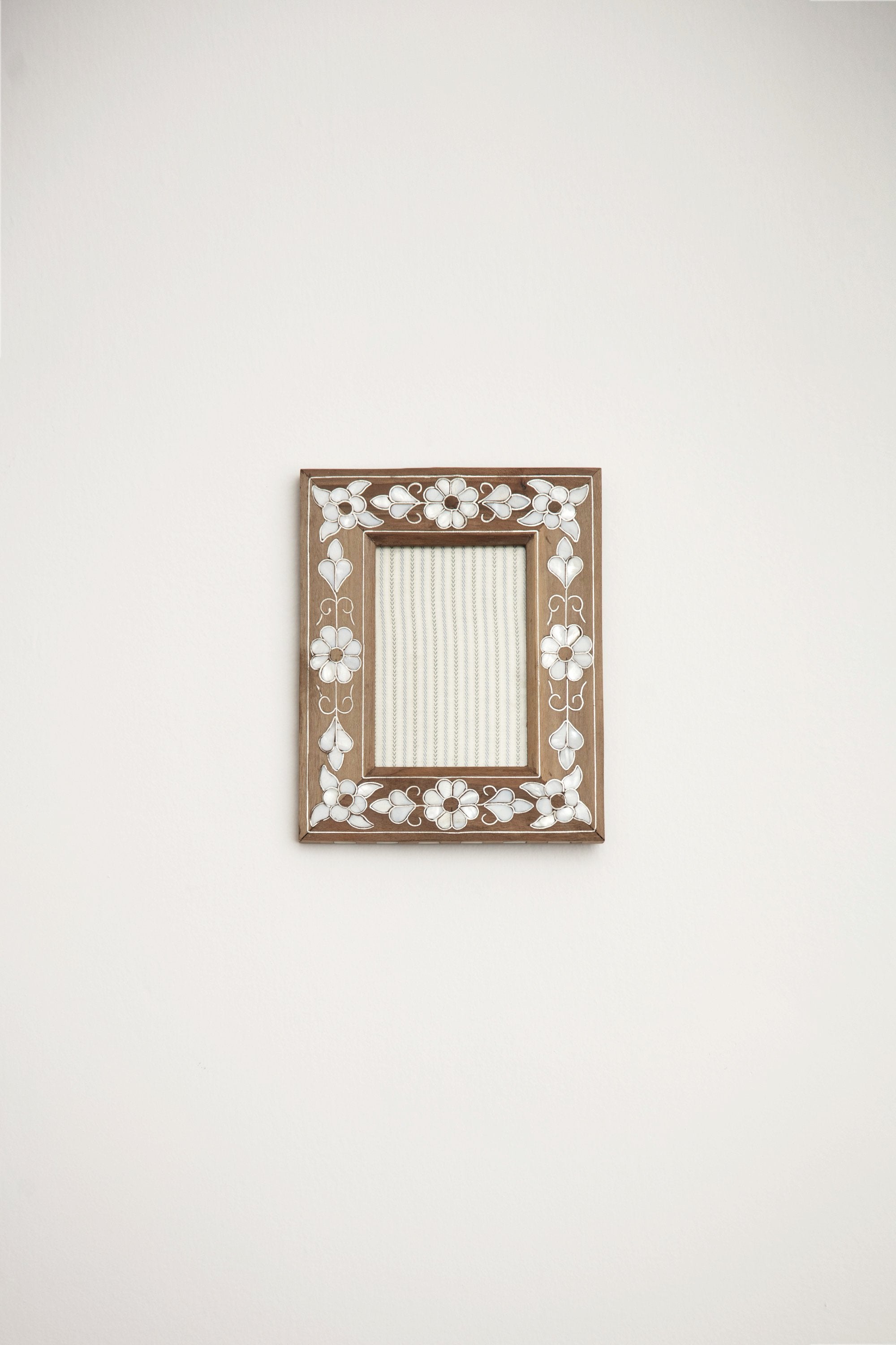 Handcrafted by skilled artisans with a mother of pearl intricate flower-like shapes inlay. Display your favorite photo in this picture frame in an hallway, living room or in your bedroom.