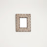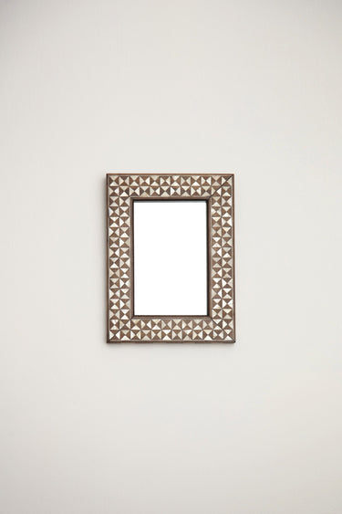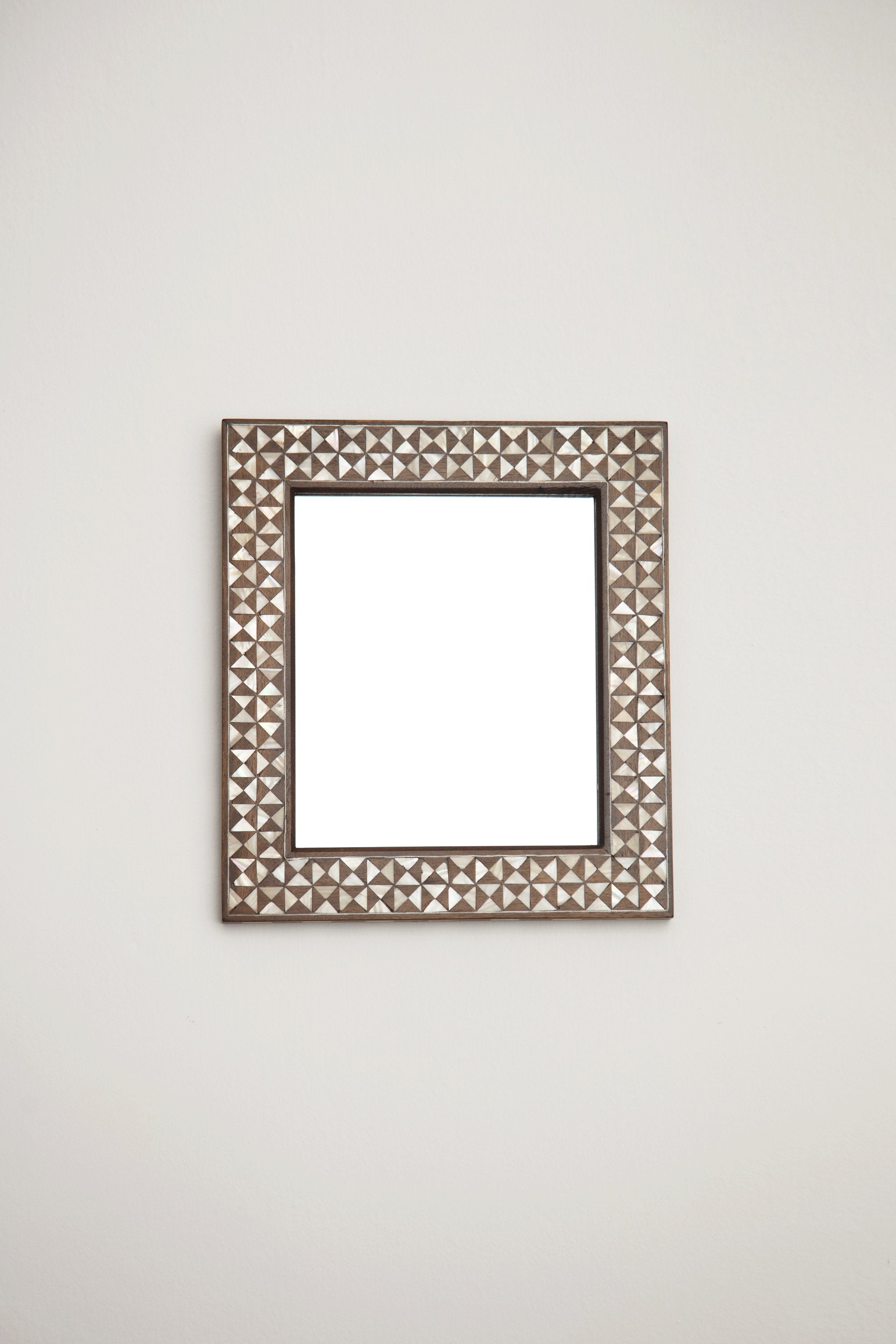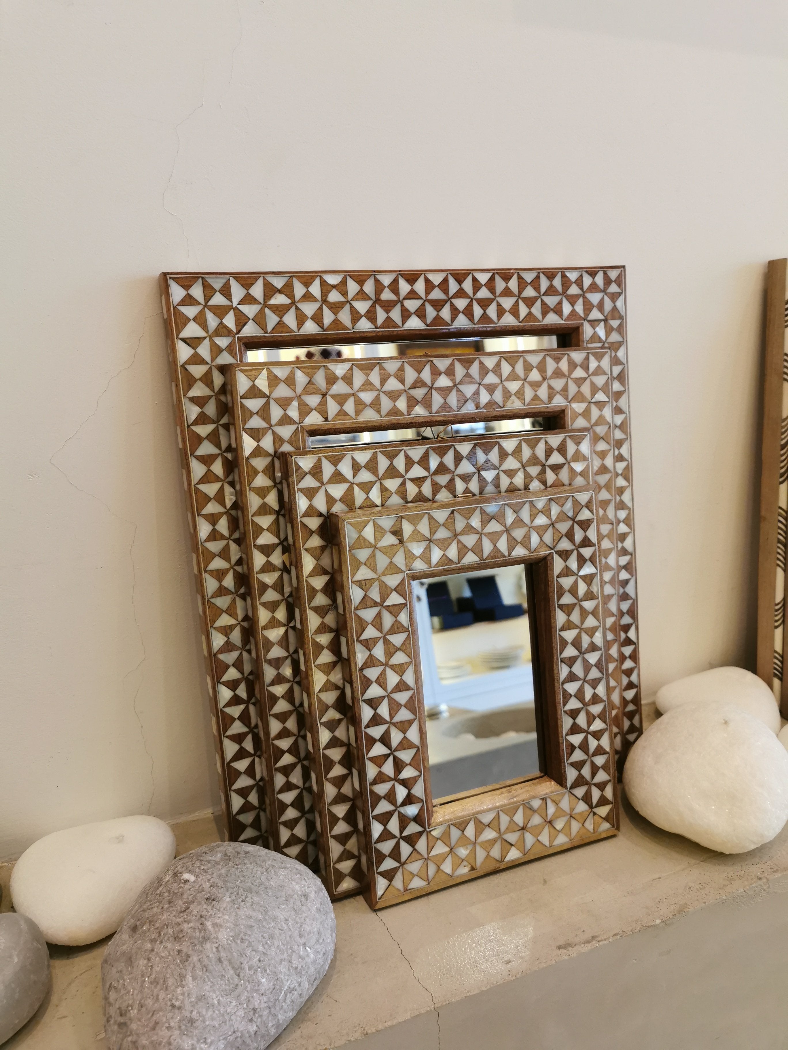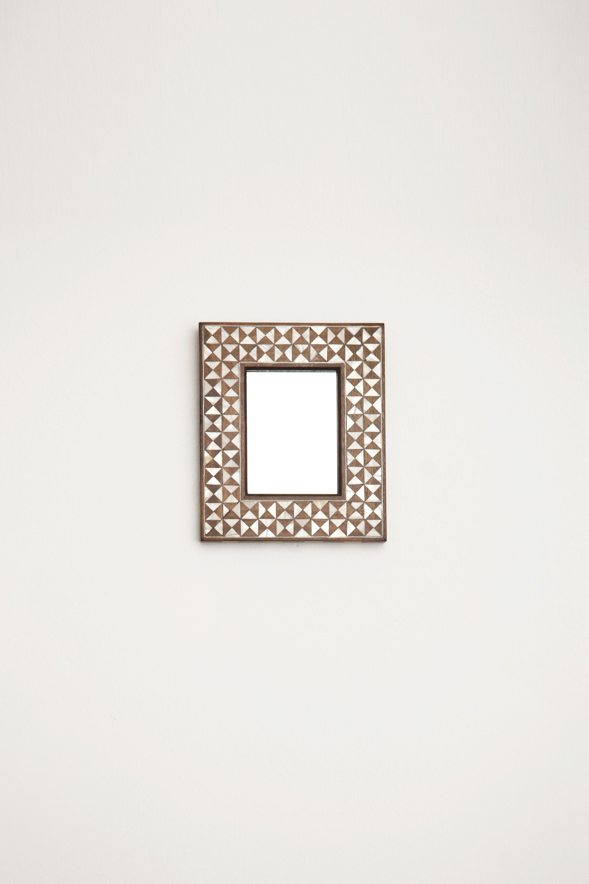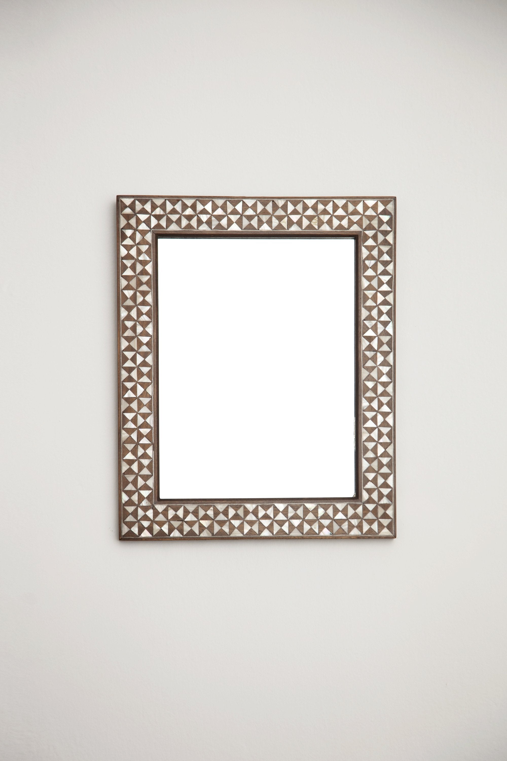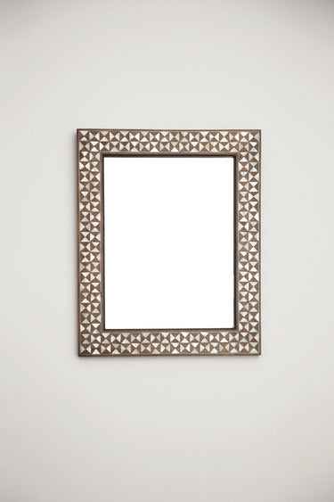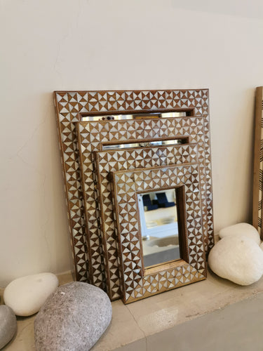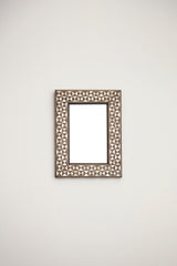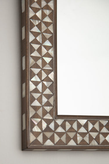 Handcrafted by skilled artisans with a mother of pearl intricate mosaic-like shapes inlay, this mirror is best hung in an hallway or in a bedroom.