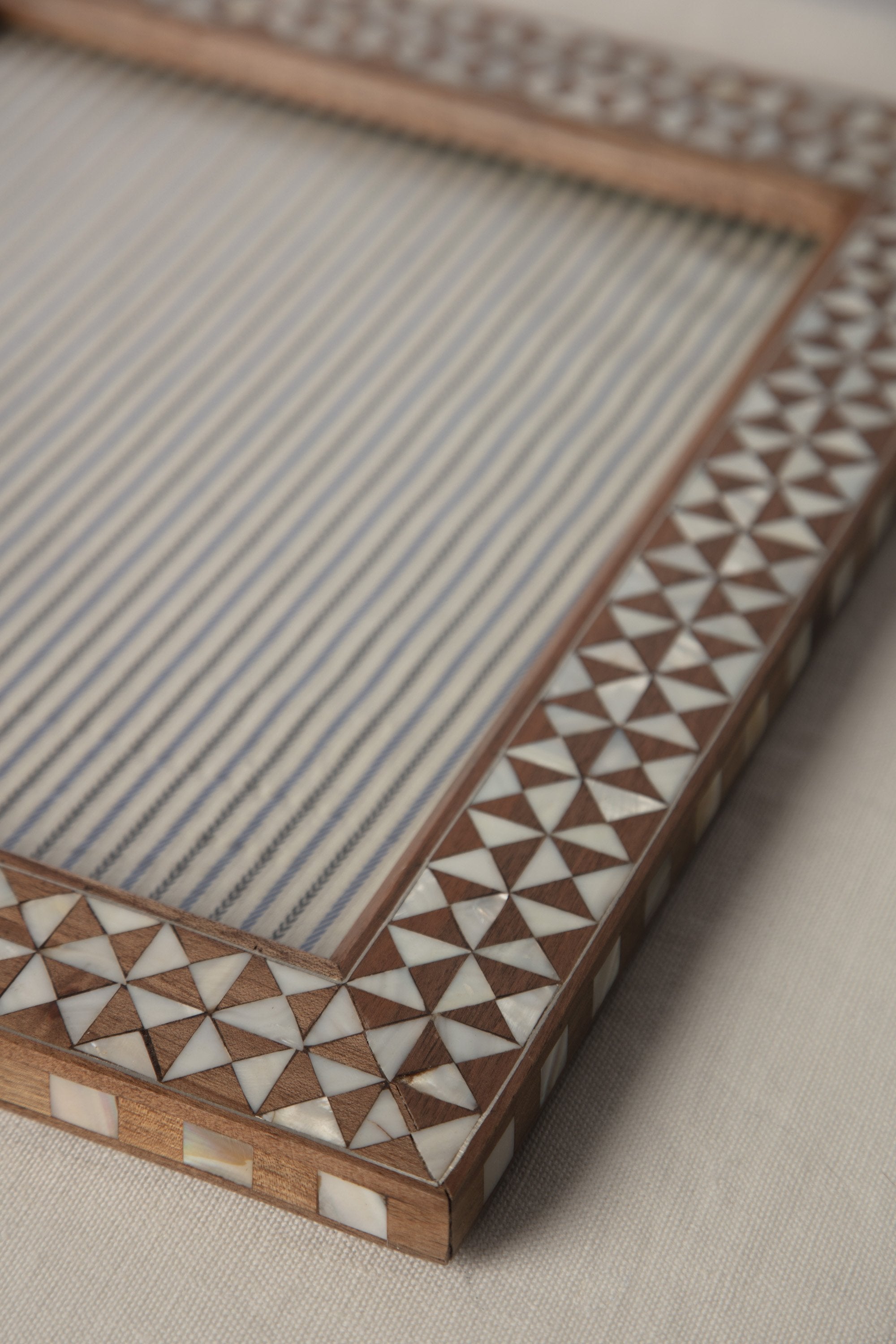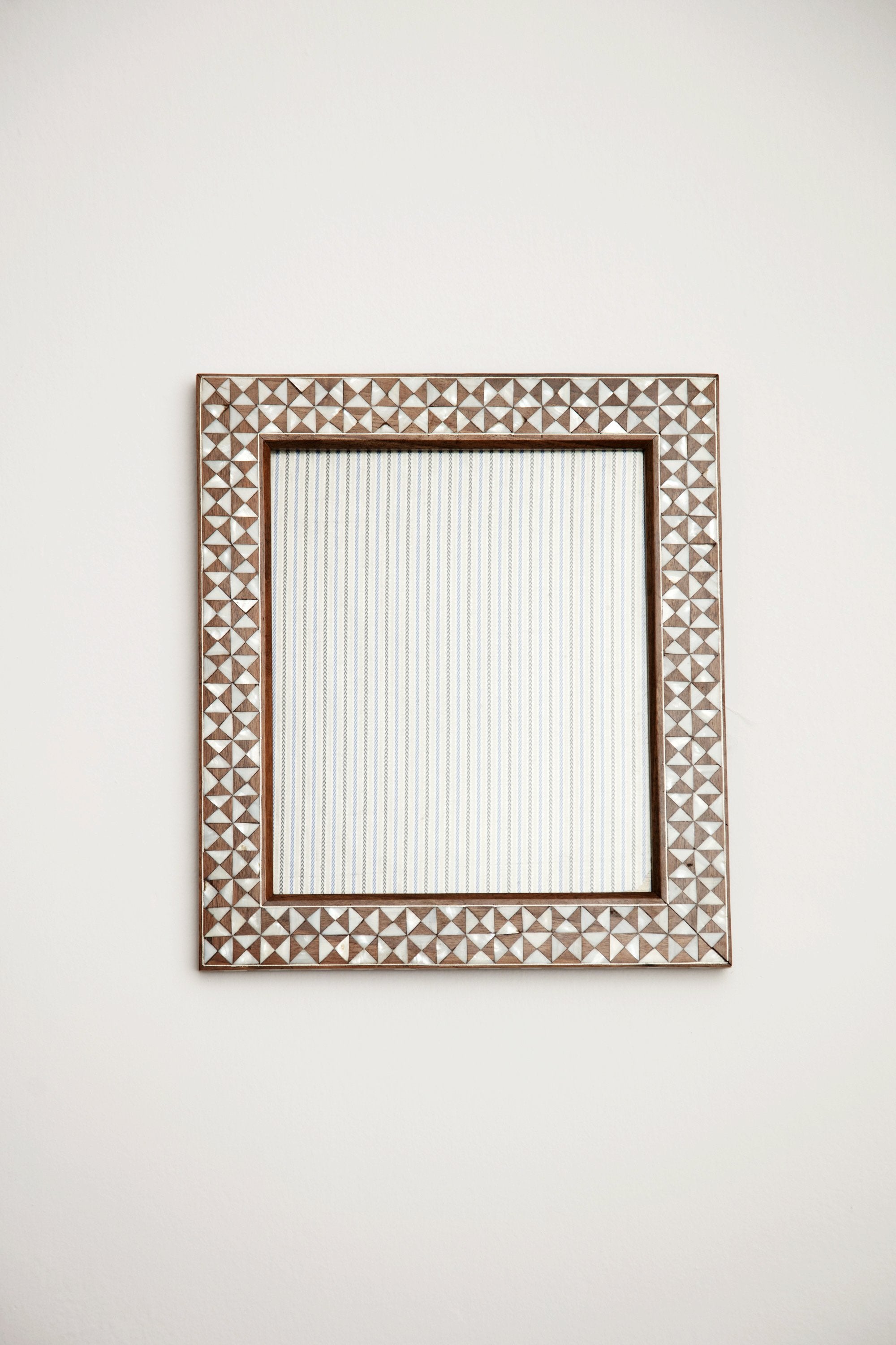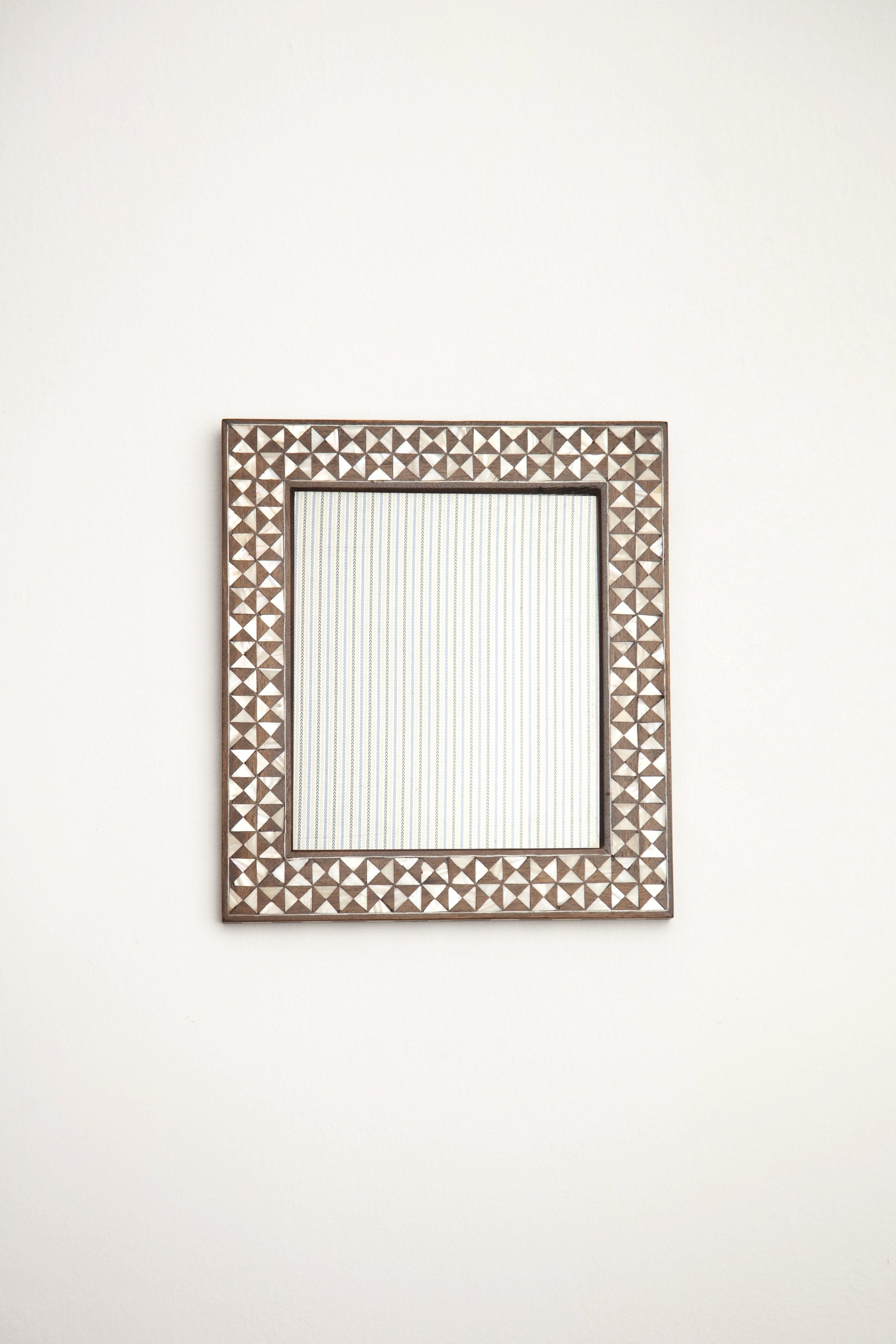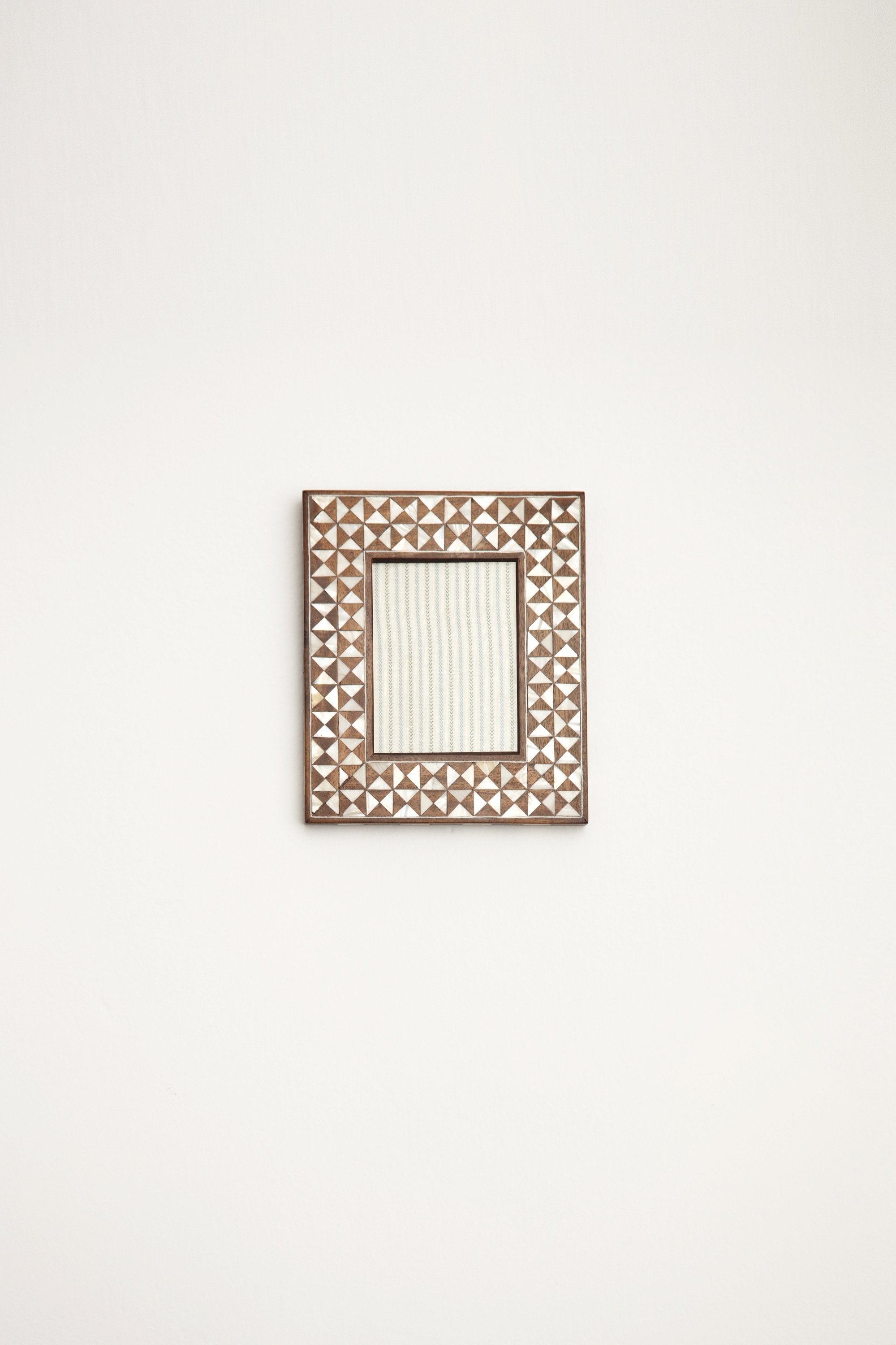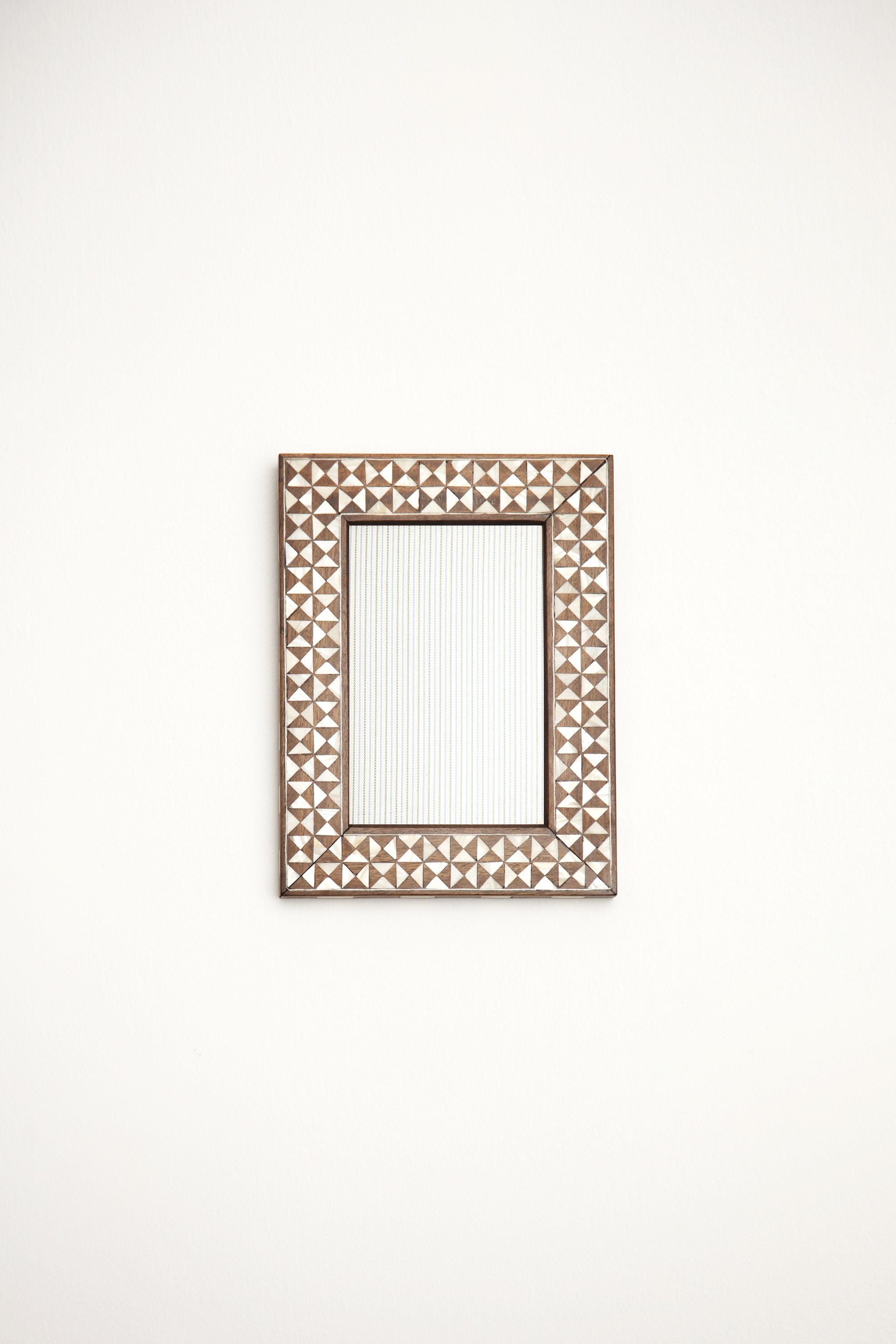 Handcrafted by skilled artisans with a mother of pearl intricate mosaic-like shapes inlay. Display your favorite photo in this picture frame in an hallway, living room or in your bedroom.