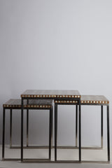 True to the tradition of the Levant, the time-honored technique of fitting together bits of mother of pearl in a mosaic-like design, skilled craftsmen inlay star hand cut mother of pearl shapes into the wood. The simple square-style design with stainless steel base lets the workmanship and materials take center stage. This set of three tables nests perfectly into one another.