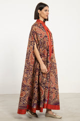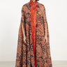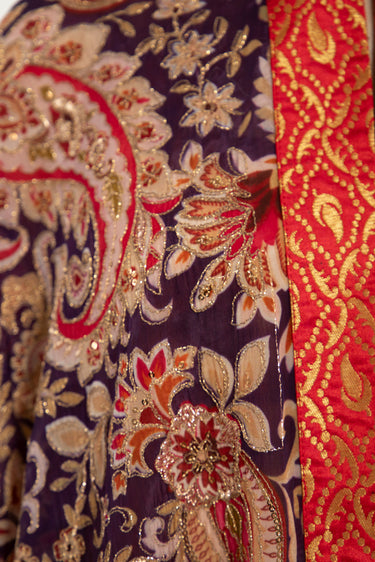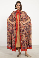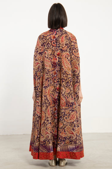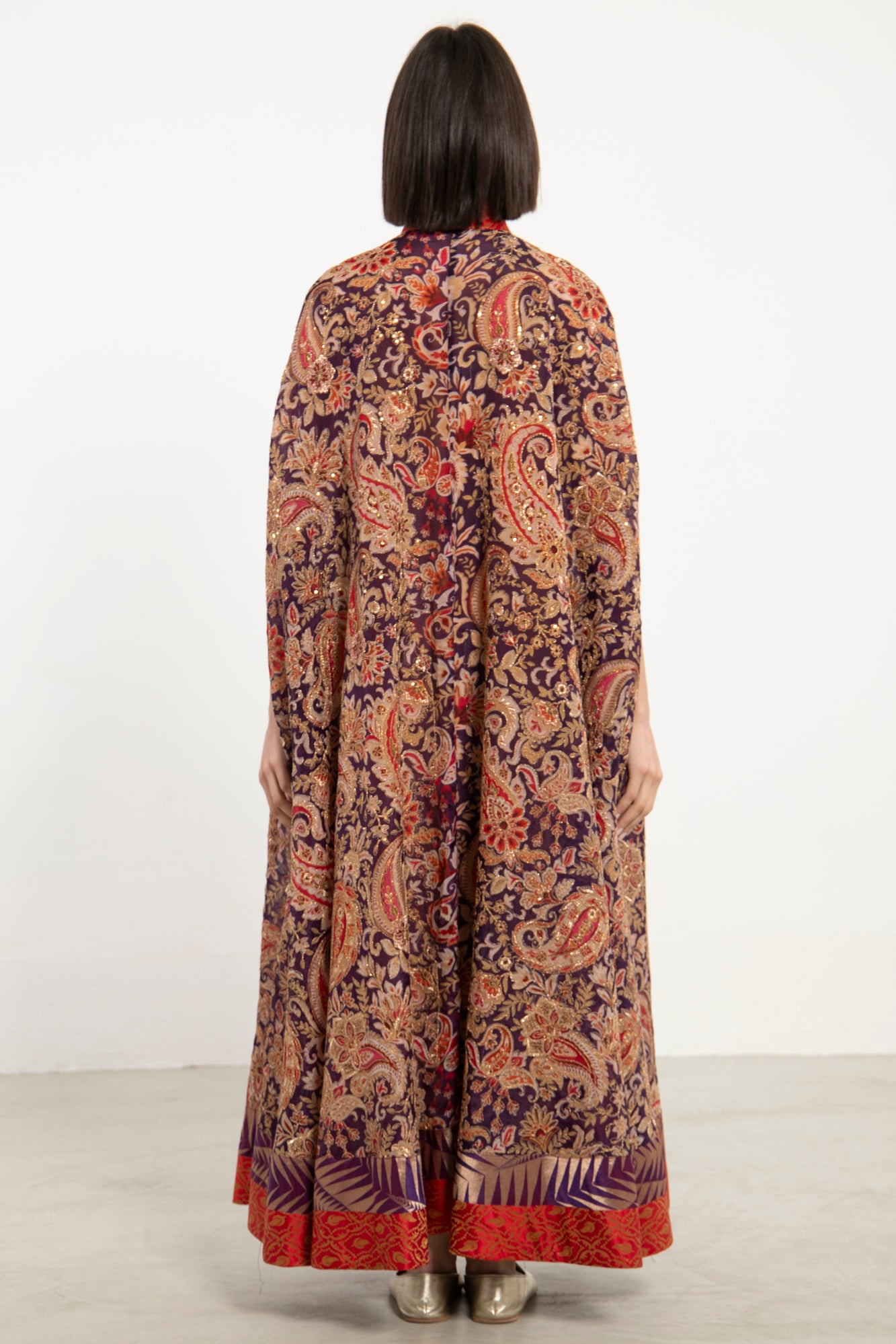 A statement cape crafted in silk taffeta, adorned with intricate embroidered fabric and silk brocade accents. Rich paisley motifs in deep plum and warm gold are elevated by a striking red front panel and hem, creating a regal yet refined silhouette.