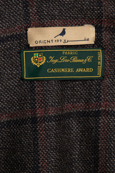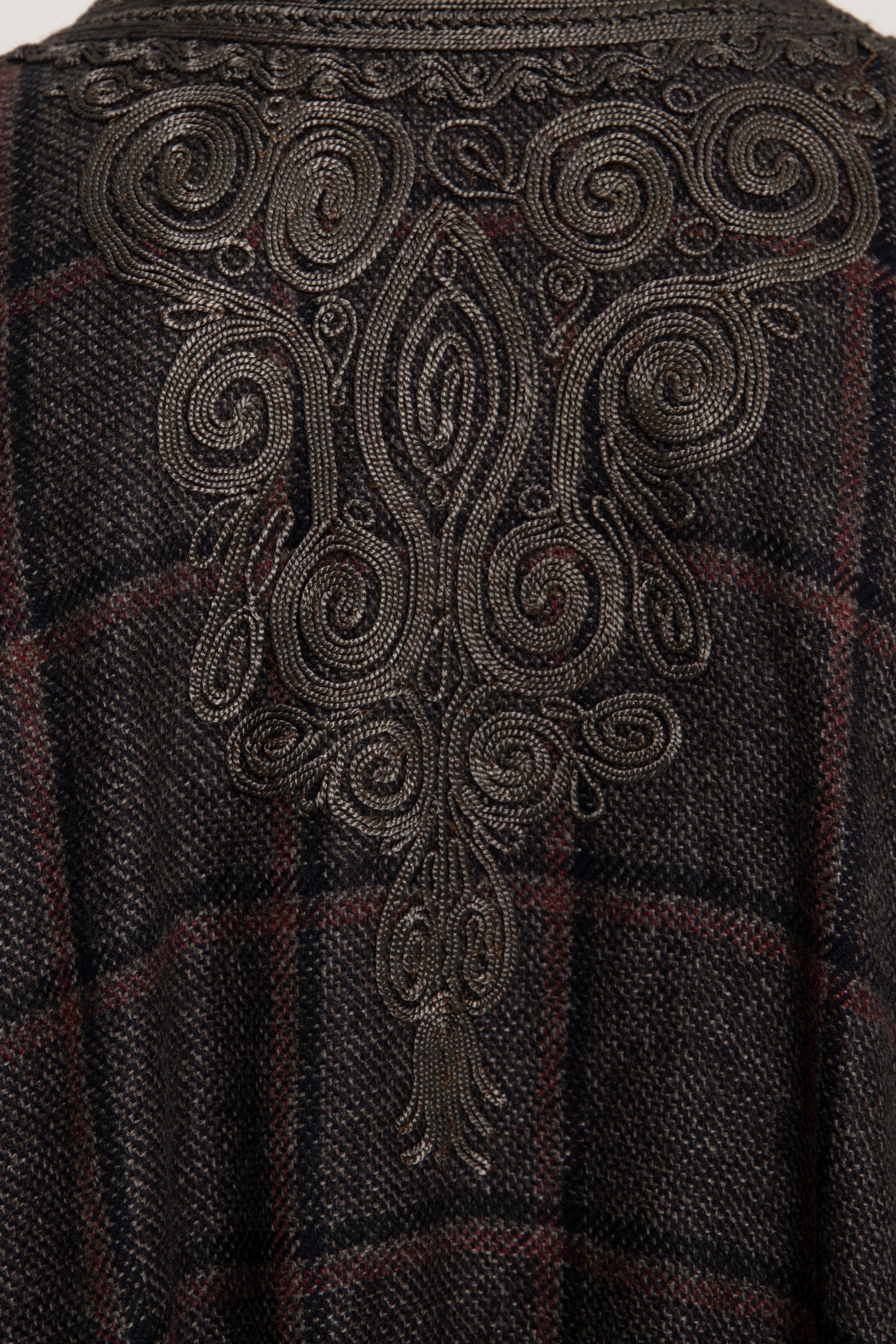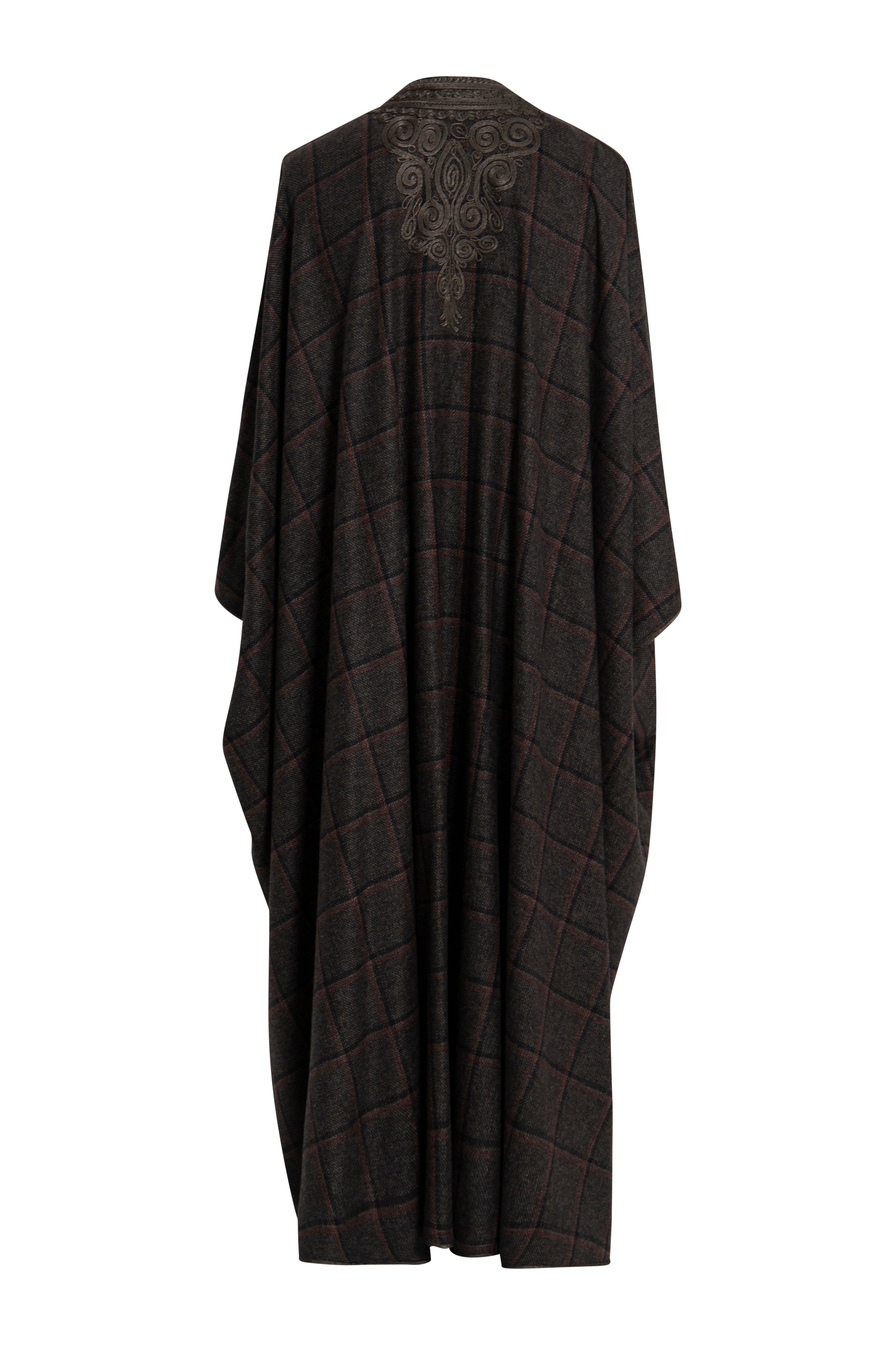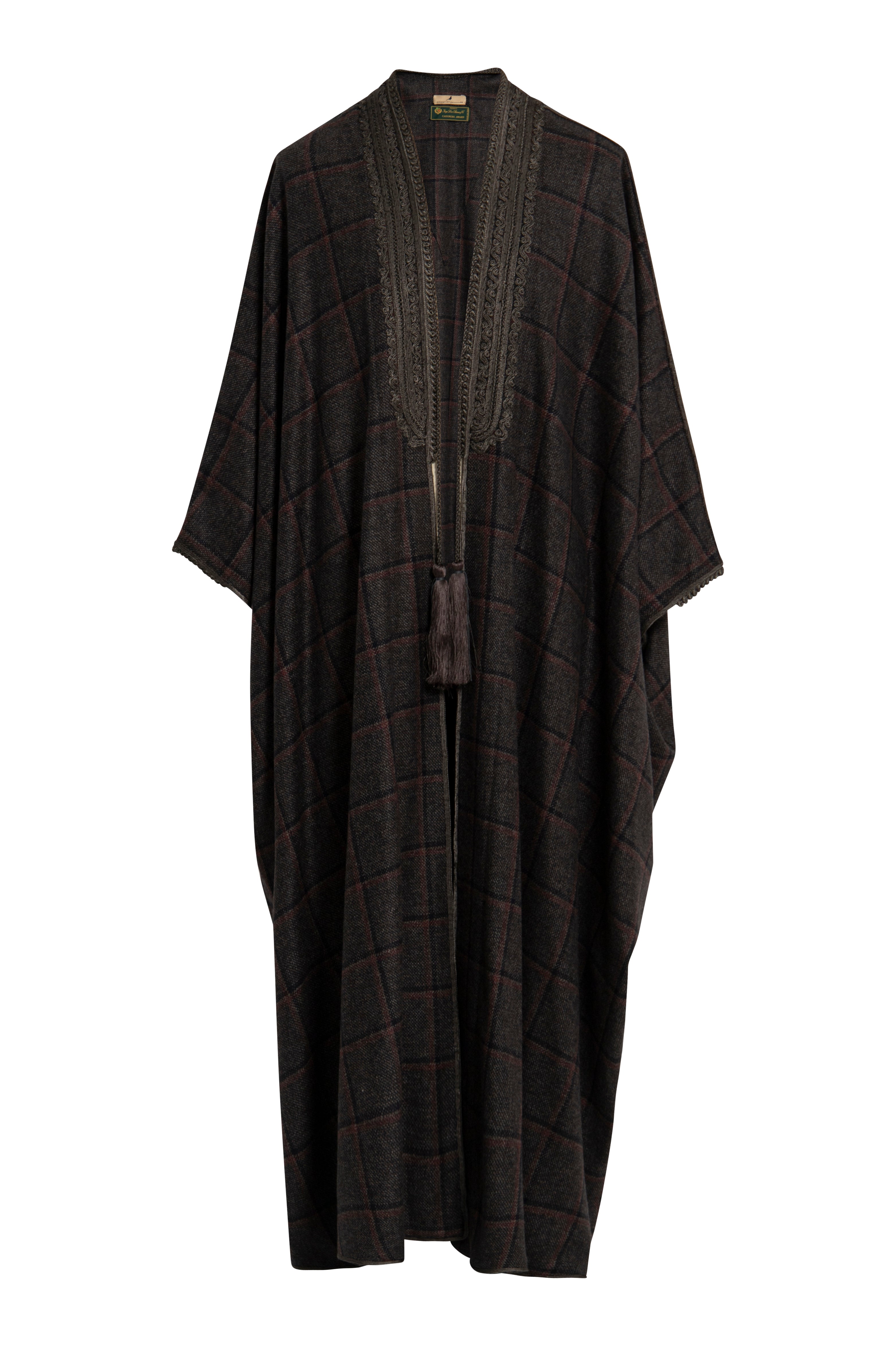 This garment is crafted with cashmere fabric made in Italy by Loro Piana. It features a soft drape and a refined brown check pattern. Embroidered trim and tassels lend a grounded elegance to its fluid silhouette.
