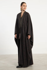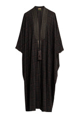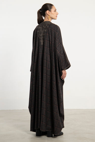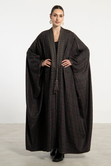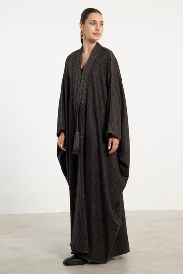 Details: Open abaya with check pattern, embroidered tassels and trim