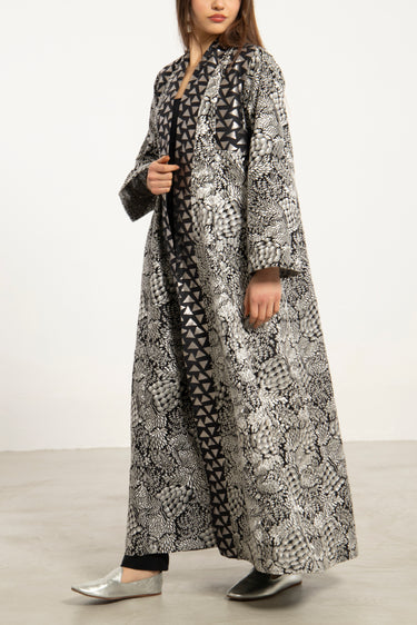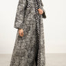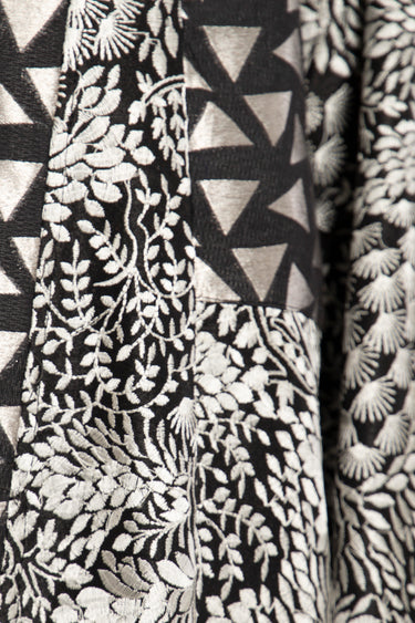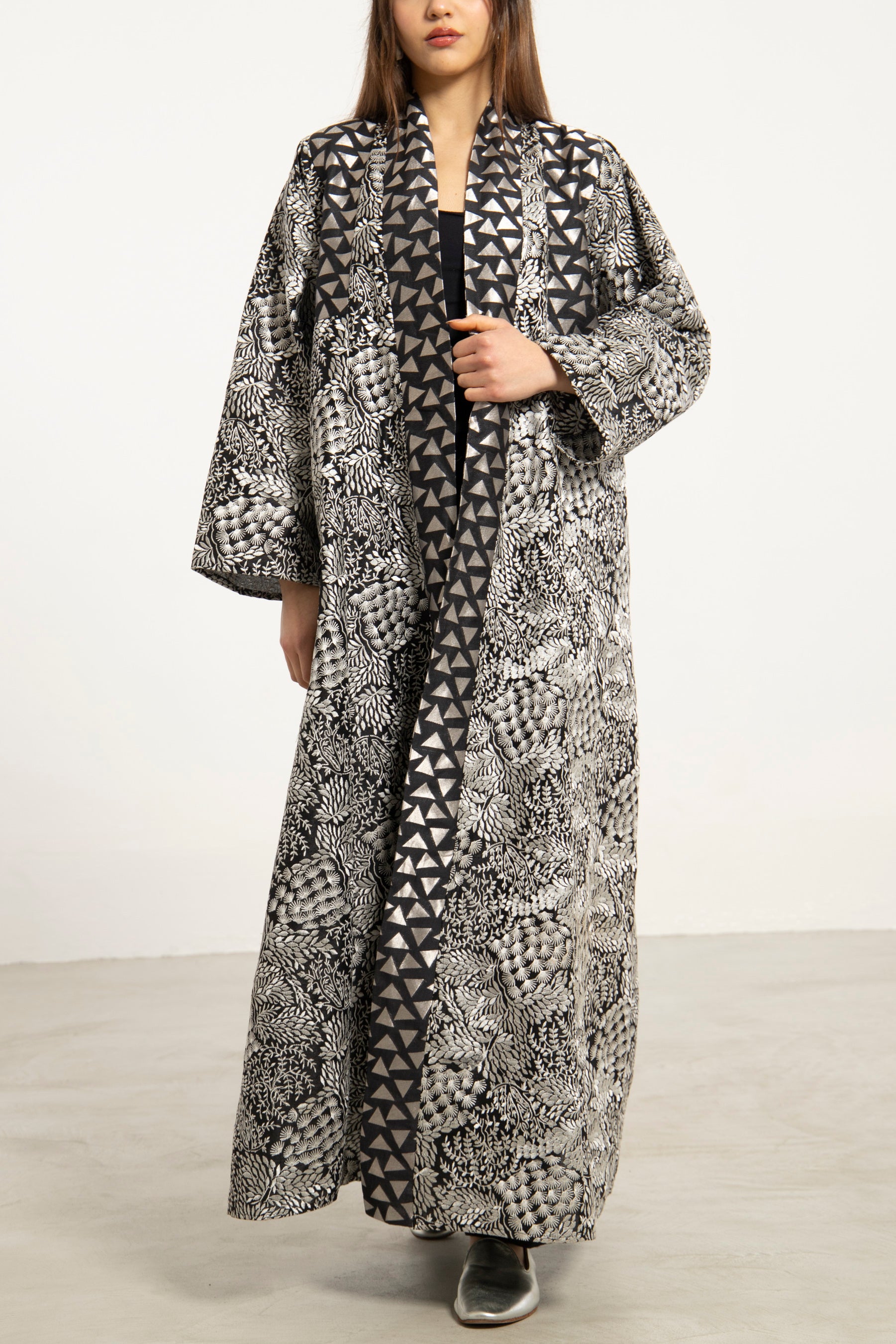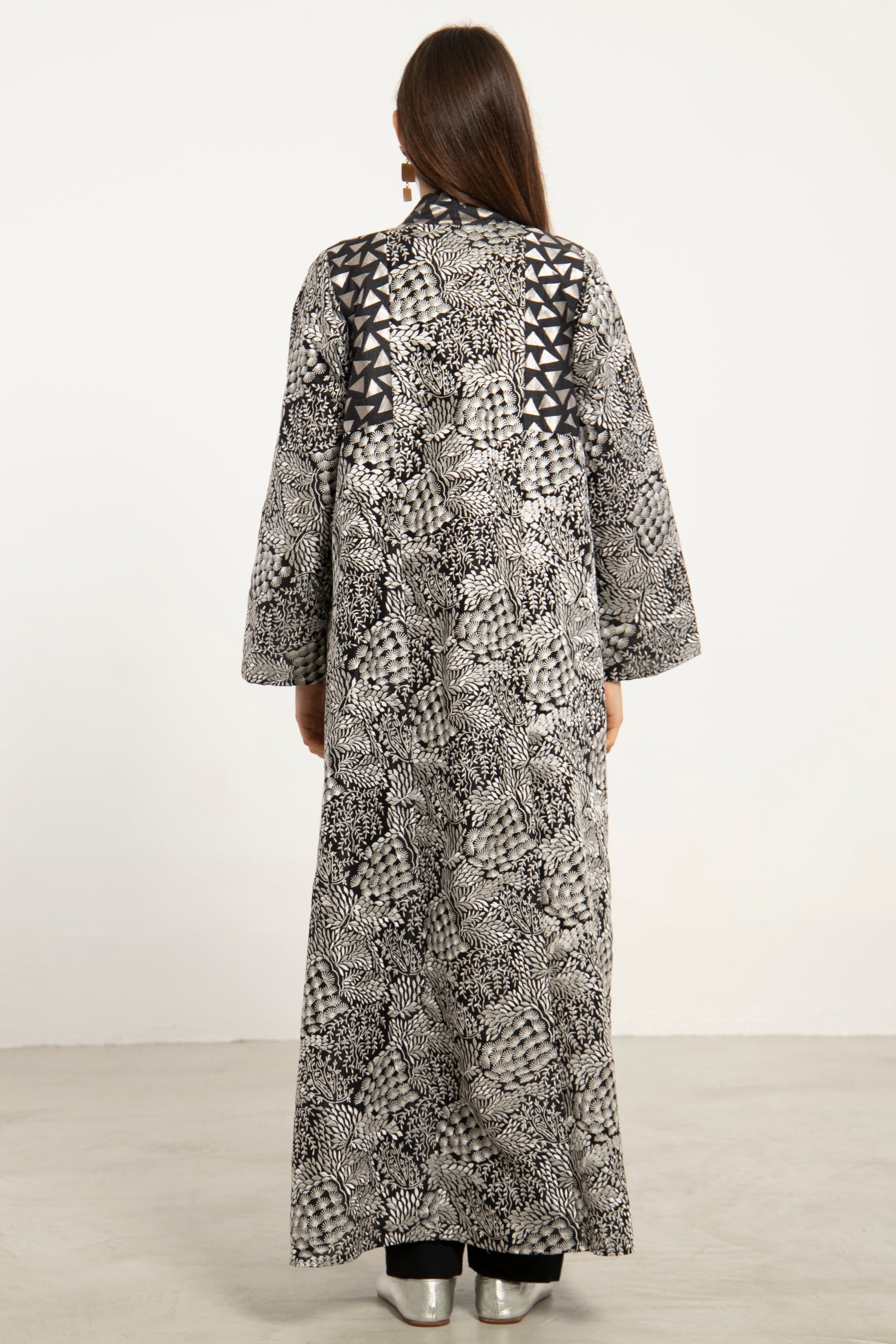 A abaya defined by contrast and craftsmanship. The Rim Abaya features a fluid cotton silk blend base adorned with intricate embroidery, elevated by silk brocade detailing along the front panel. A refined interplay of geometric and botanical motifs creates depth and movement within a timeless black palette.