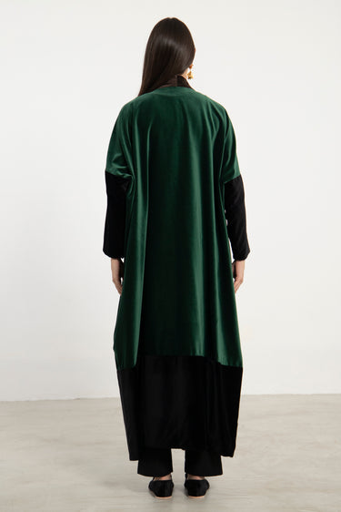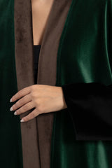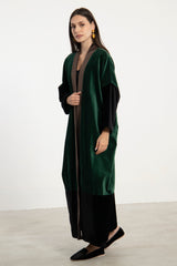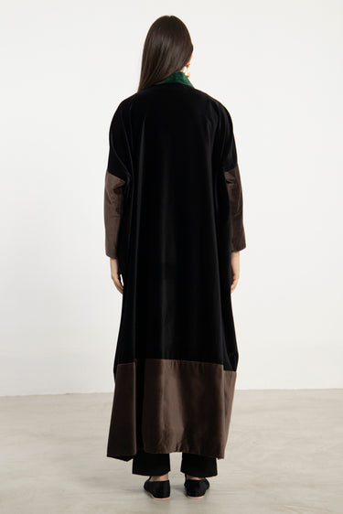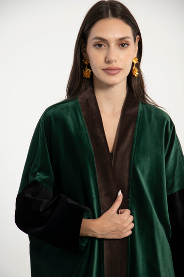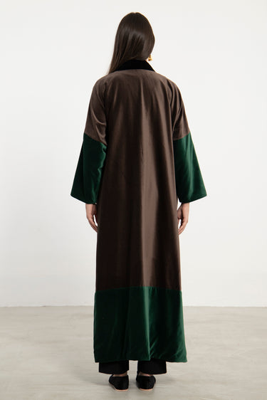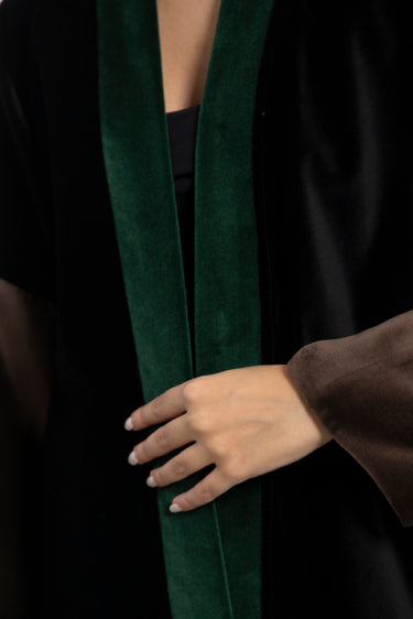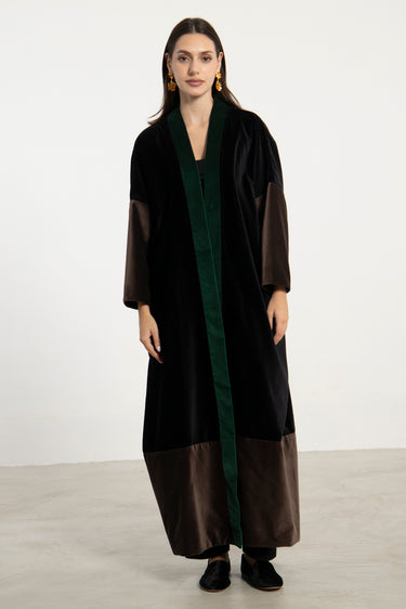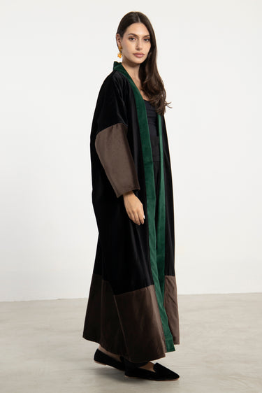 Details: Open abaya with wide sleeves and color-blocked velvet panels in black, green and brown