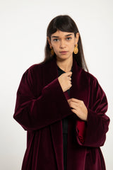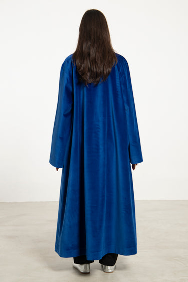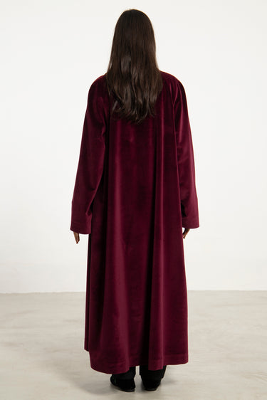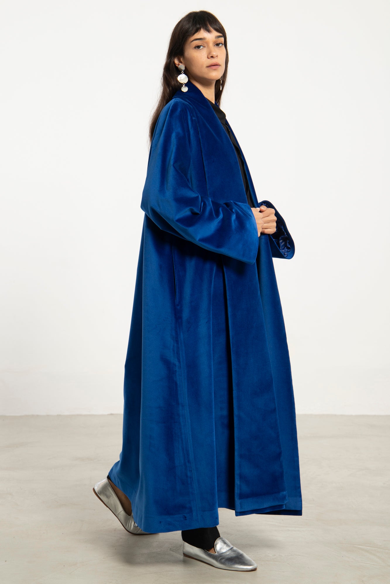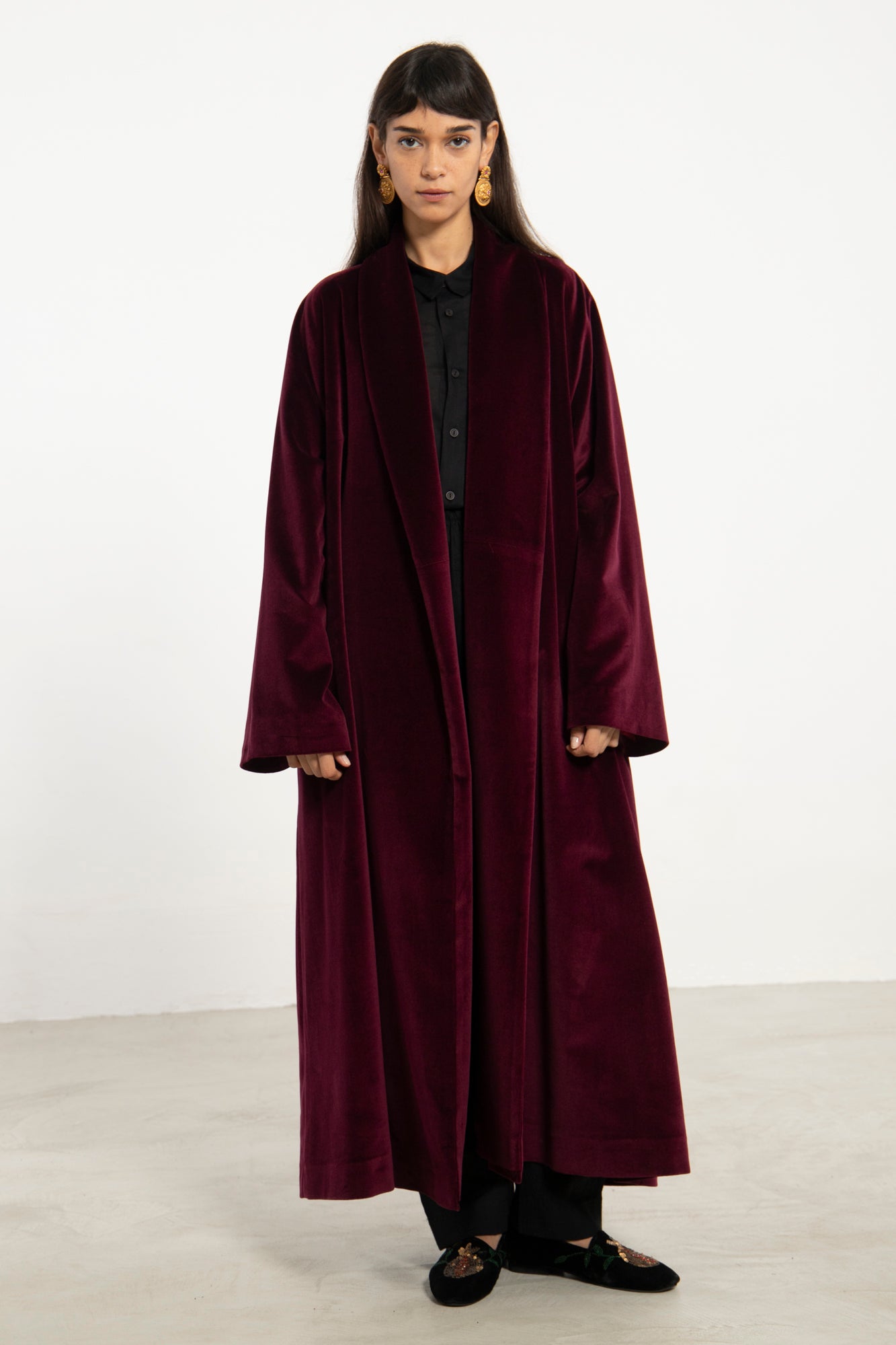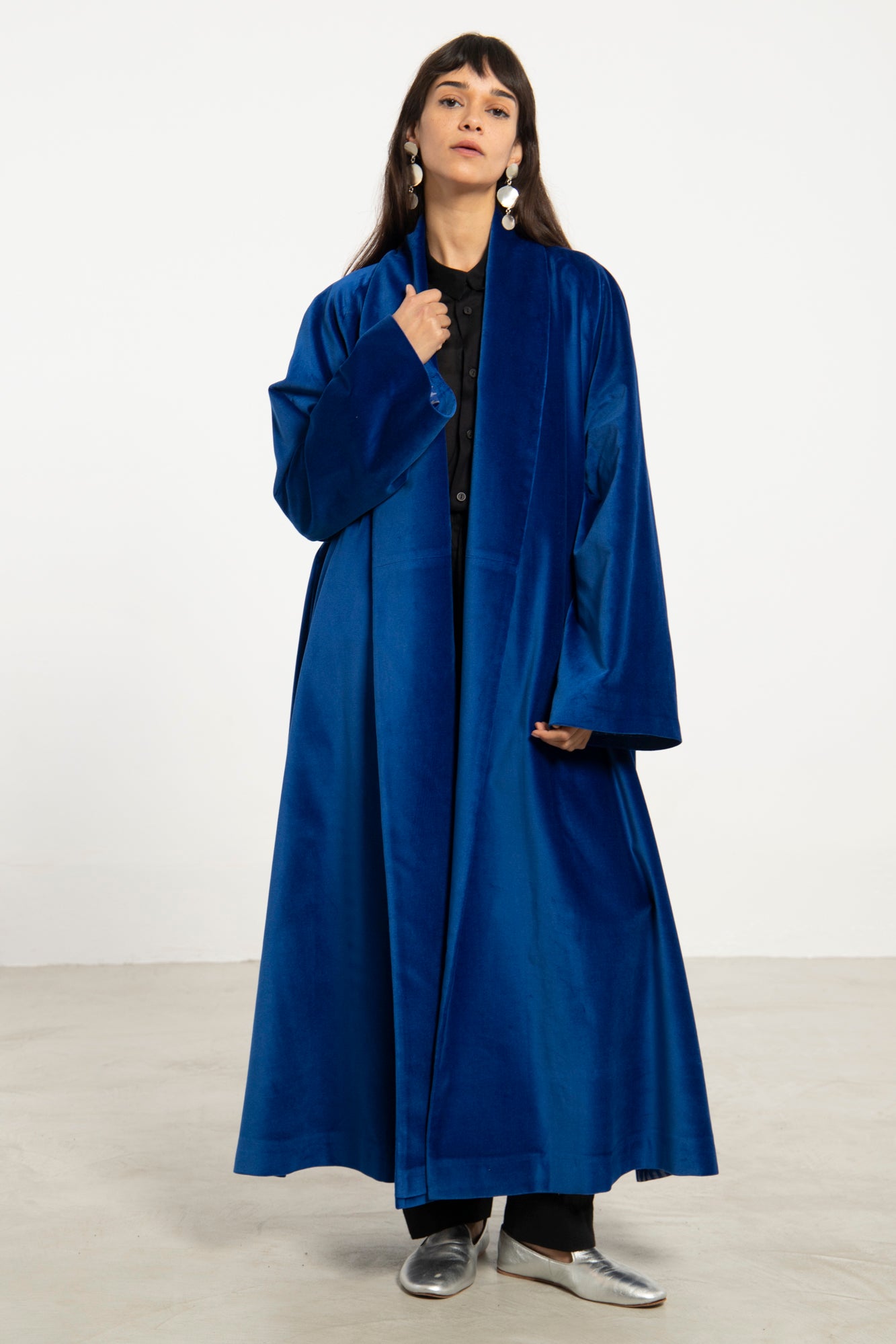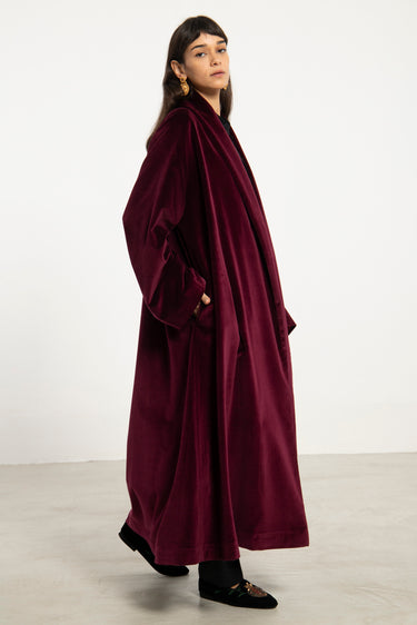 A timeless full-length coat in rich cotton velvet, the Dina Coat blends refined structure with generous ease. Its fluid silhouette and shawl collar lend understated sophistication.