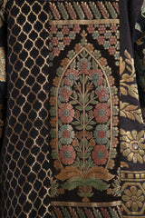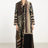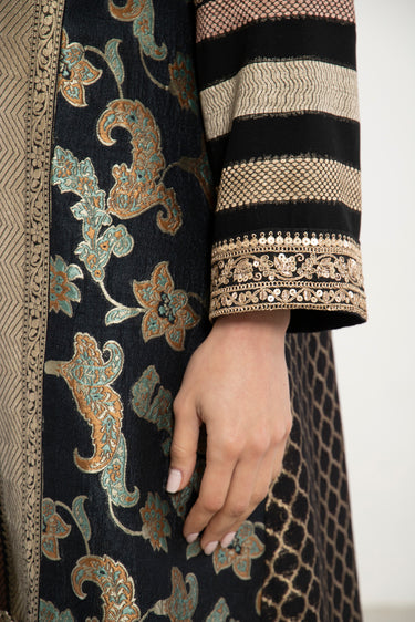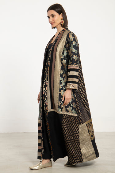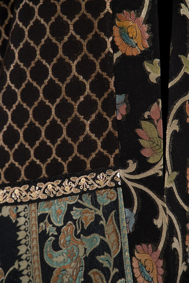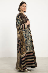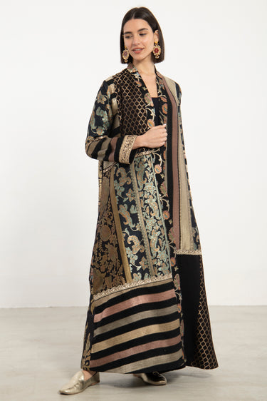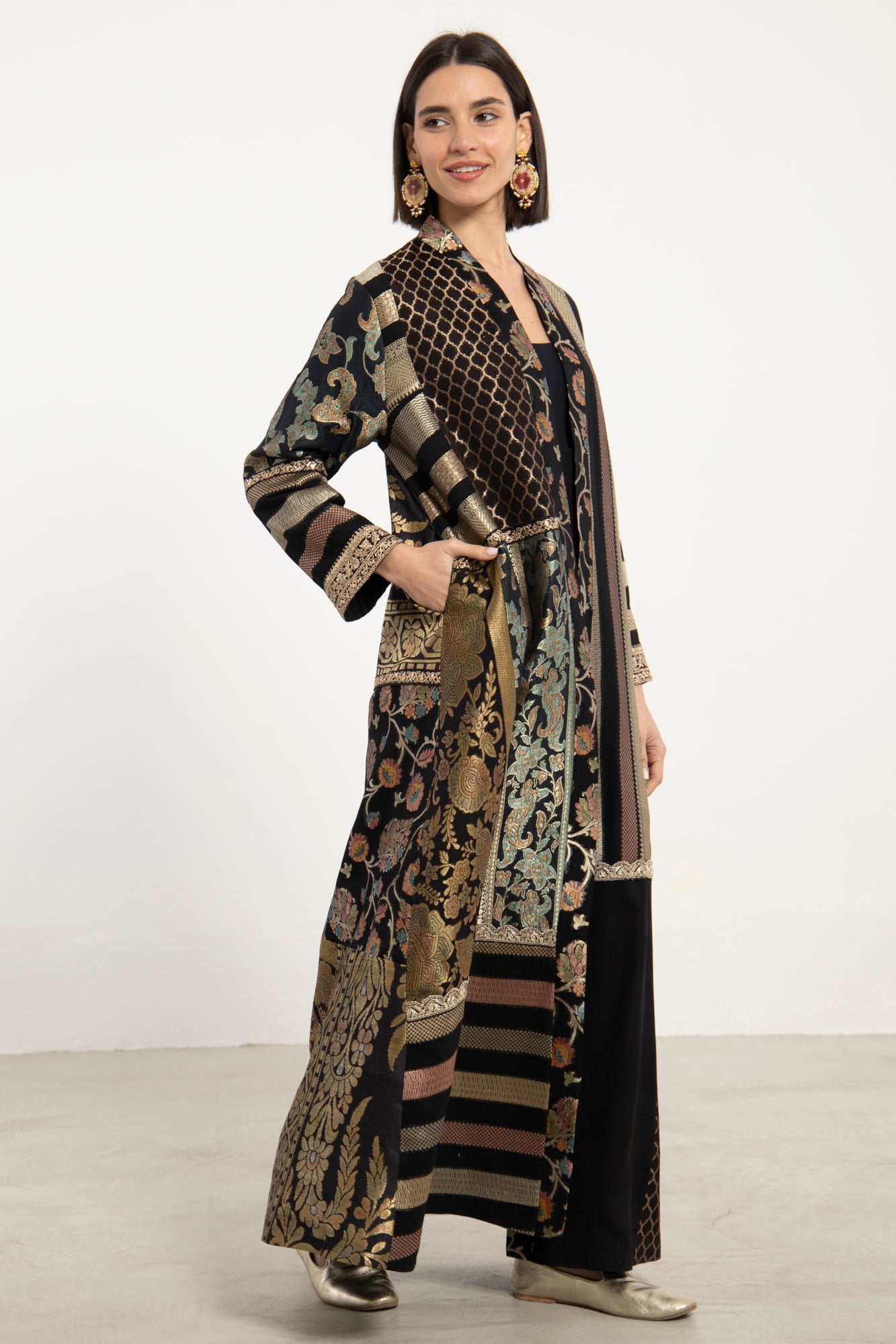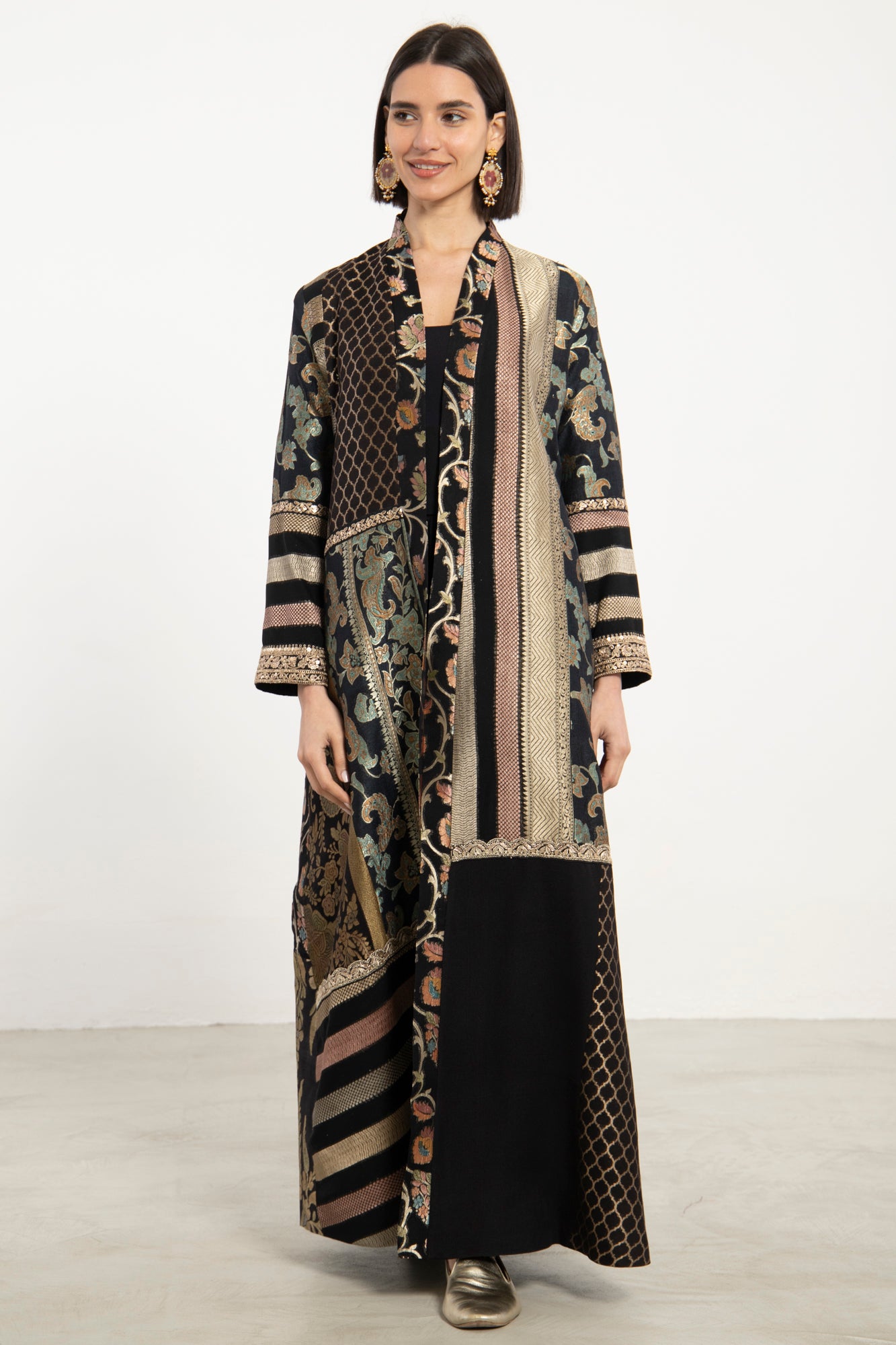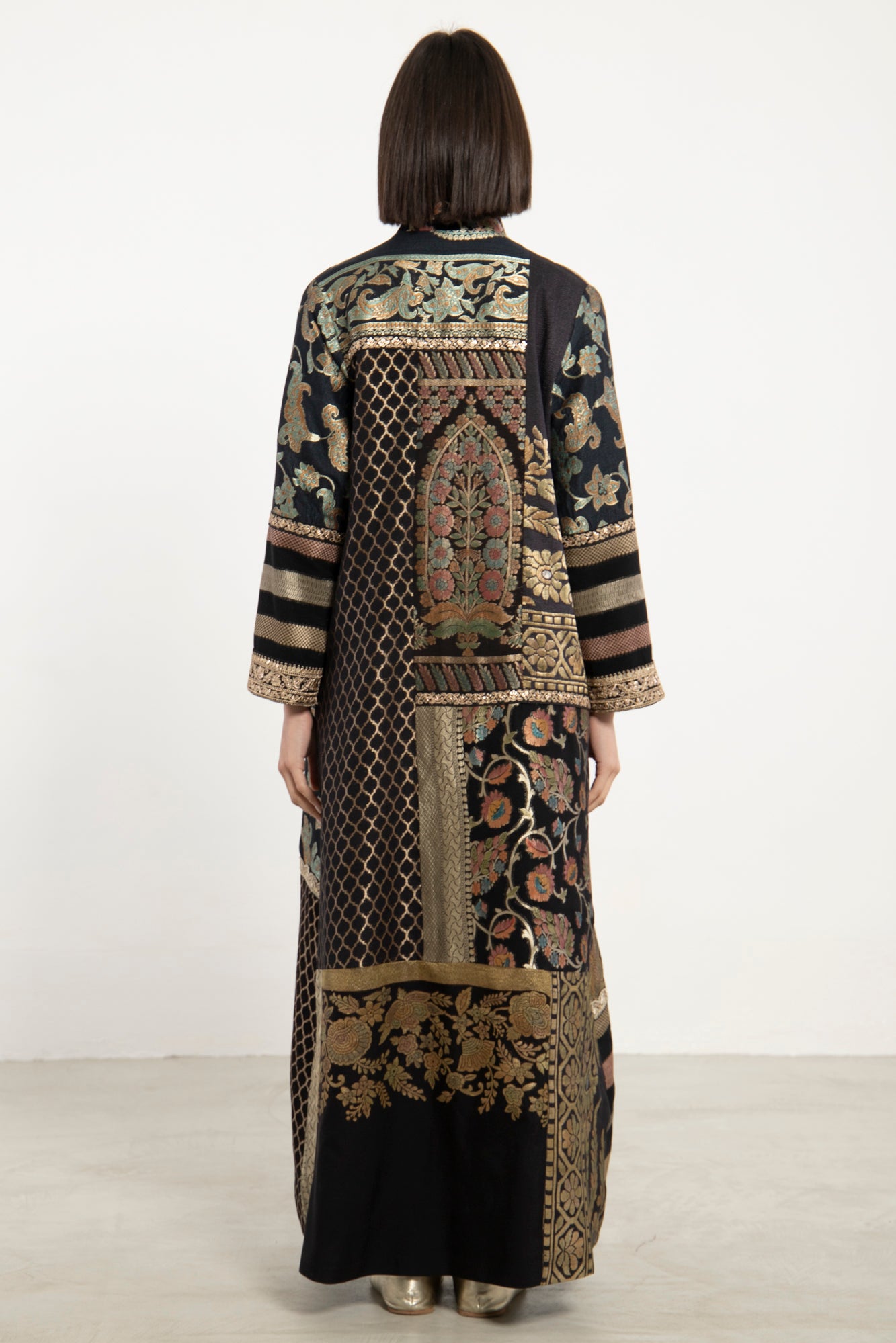 The Fayrouz Coat is a richly detailed piece combining panels of hand painted silk brocade and silk patchwork in a flowing, open-front silhouette. Embellished with intricate embroidery and metallic accents, it blends traditional craftsmanship with modern elegance.