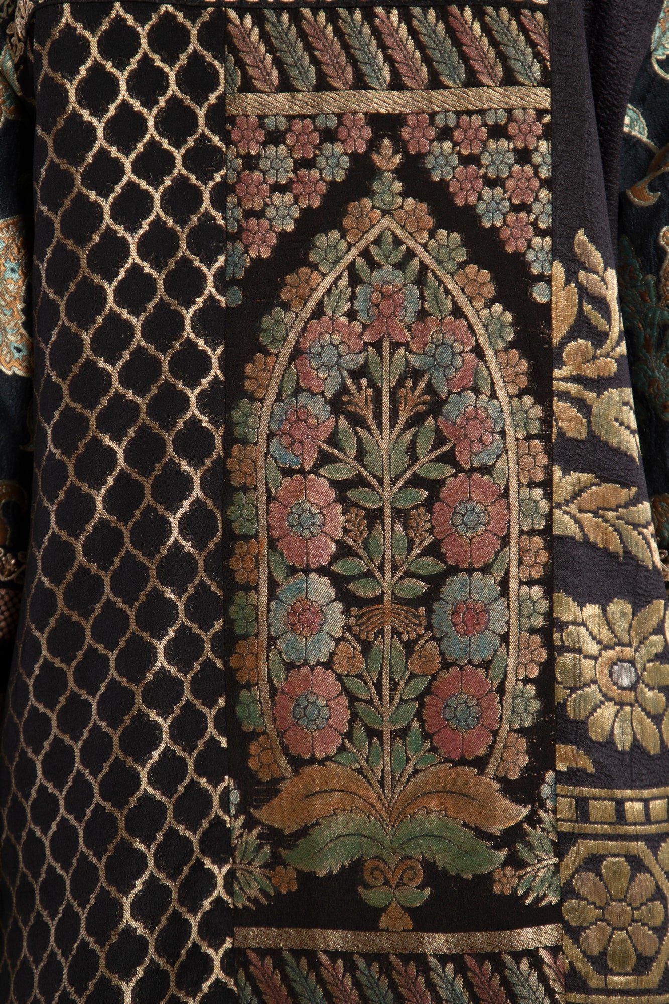 Details: Open-front coat crafted from mixed hand painted silk brocade and silk patchwork with embroidered and metallic detailing