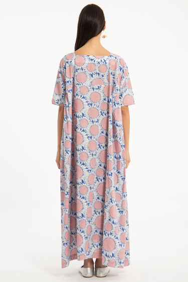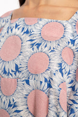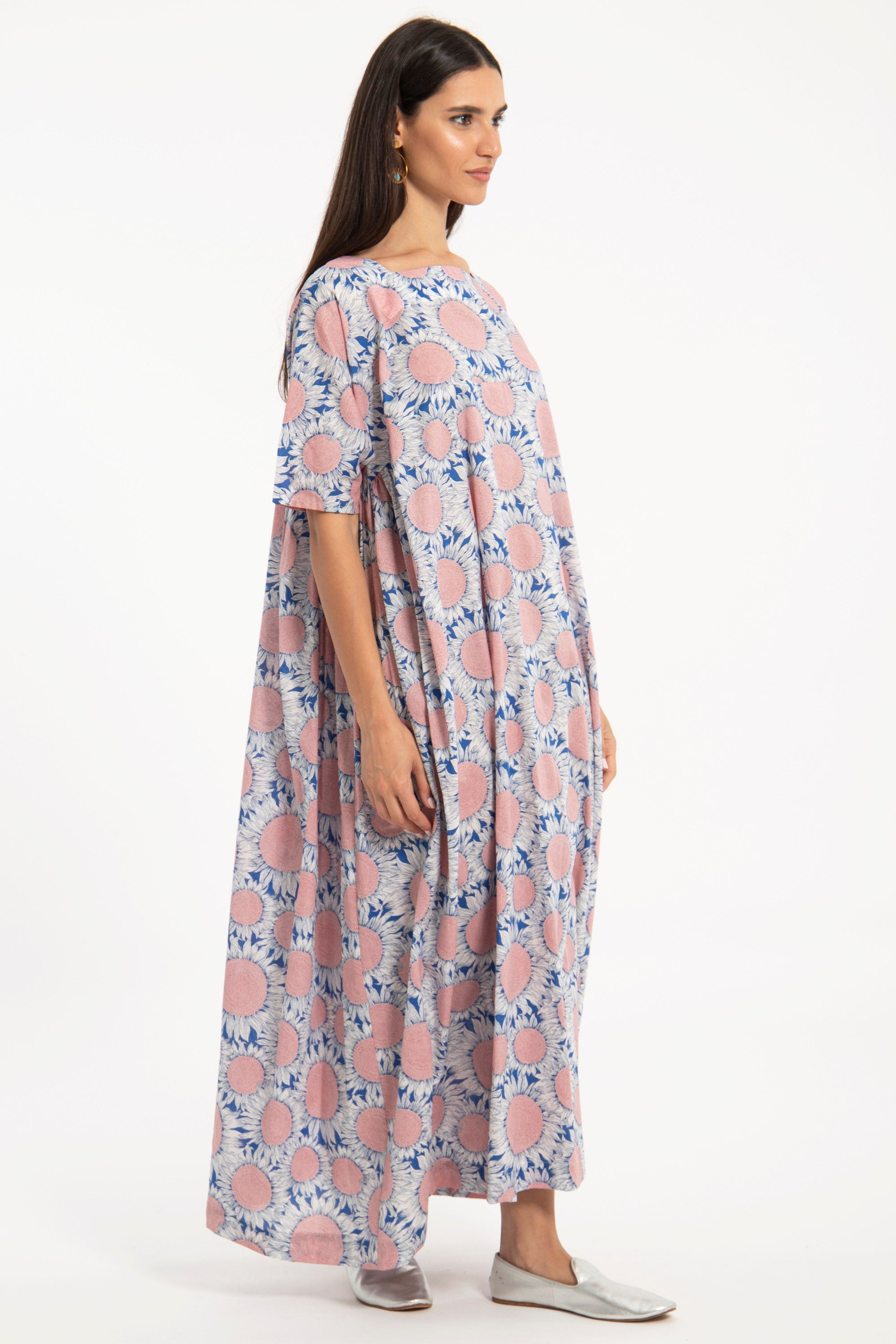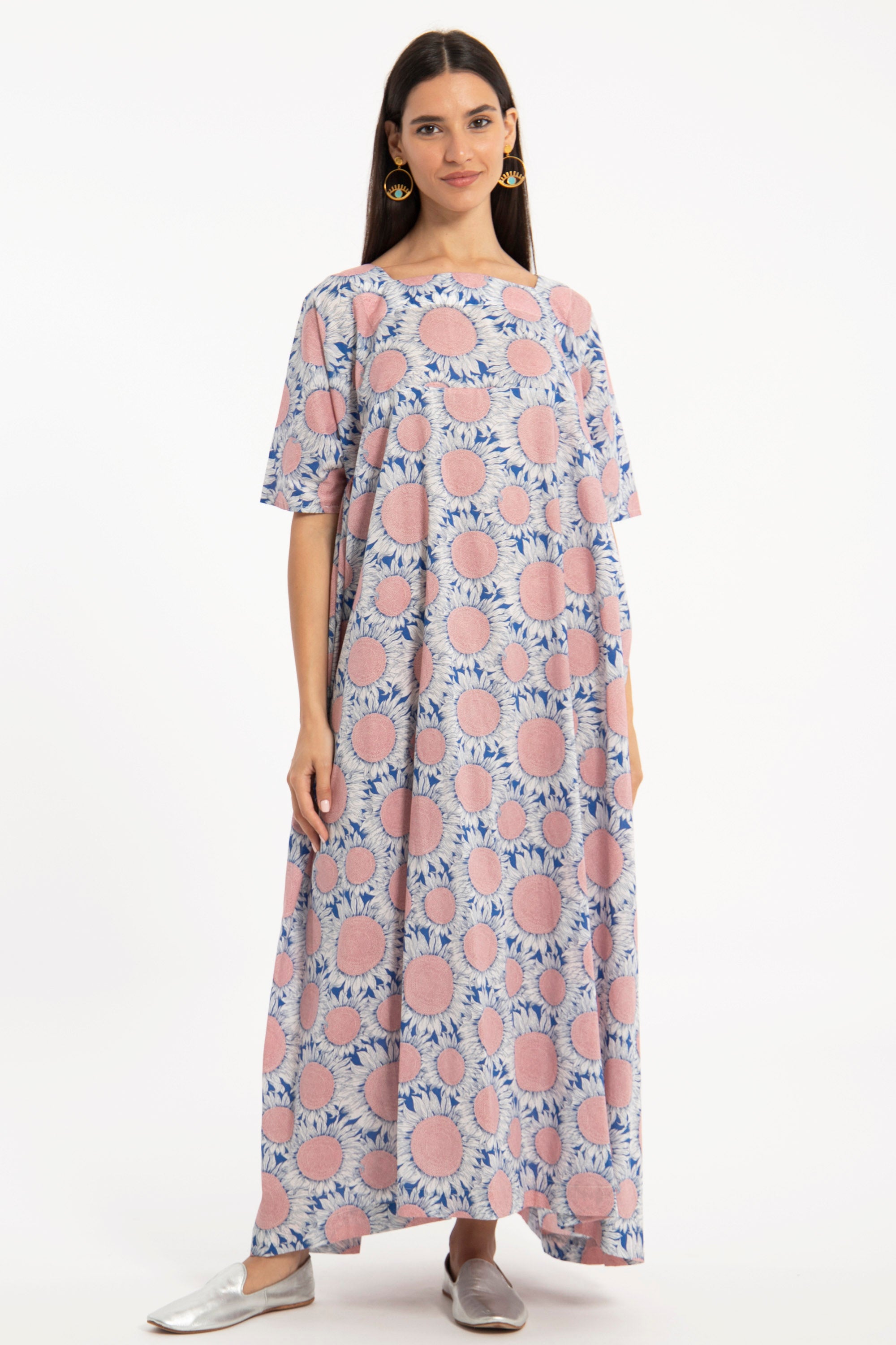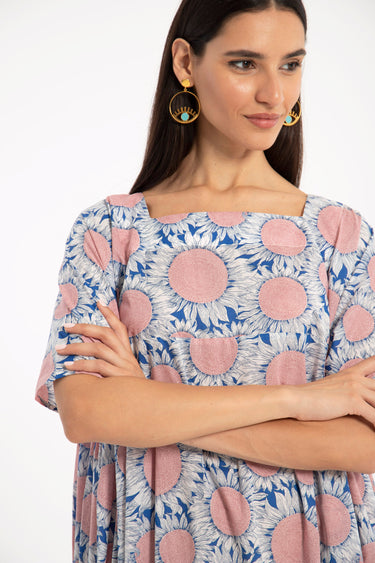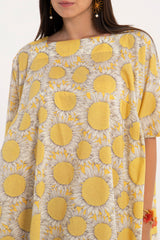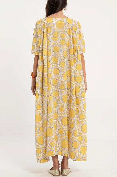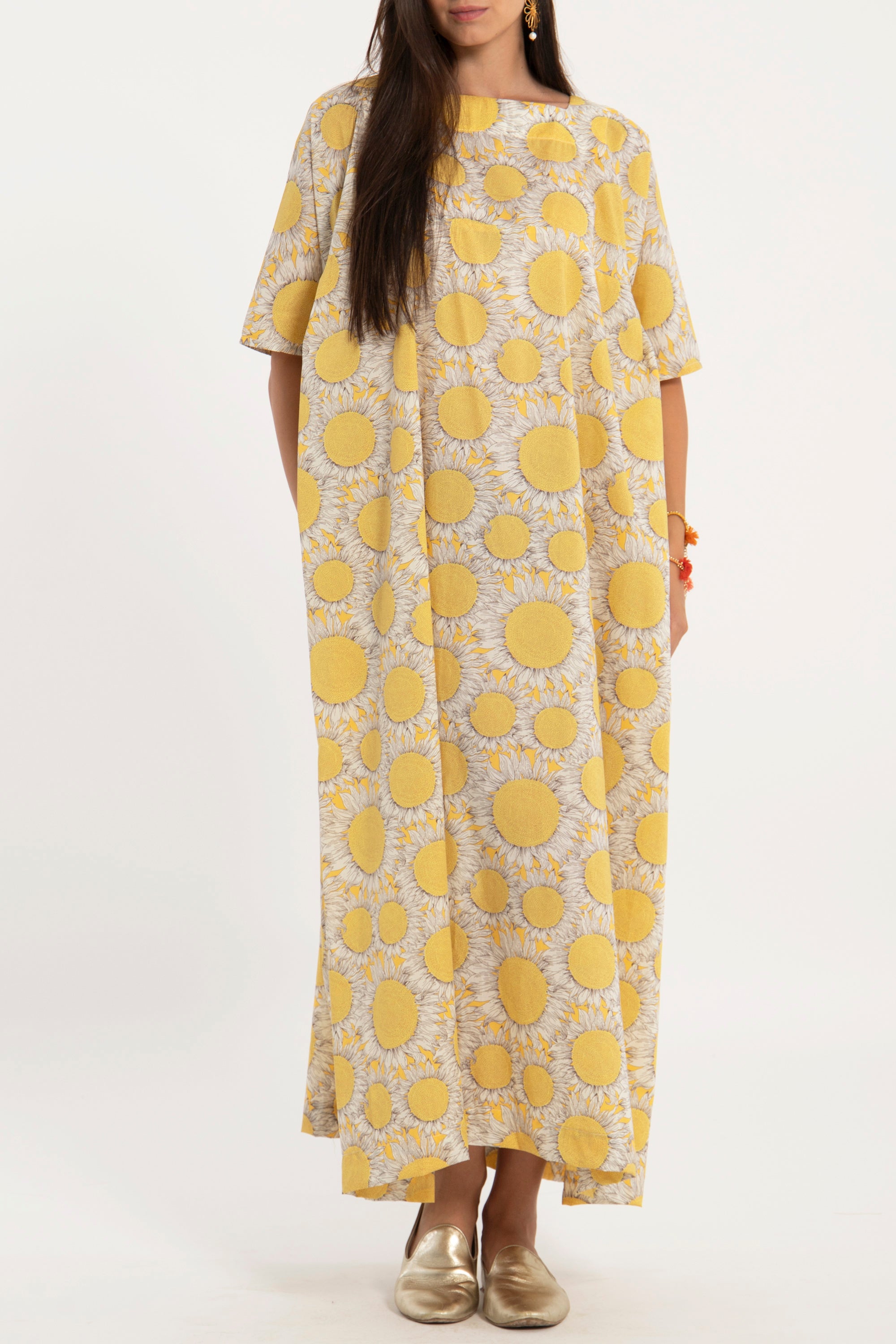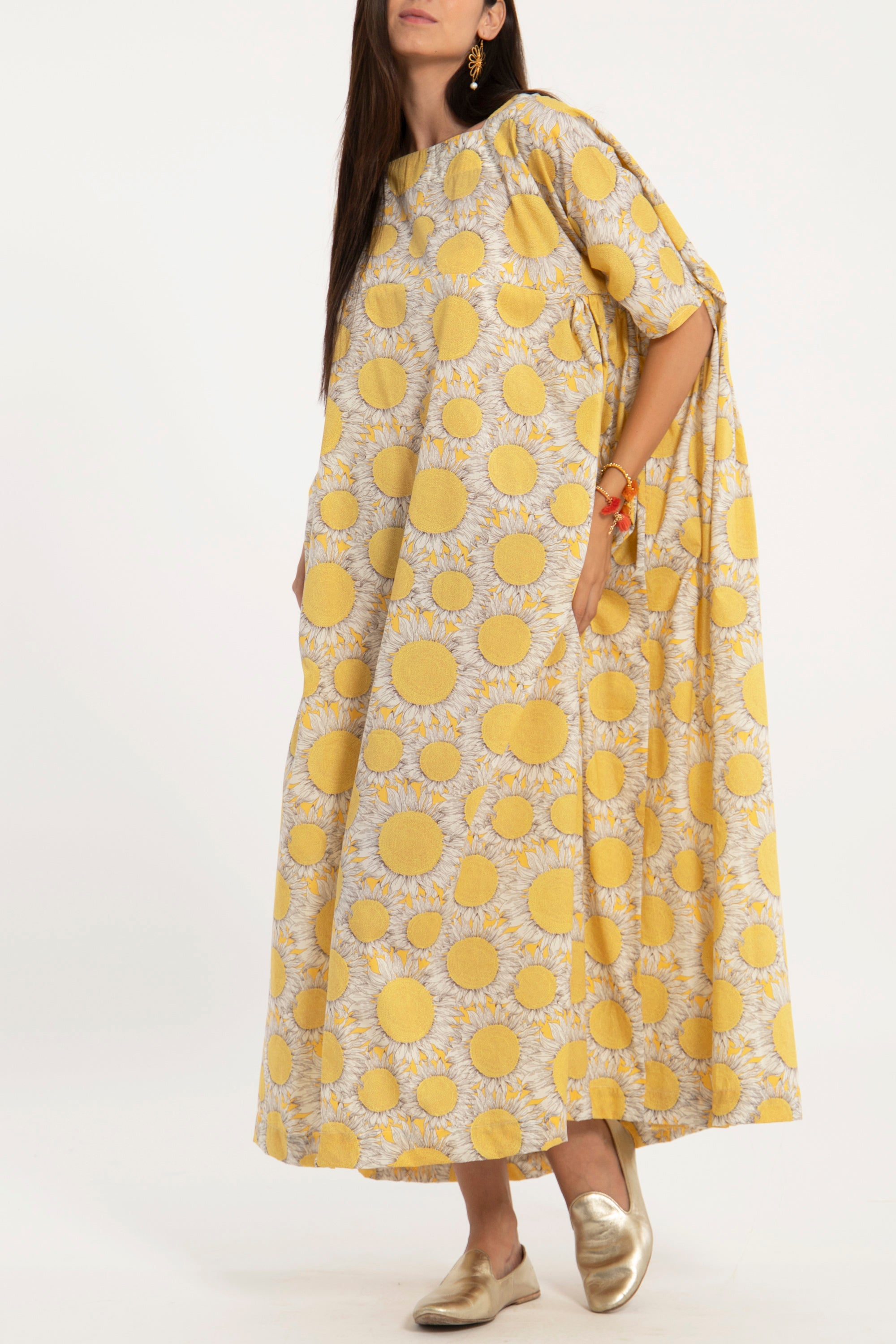 Crafted from pure Liberty cotton, this summer dress showcases a delicate yellow sunflower pattern all over. The thoughtfully designed silhouette accommodates various figures with its elegant one-size fit, offering both refinement and comfort.