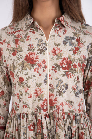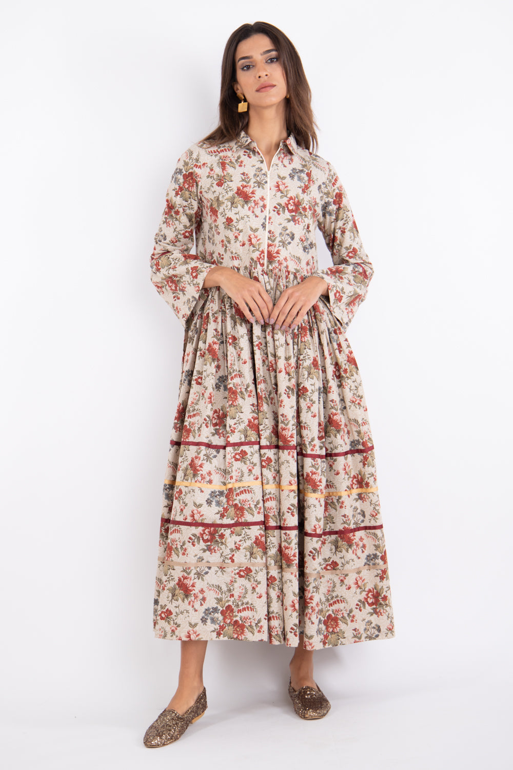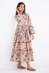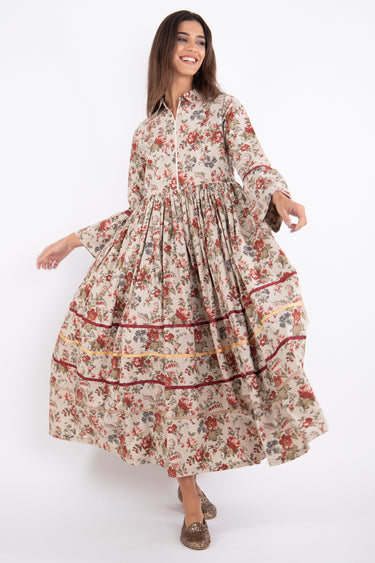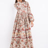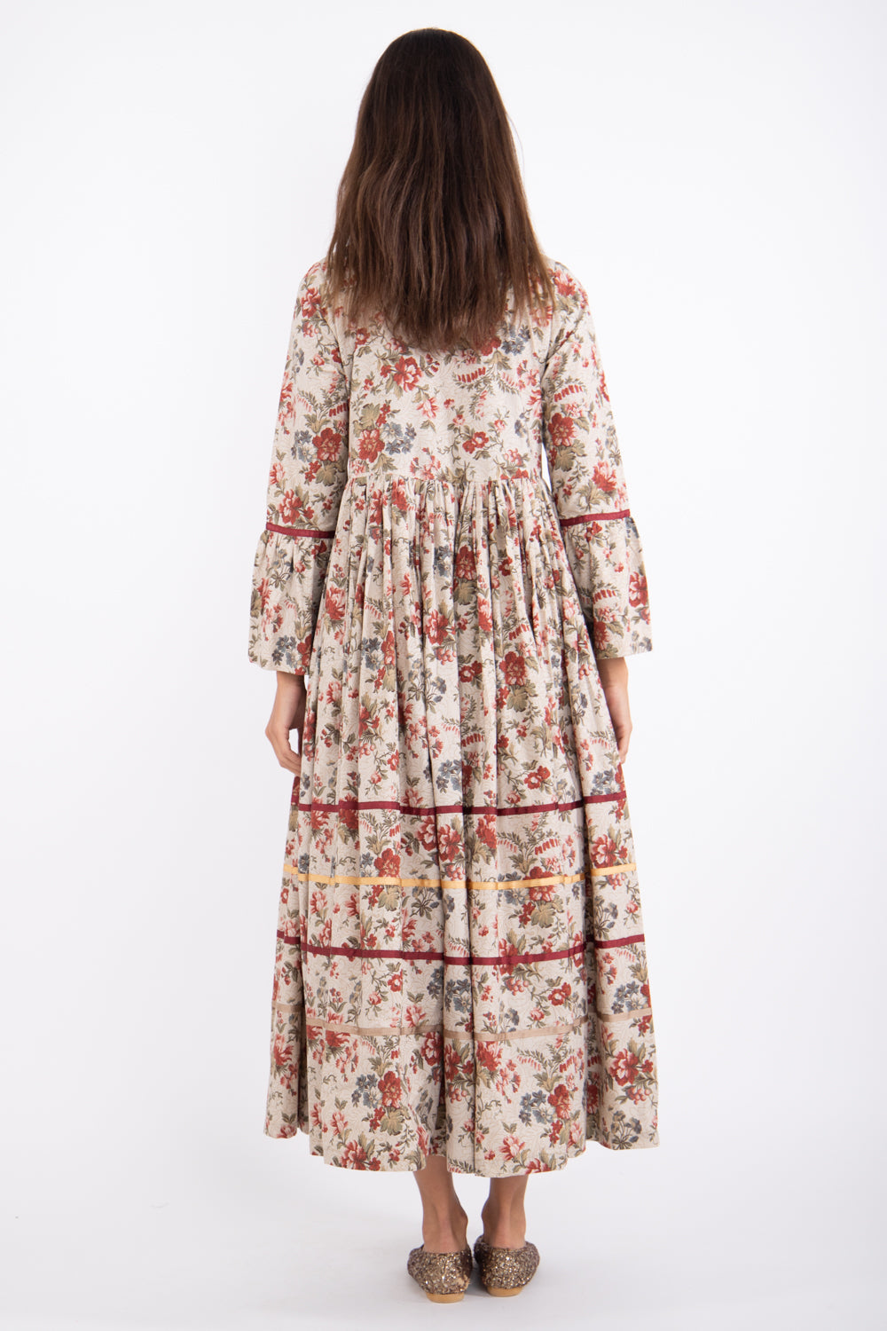 Indulge in the luxurious comfort of this maxi-length dress, crafted with a stunning patchwork of cotton and embellished with intricate floral prints.