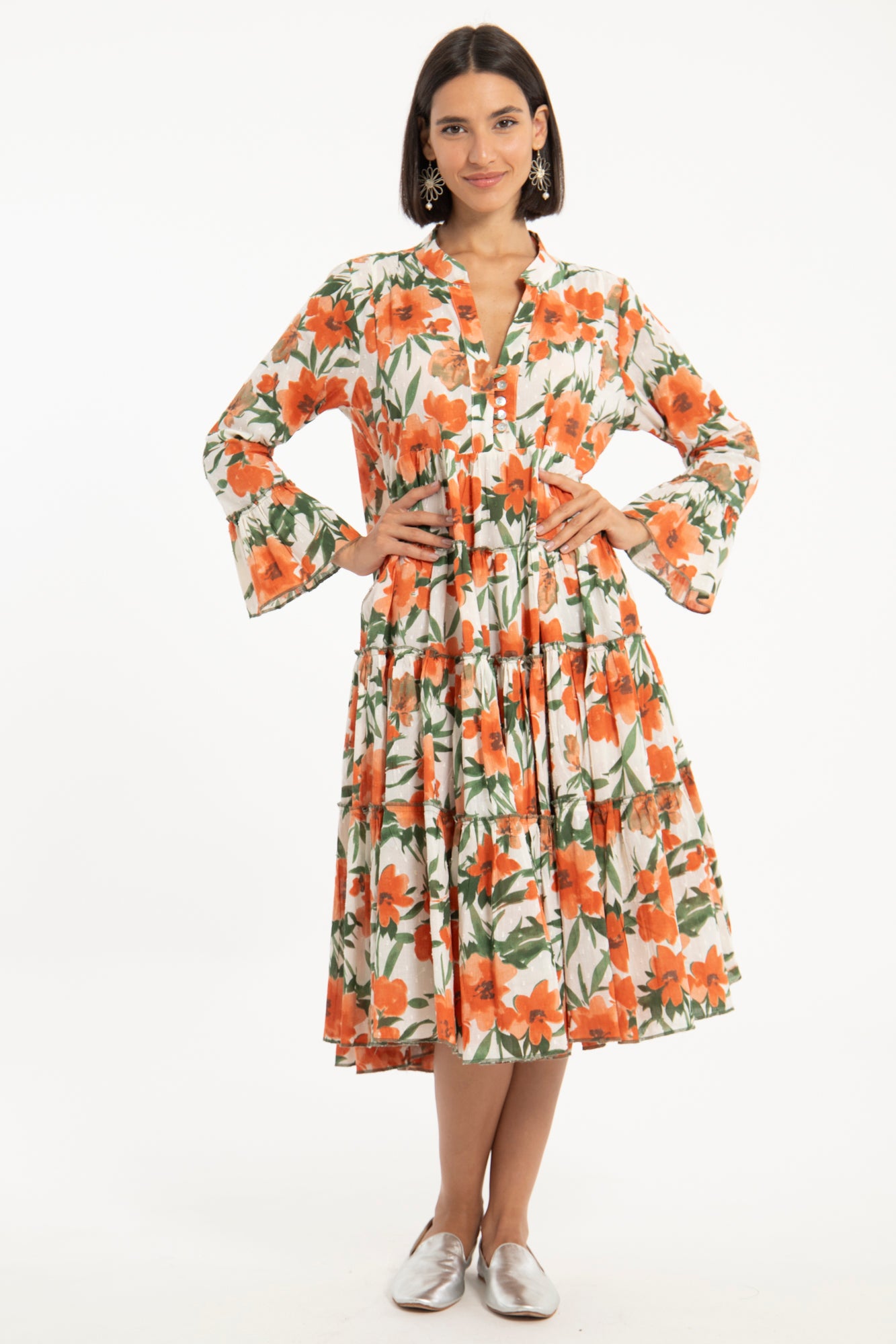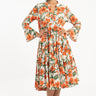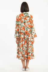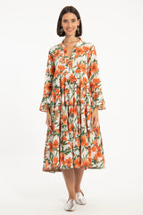 The Alima Dress is cut from pure cotton and features a vibrant floral print in bold orange and green tones. Designed with a tiered silhouette and flared sleeves, it offers fluid movement and a relaxed, feminine shape.