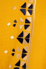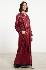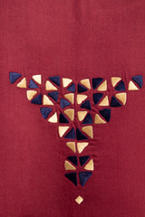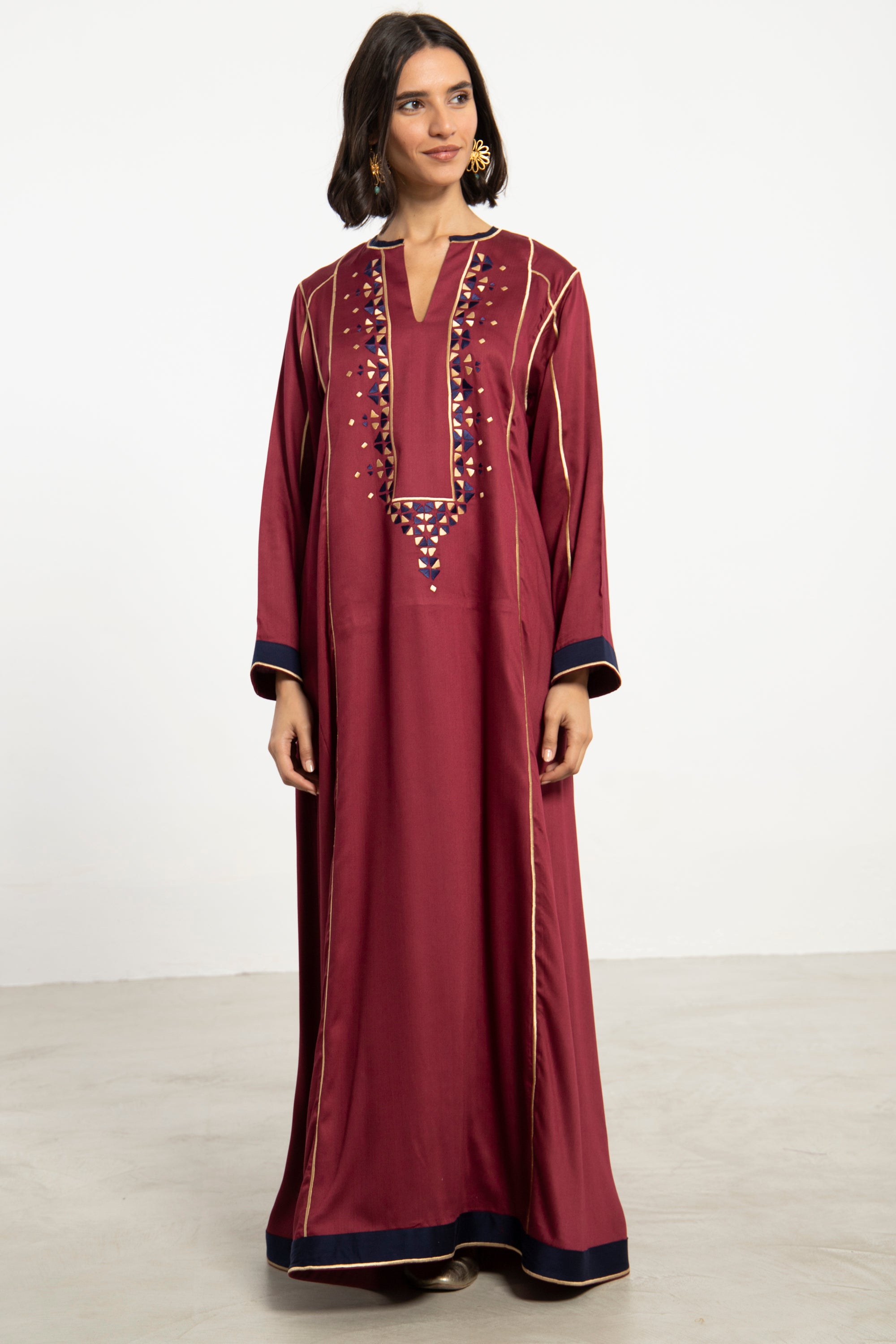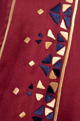 Details: Geometric embroidery at neckline, checkered trim on cuffs and hem, side piping