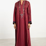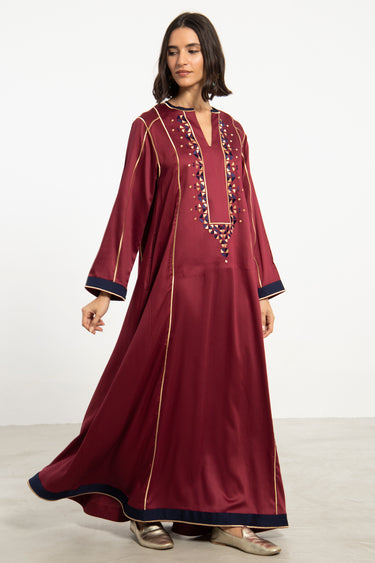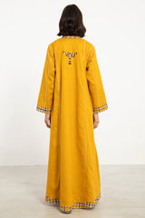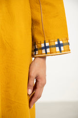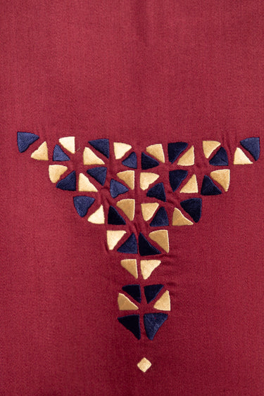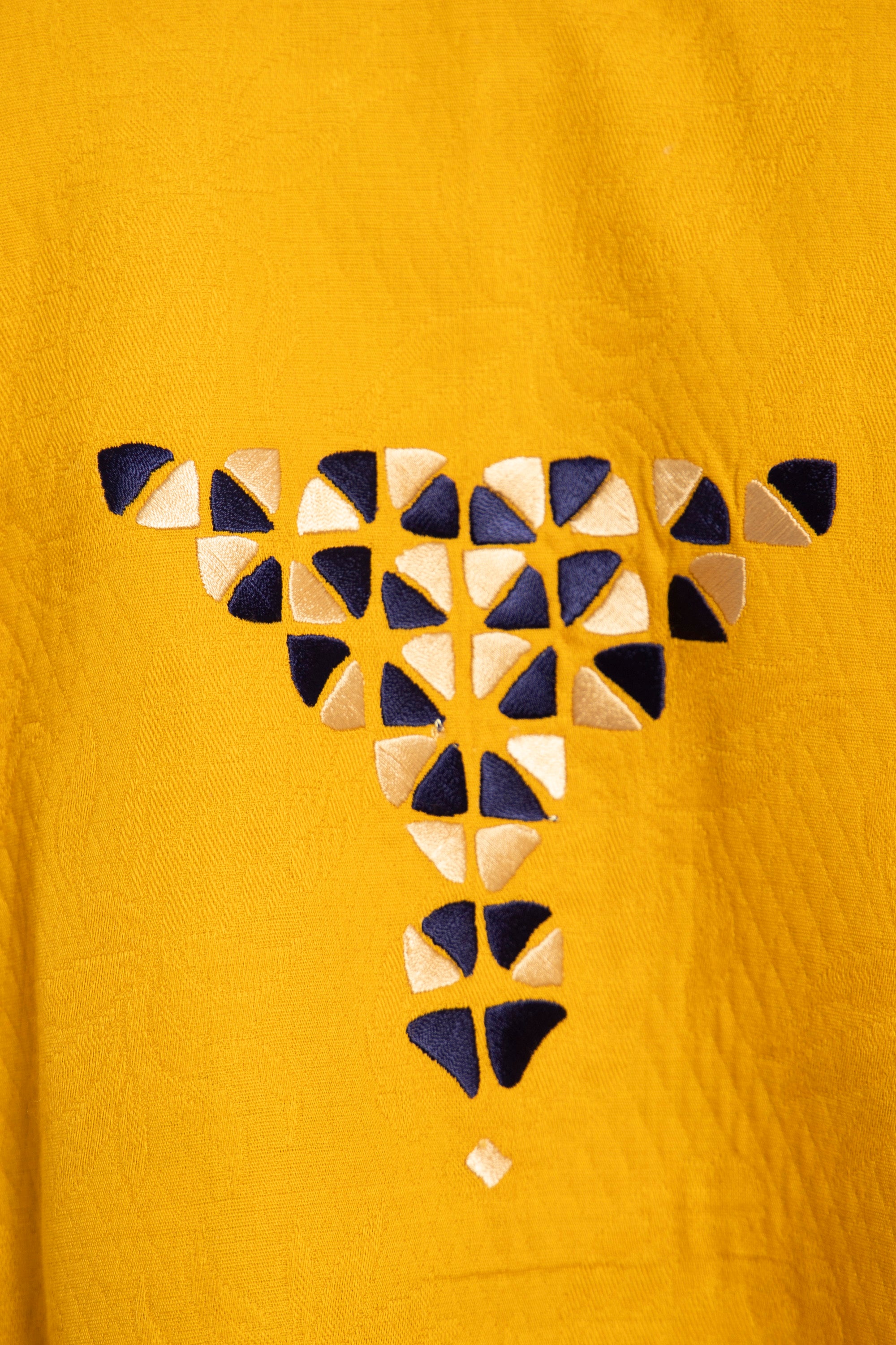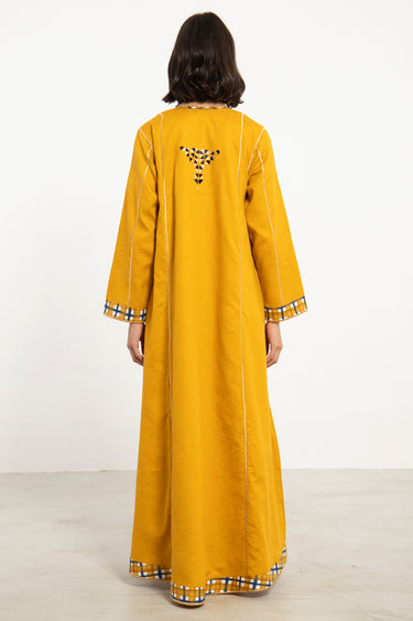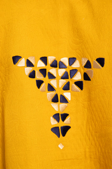 A statement piece in textured cotton jacquard, the Amani dress features intricate black geometric embroidery framing the neckline. Checkered trims at the cuffs and hem add a subtle contrast, enhancing its refined silhouette.