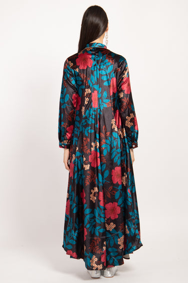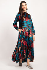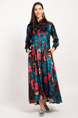 Indulge in the luxurious feel of our Velvet Navy Printed Dress adorned with vibrant blue and red flowers.