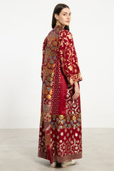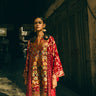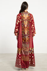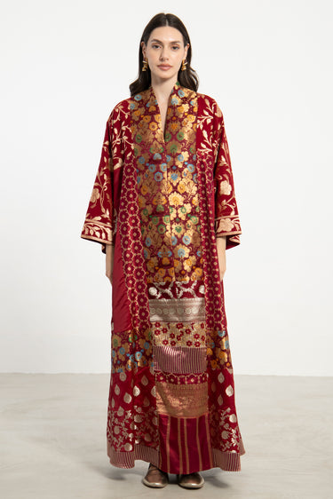 A striking statement piece, the Chouf dress showcases a meticulous patchwork of silk brocade in intricate gold and red motifs. The relaxed silhouette and flowing lines offer both elegance and ease.
