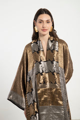 Details: Open front, wide sleeves, mixed metallic silk patchwork, geometric and abstract motifs