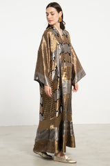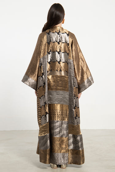 The Chouf Dress is an artful composition of handwoven silk panels in metallic gold, bronze, and silver tones. With wide sleeves and an open silhouette, this patchwork piece balances contemporary abstraction with traditional craftsmanship.