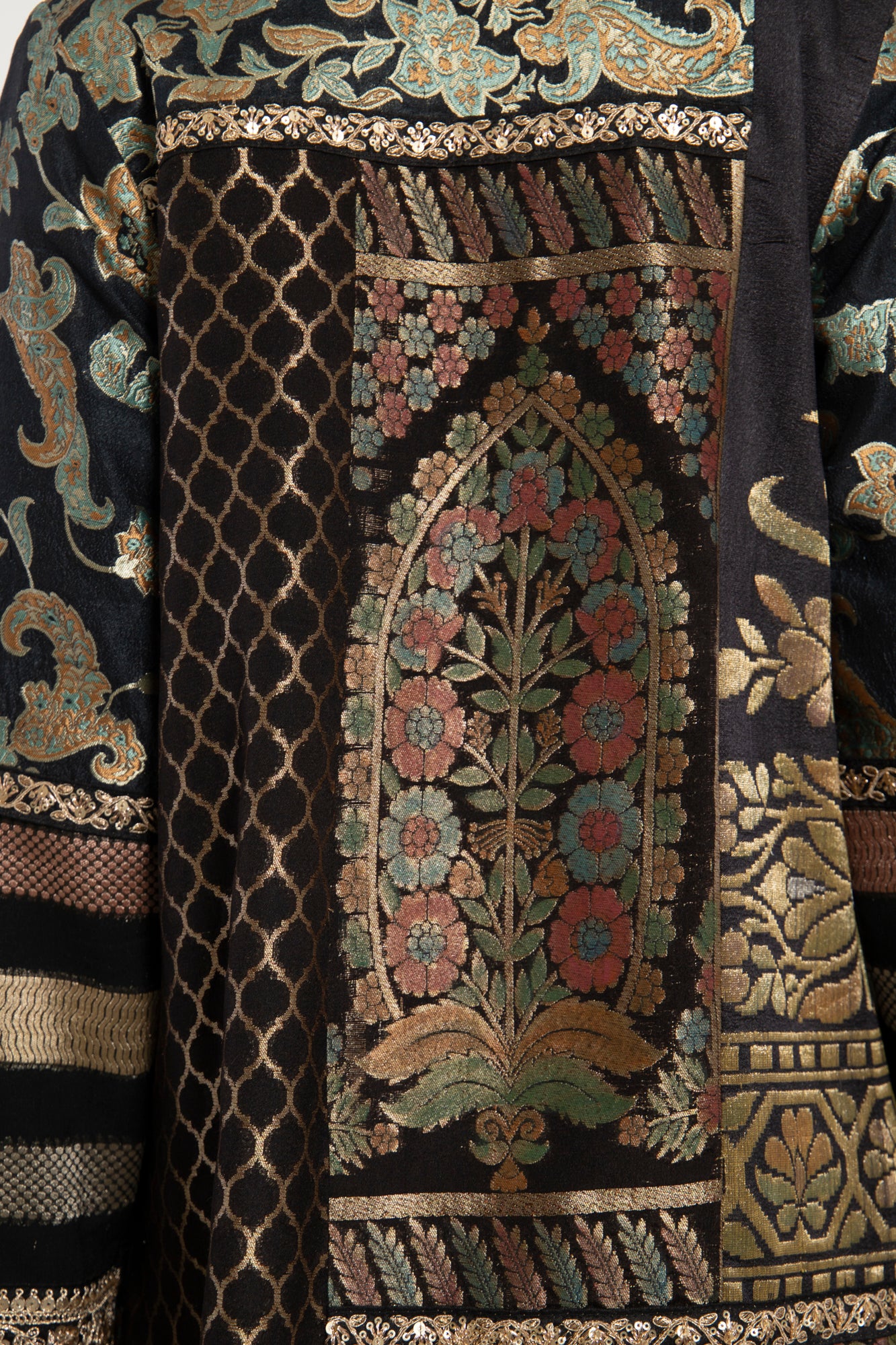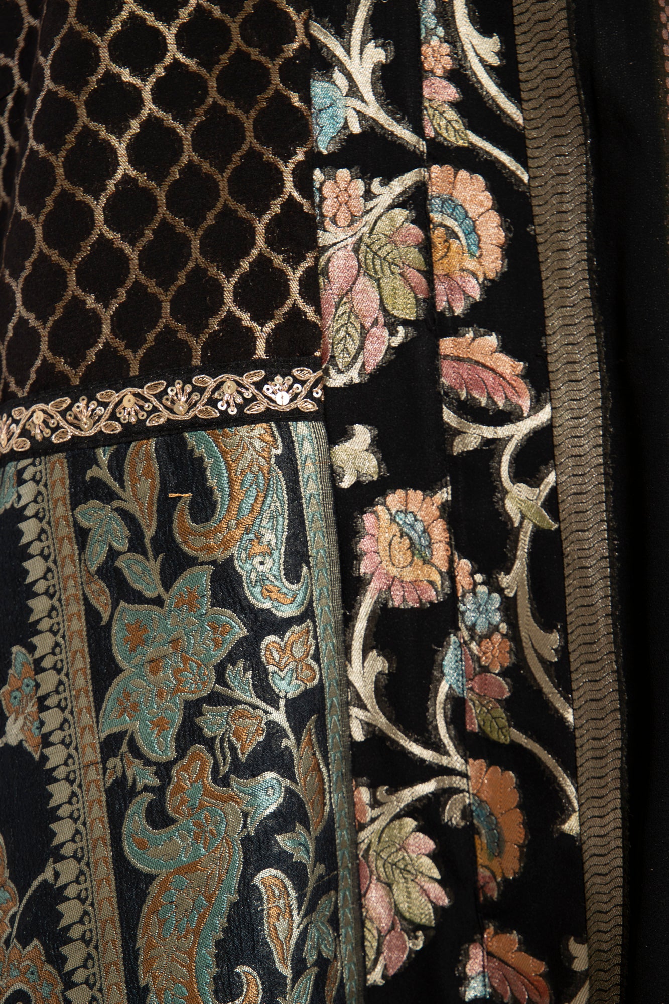 Details: Dress crafted from mixed hand painted silk brocade and silk patchwork with embroidered and metallic detailing