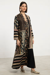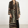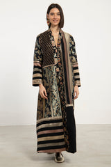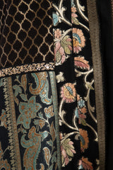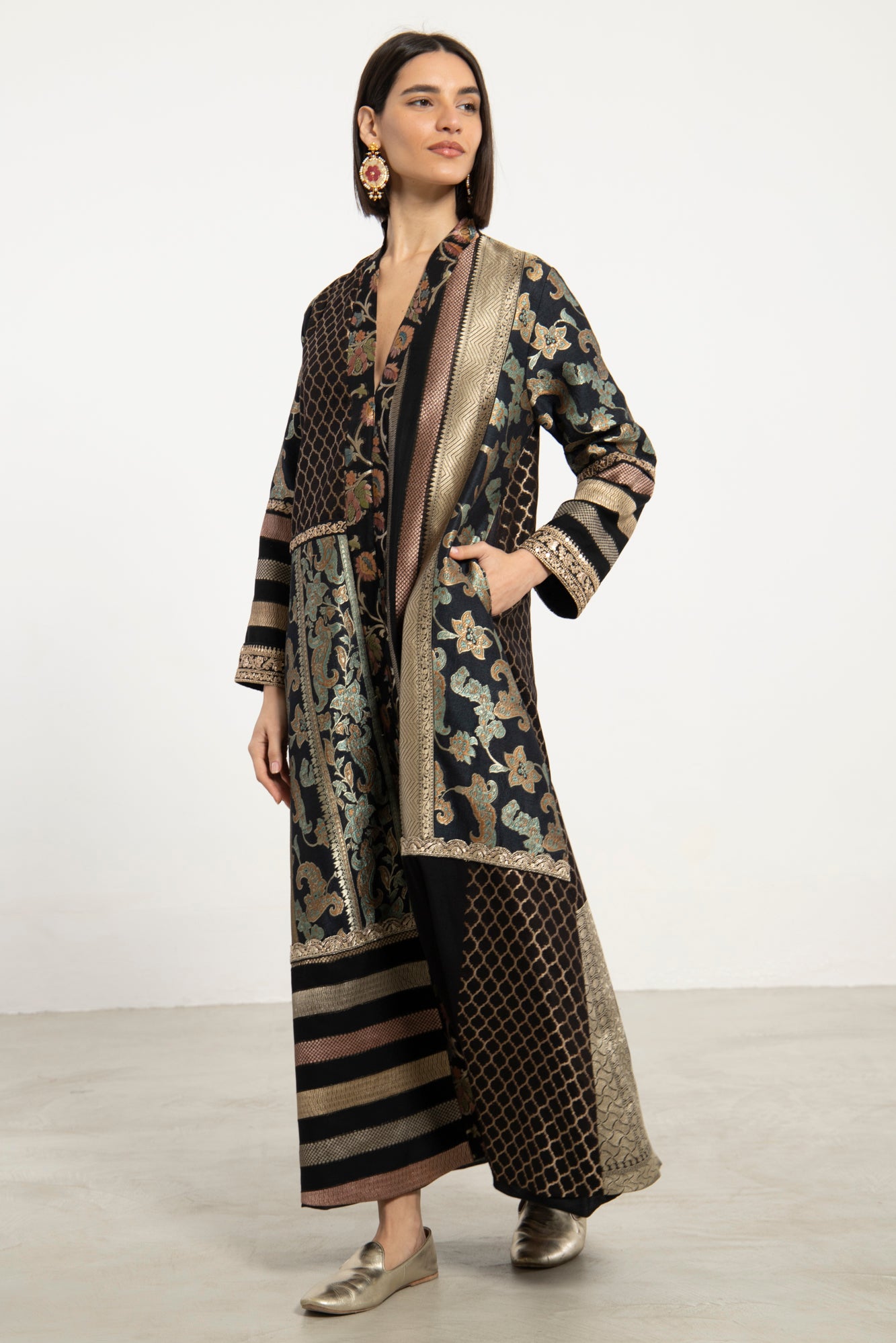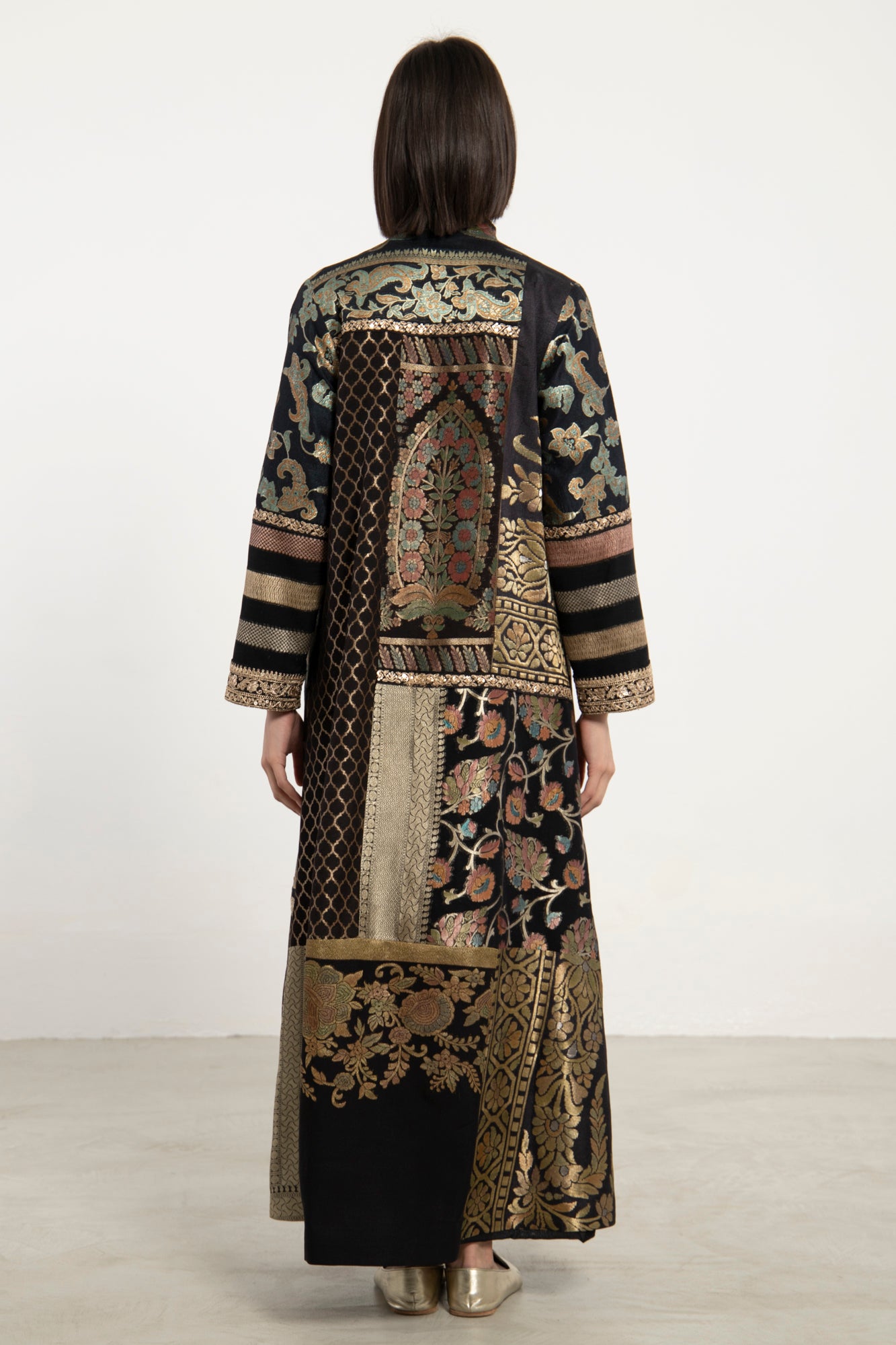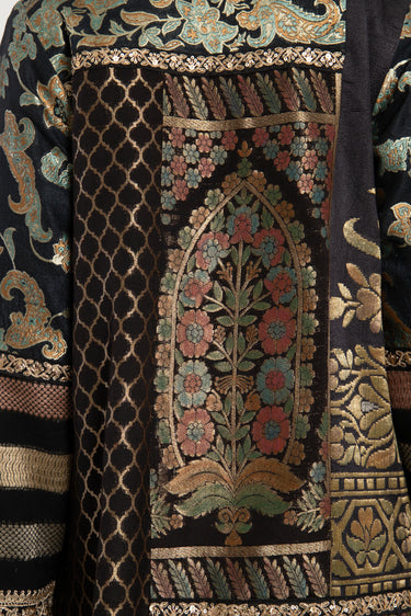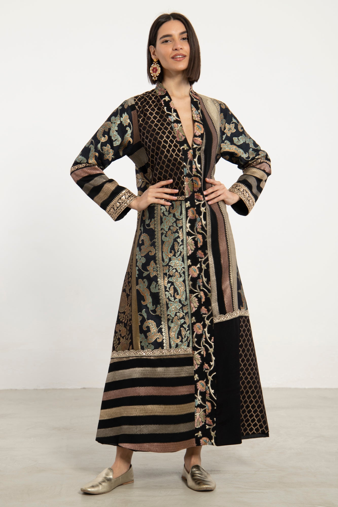 The Fayrouz Dress is a richly detailed piece combining panels of hand painted silk brocade and silk patchwork in a flowing silhouette. Embellished with intricate embroidery and metallic accents, it blends traditional craftsmanship with modern elegance.