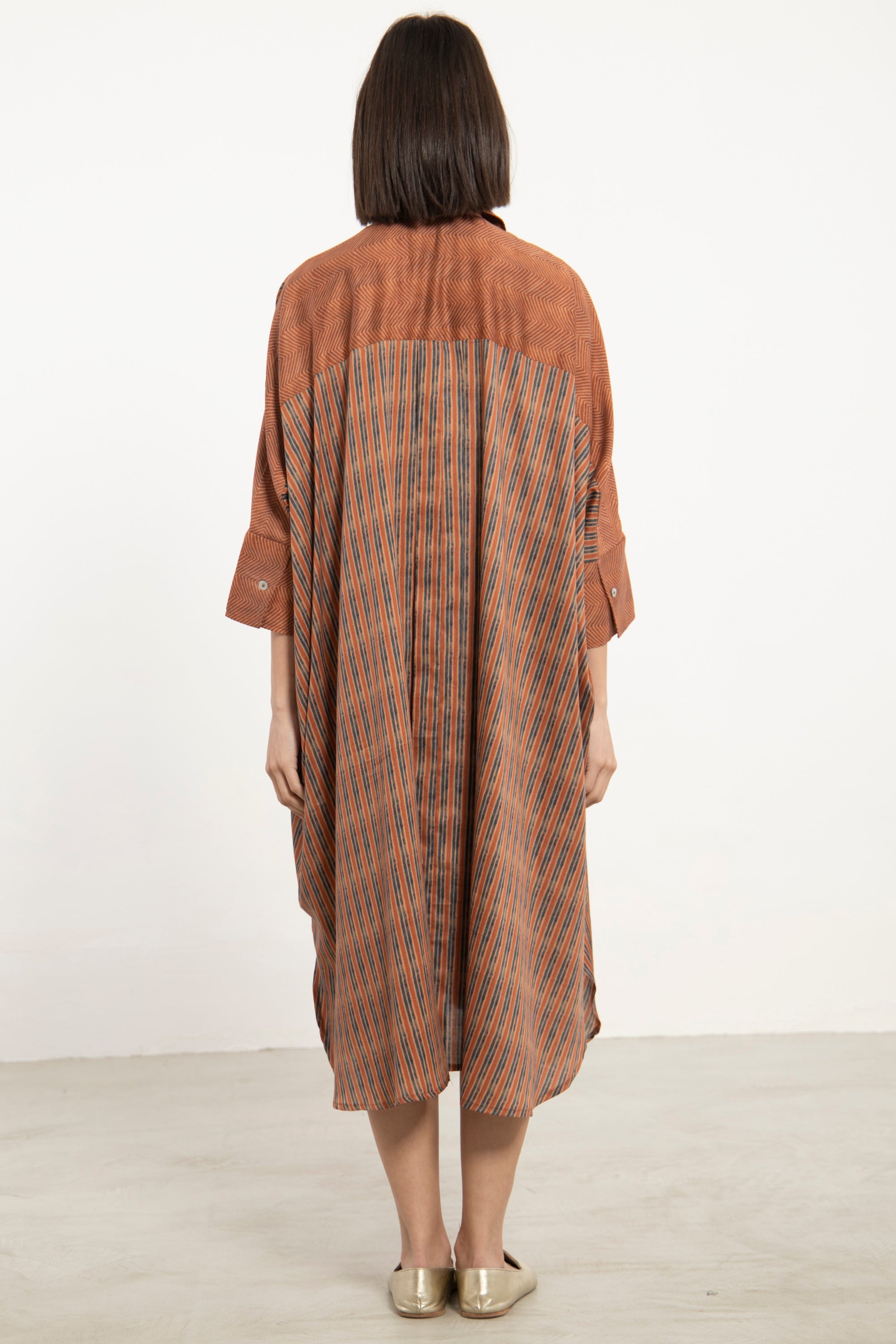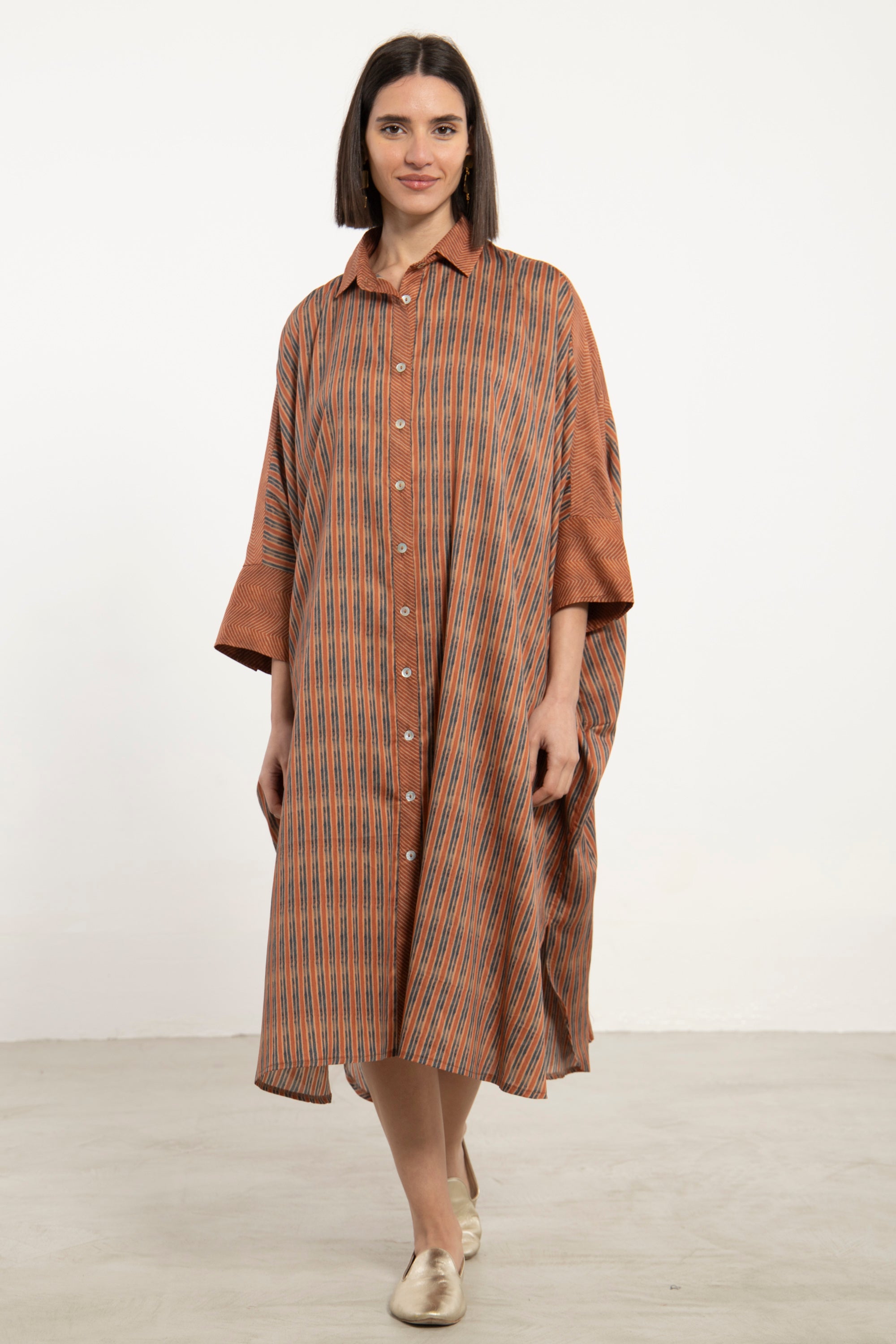 Details: Midi shirt dress with front button closure, structured collar, wide sleeves, and subtle woven pattern