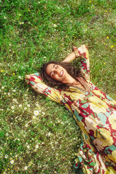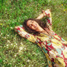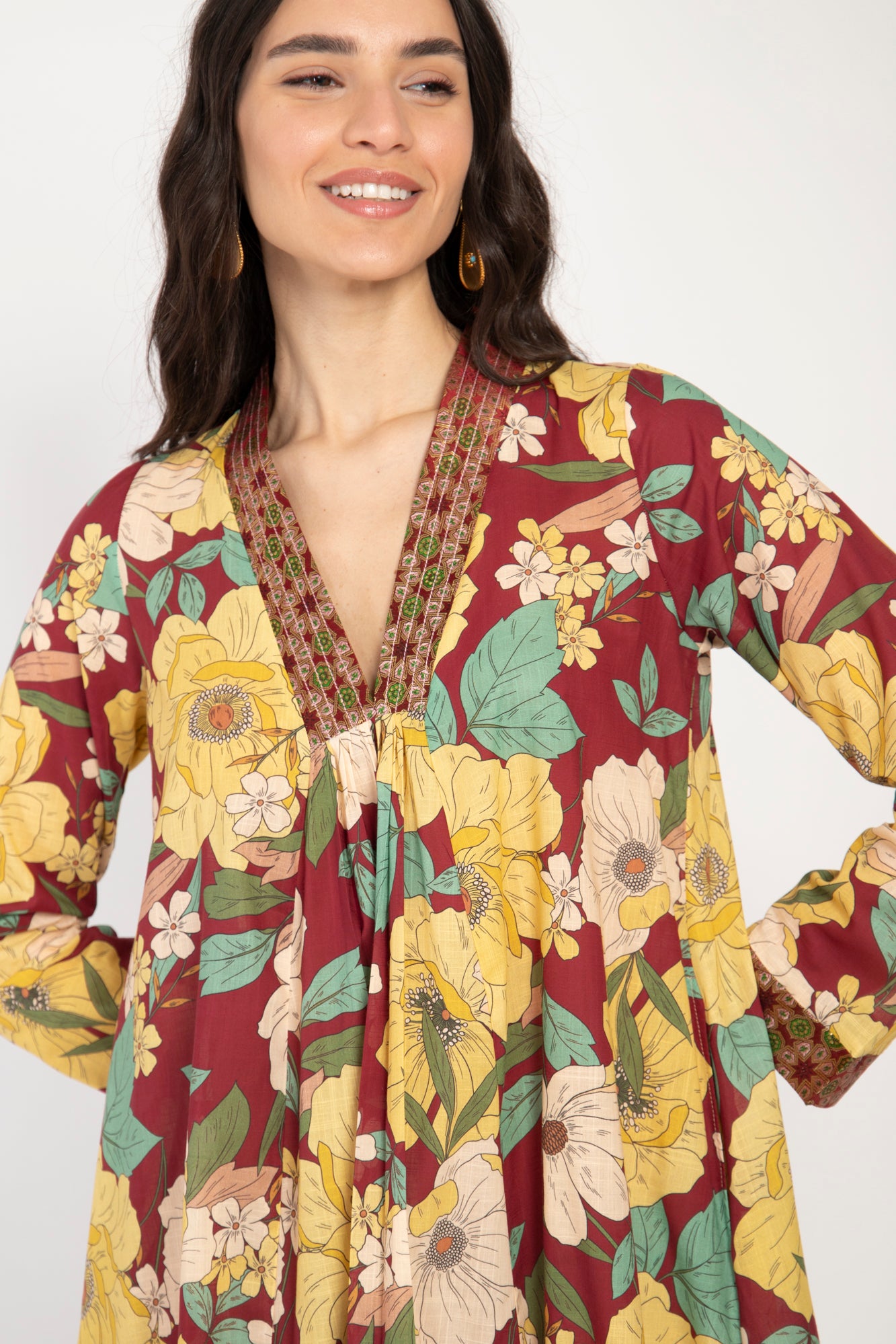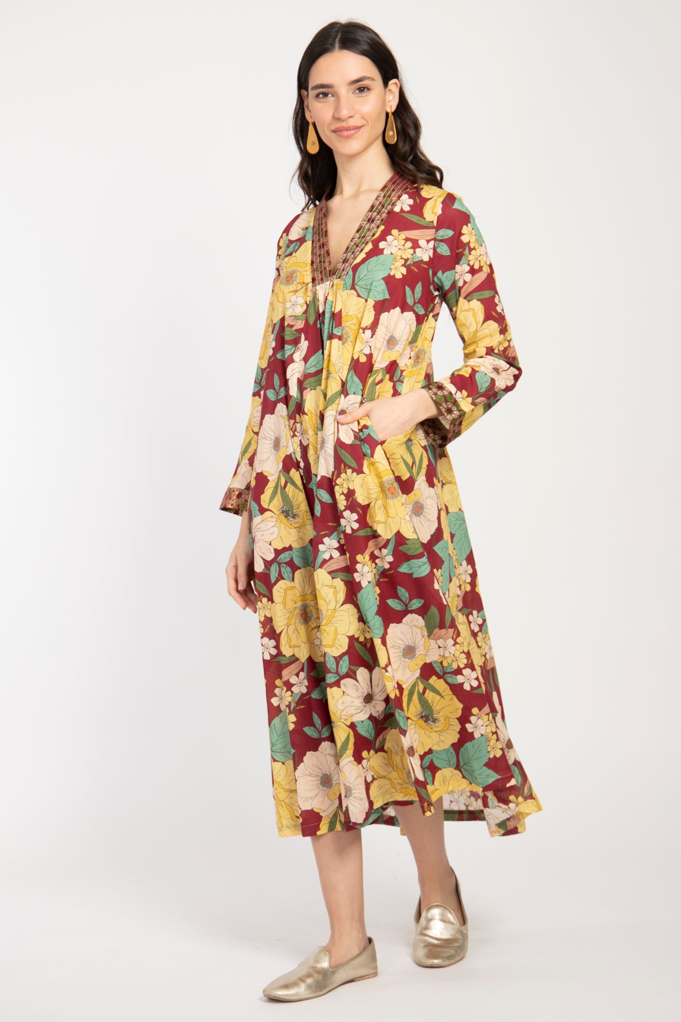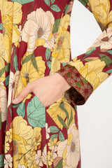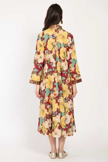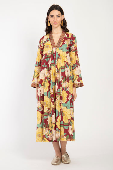This lightweight dress is made from the softest cotton with floral patterns and a silk brocade neckline.