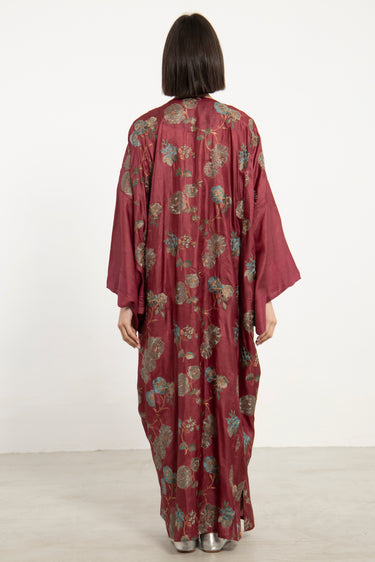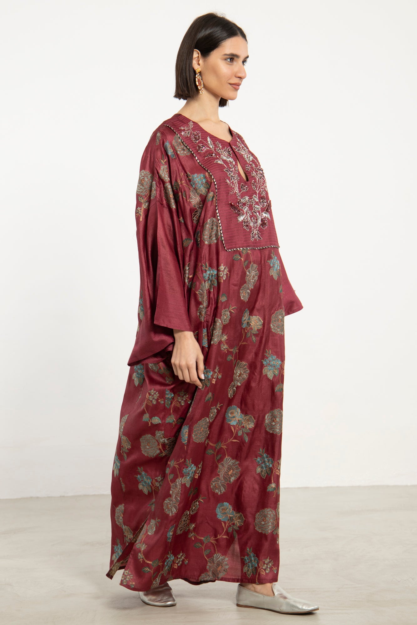 The Kawthar Dress is crafted from burgundy silk dupioni with a delicate floral print and adorned with intricate hand embroidery in sequins and thread. Its relaxed silhouette and embellished chest panel highlight both texture and craftsmanship.