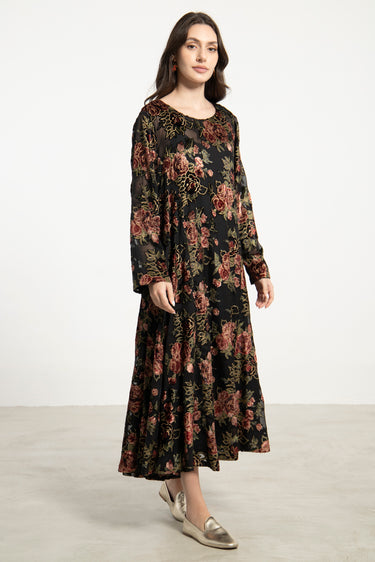 A flowing silhouette meets intricate floral velvet devoré in the Khayal Dress, offering a romantic yet effortless elegance.