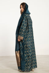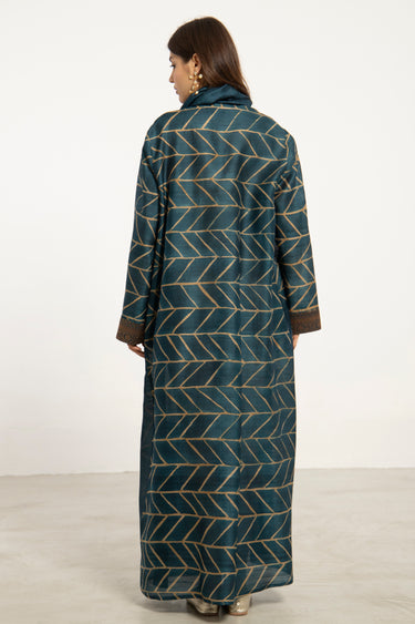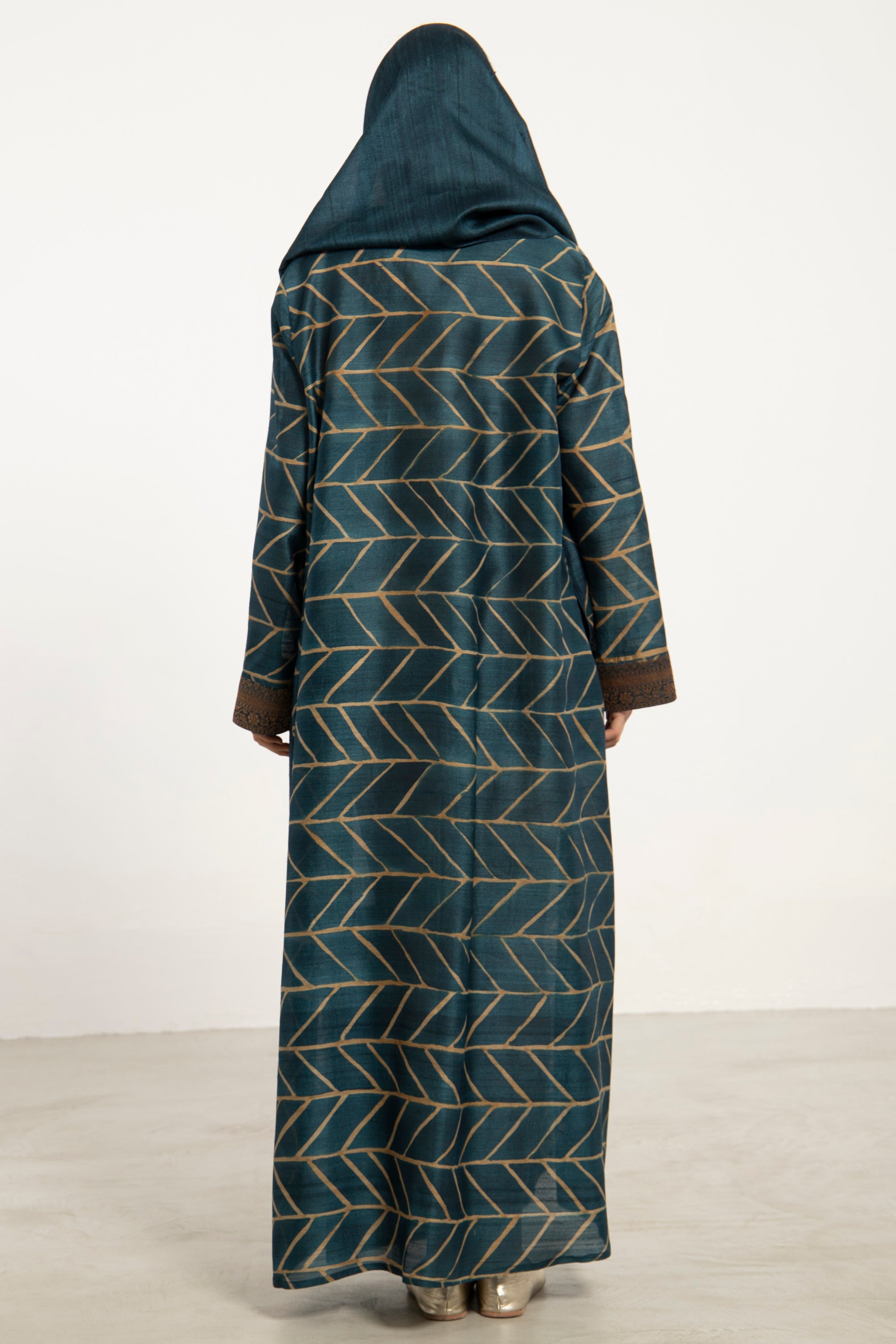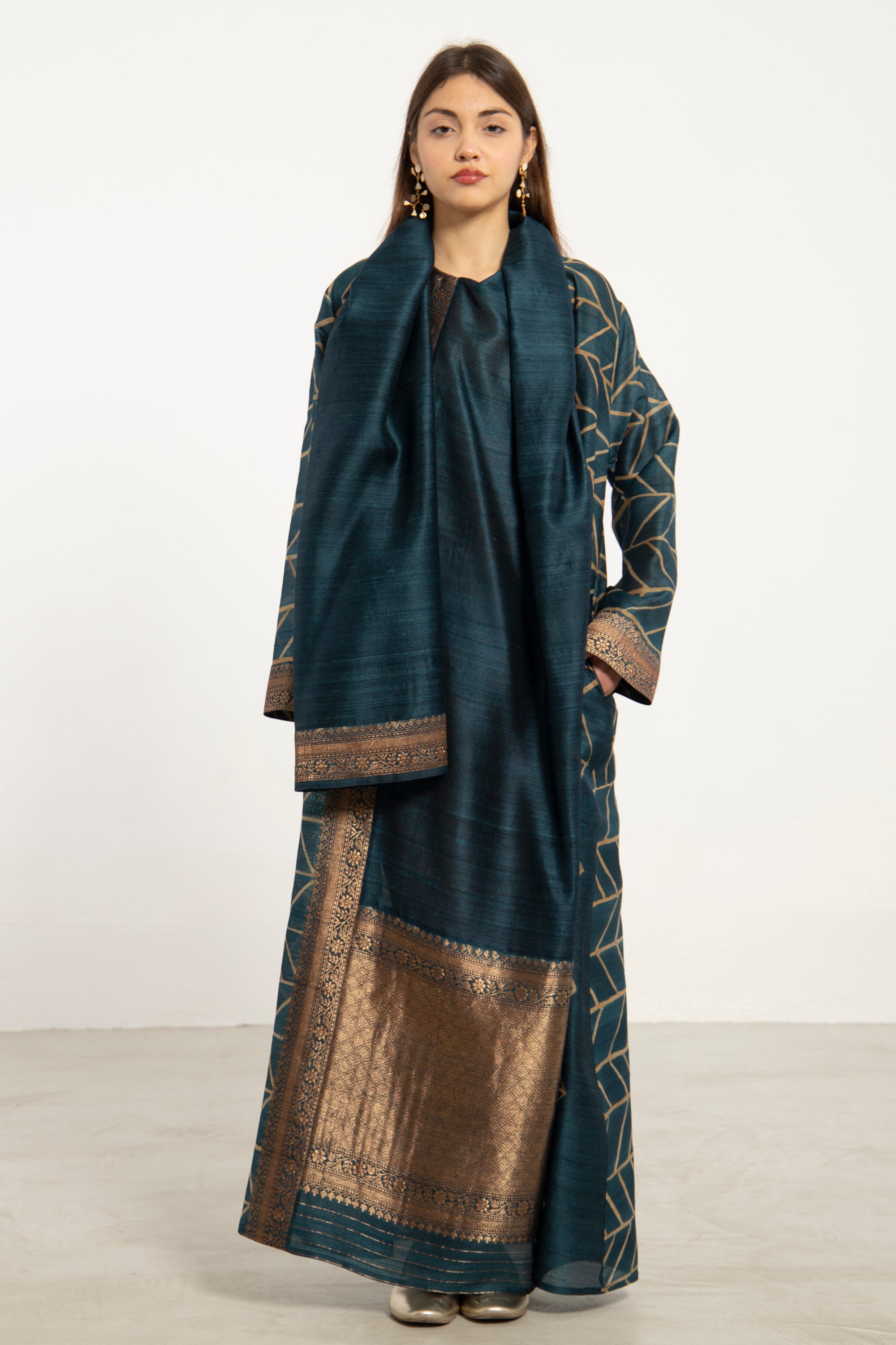 A one-of-a-kind elegant silhouette crafted from pure handwoven silk, this dress features an attached scarf that offers versatile styling—drape it over the shoulders, knot it at the neck, or wear it as a headscarf for a refined finish.