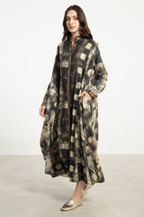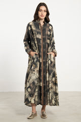 The Marwa Dress features a soft cotton fabric in an abstract plaid print, blending earthy tones with modern ease. Designed with a stand collar and subtle pleats, this relaxed silhouette is both effortless and refined.