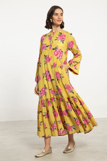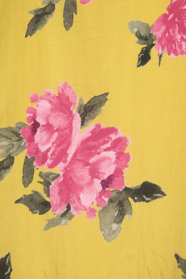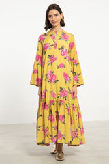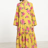 Bright and breezy, the May dress in cotton features a vivid yellow base adorned with handpainted-style pink florals. The flowing shape and gathered tier add movement and charm to this easy, feminine silhouette.