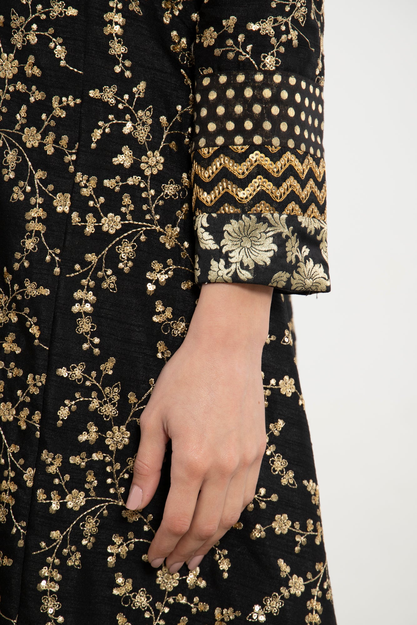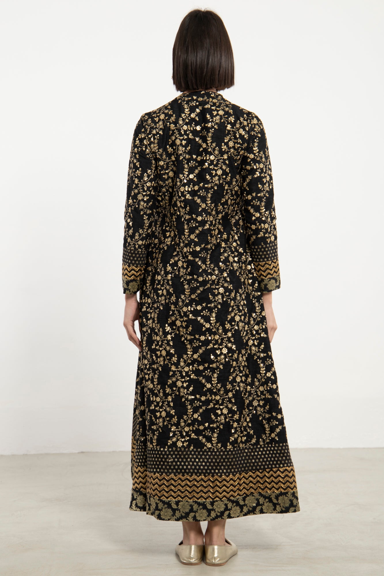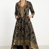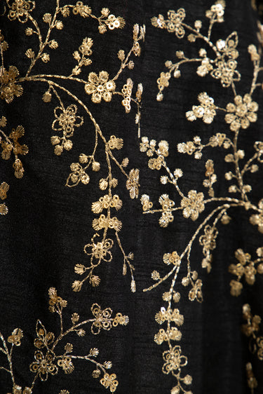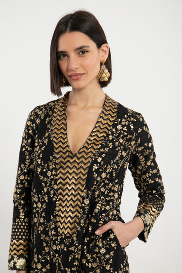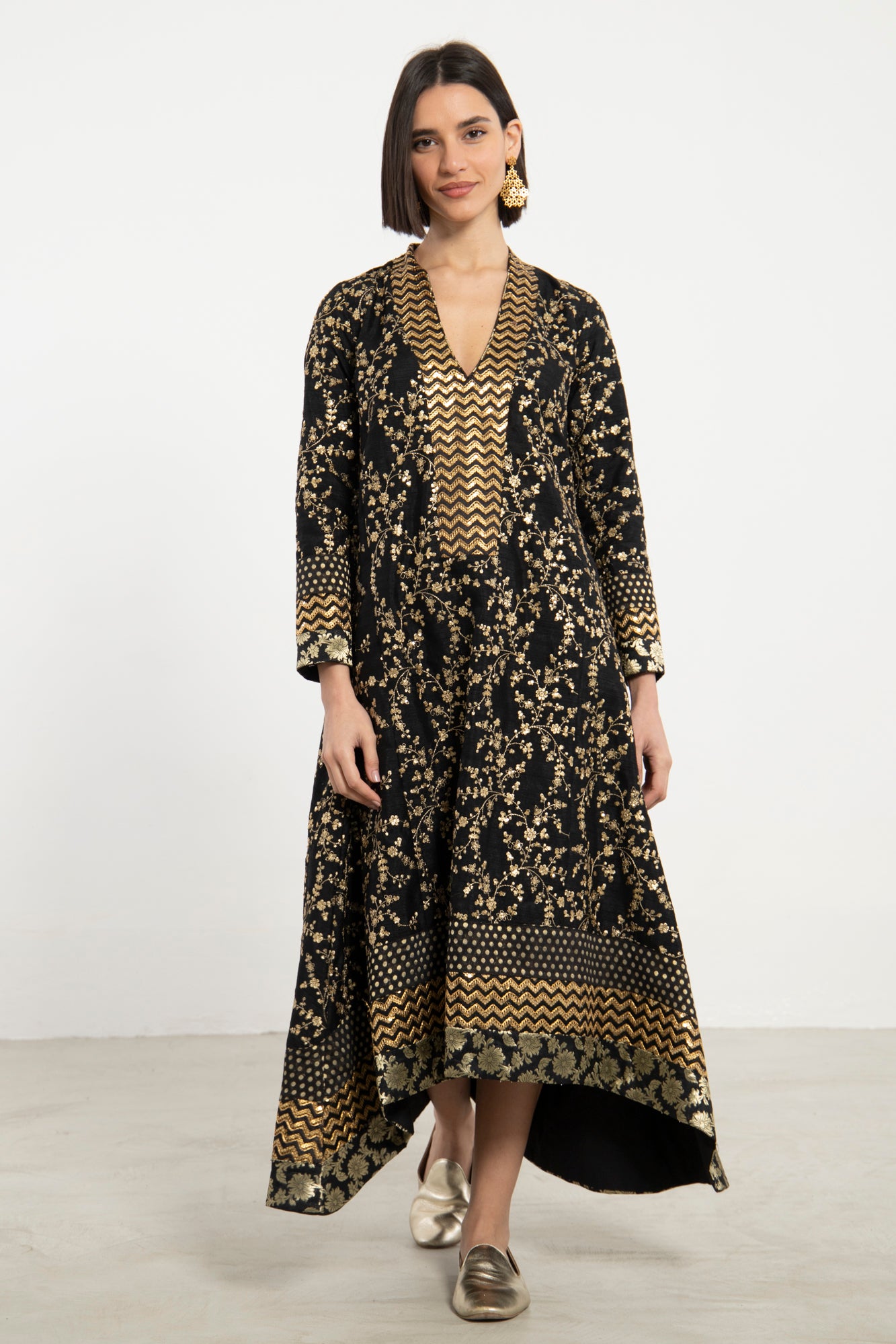 The Nahar Dress is made from regal black silk and embellished with intricate gold embroidery. Featuring a high-low hem and embroidered neckline and sleeves, this piece is a refined silhouette that balances structure with fluidity.