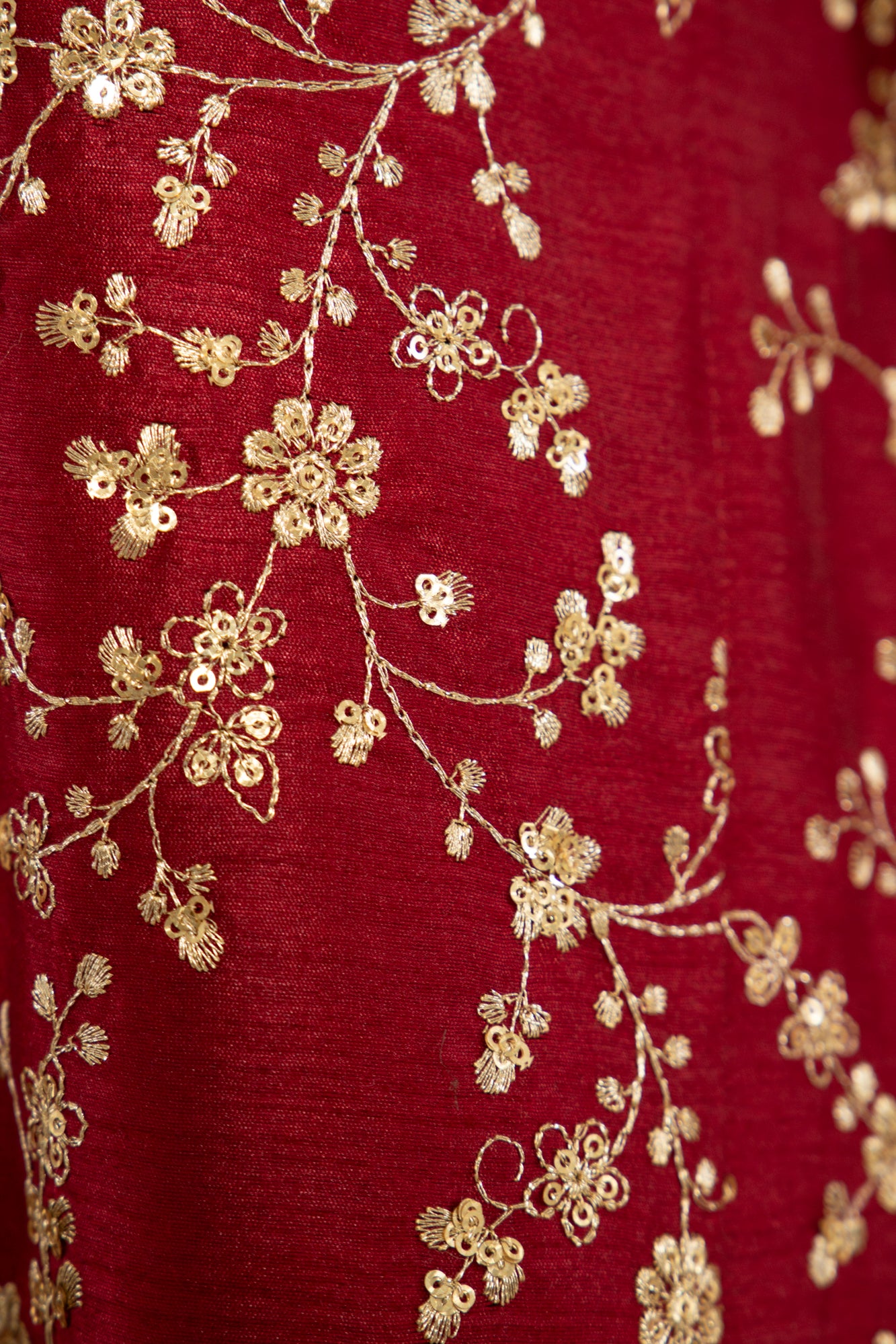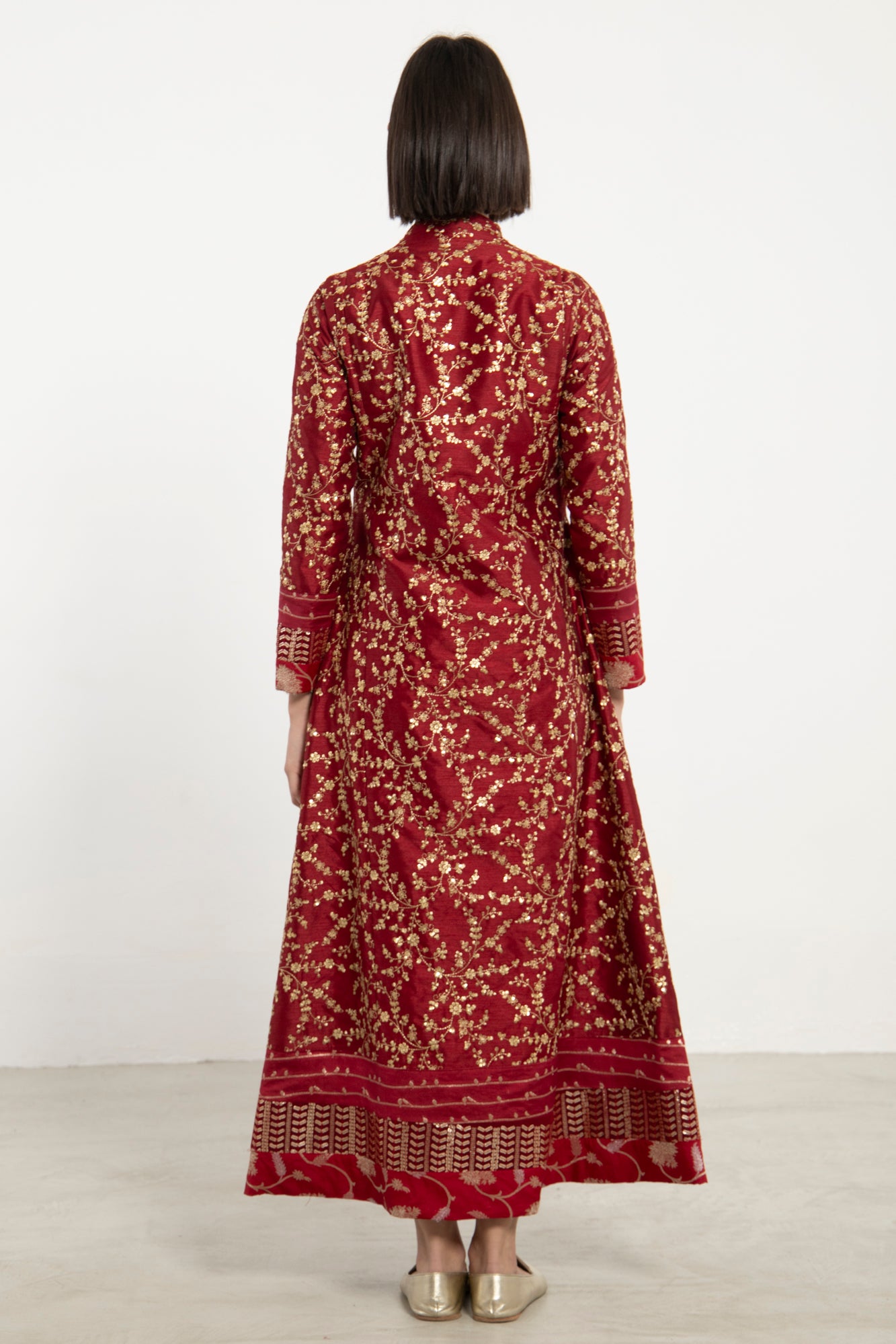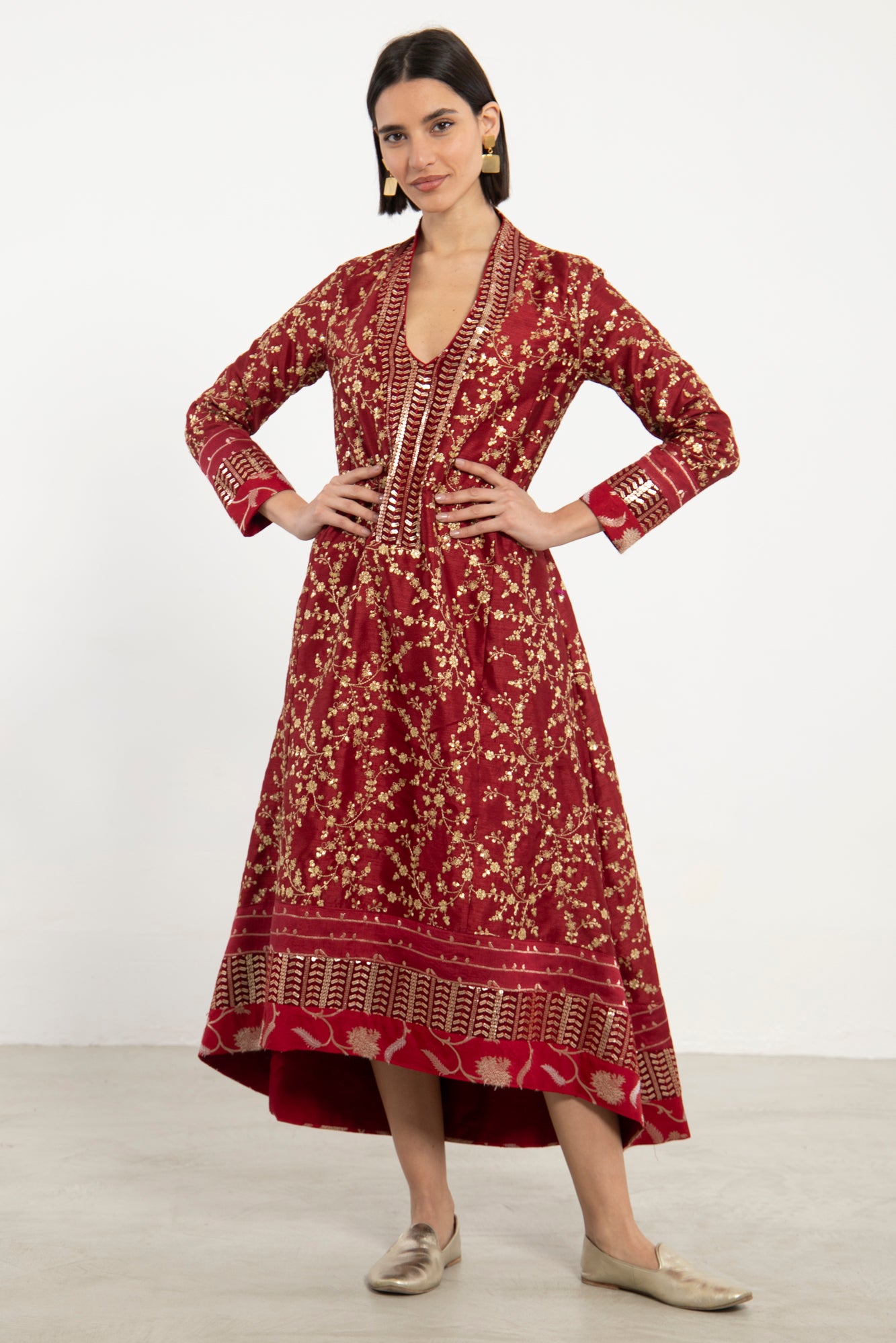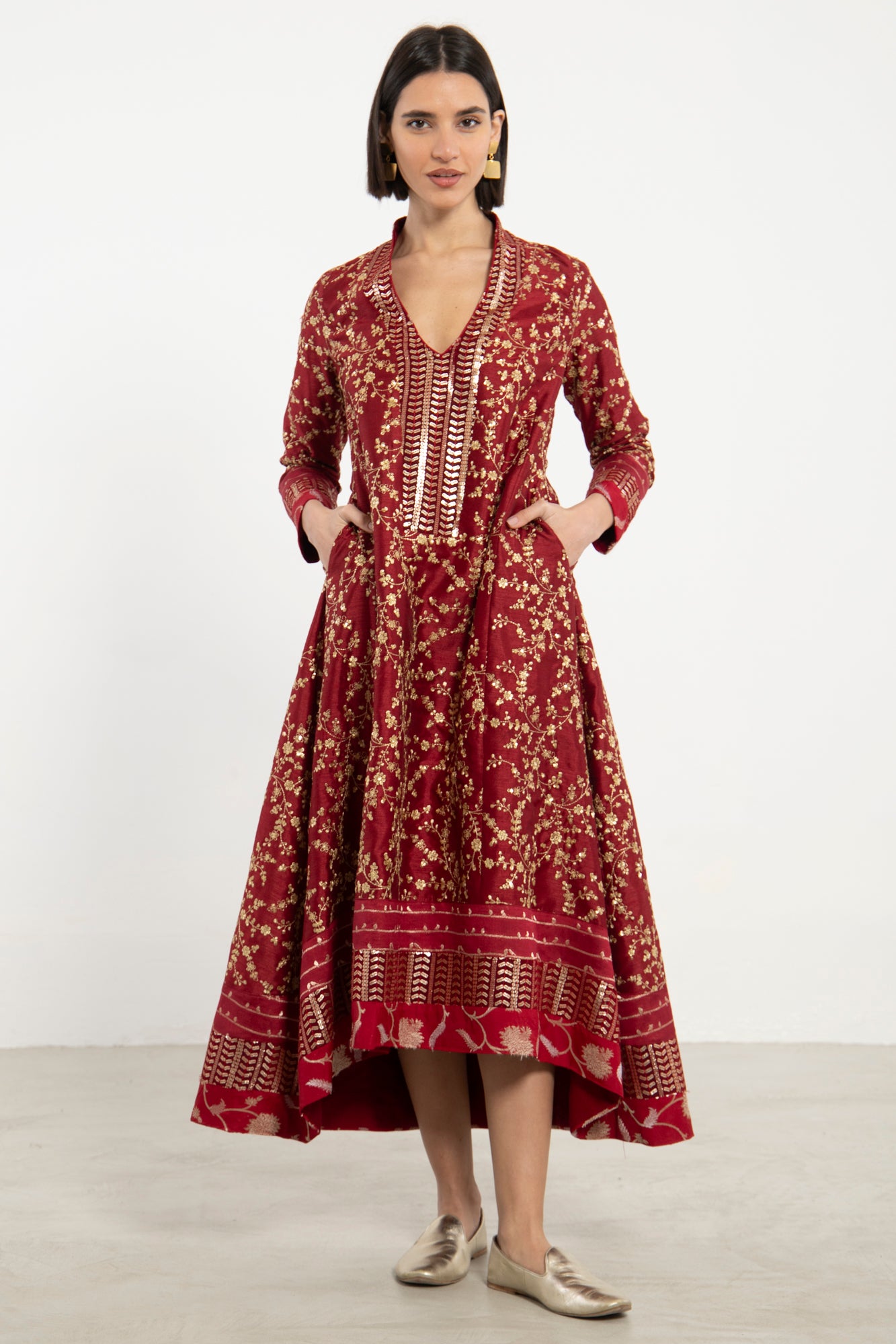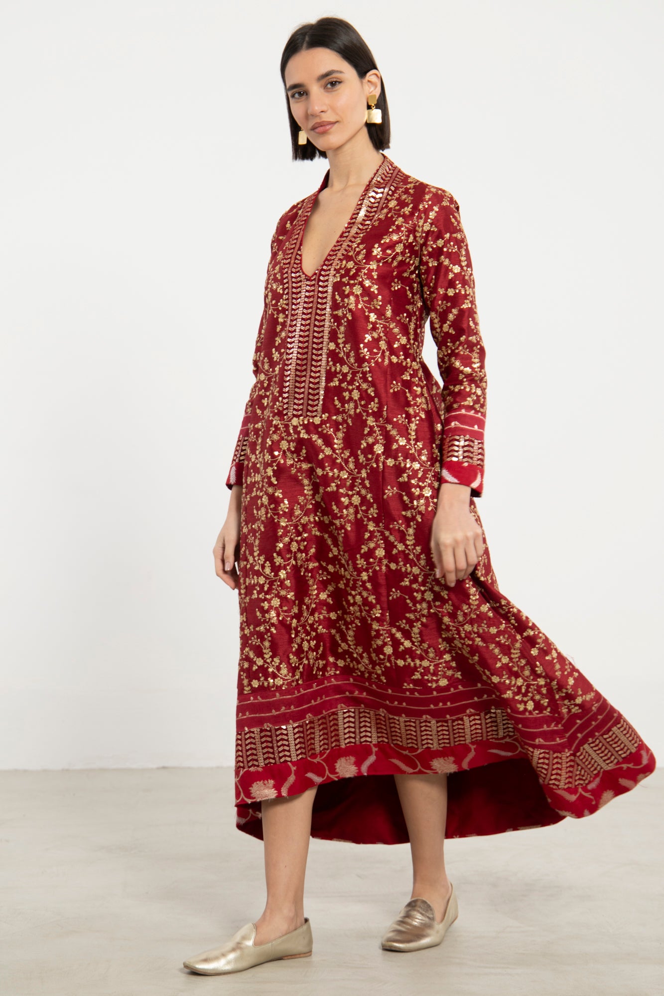 The Nahar Dress is made from regal burgundy silk and embellished with intricate gold embroidery. Featuring a high-low hem and embroidered neckline and sleeves, this piece is a refined silhouette that balances structure with fluidity.