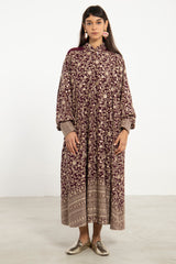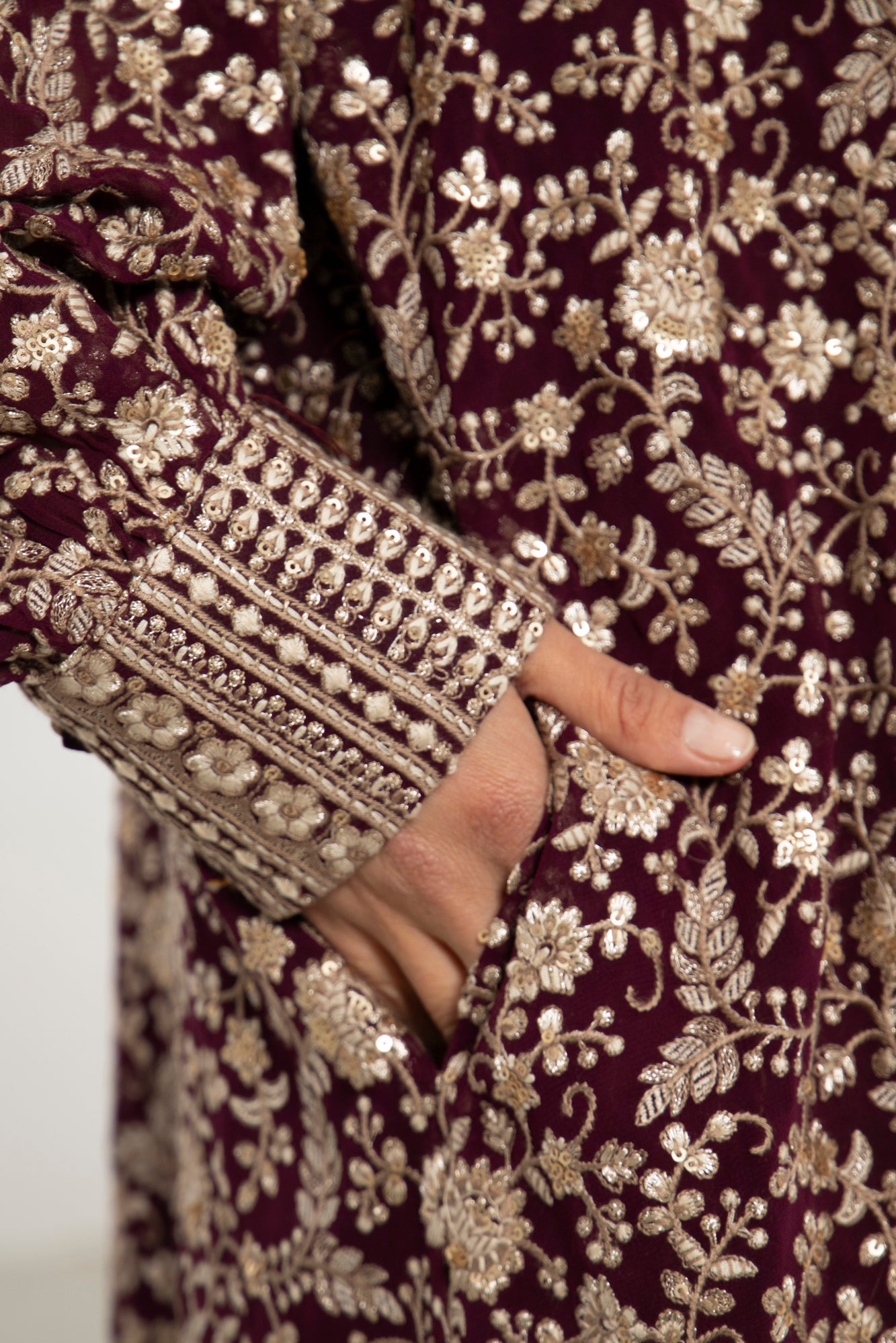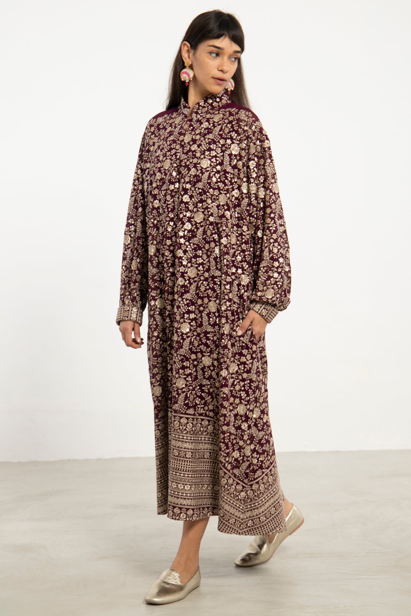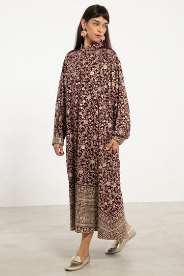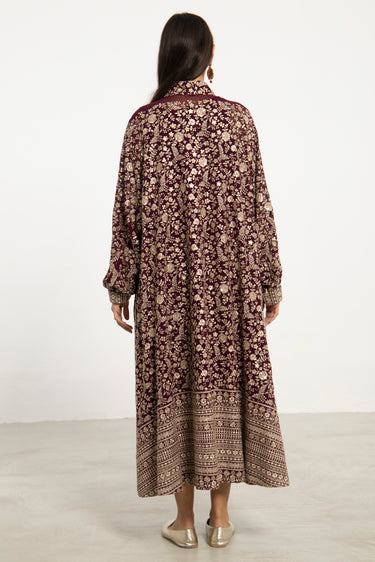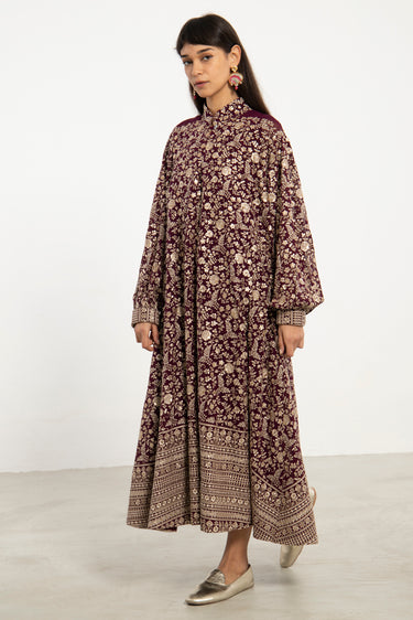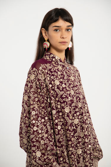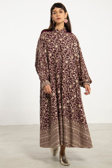 A flowing silhouette in deep purple silk georgette, the Nour Dress is adorned with intricate gold sequin embroidery throughout. Finished with a patterned hem and cuff detail, it balances opulence with effortless elegance.
