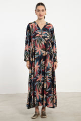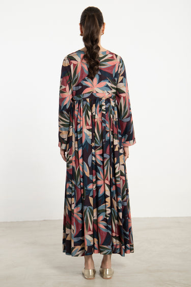 The Zamzam dress is crafted from fluid crepe silk and printed with oversized, painterly florals in muted jewel tones. Its softly gathered waist and buttoned neckline lend ease and elegance to this timeless silhouette.