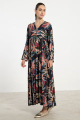Details: Long-sleeved crepe silk dress with pleated waist, V-slit neckline, and front button detail