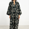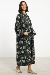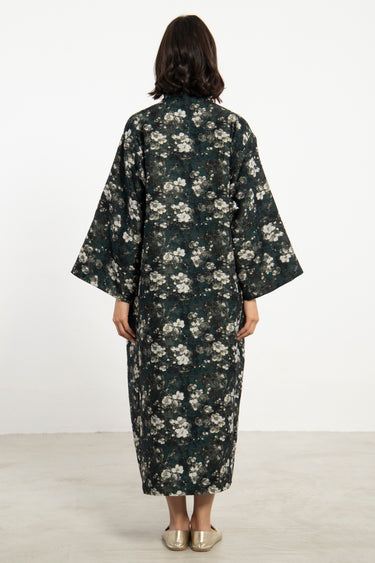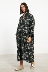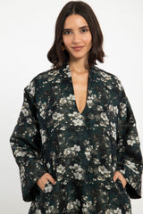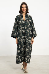 The Nisrine Dress is cut from thick cotton, featuring a deep green base with delicate floral motifs. Designed with a V-neckline and wide sleeves, it offers both structure and ease in a relaxed silhouette.