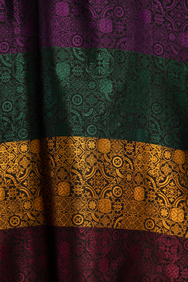 The Rabiaa dress is a vibrant composition of silk panels in jewel-toned brocade, contrasted with deep black jacquard sides. With its clean neckline and fluid silhouette, this piece brings together bold color and classic form.