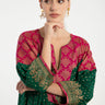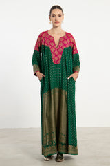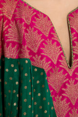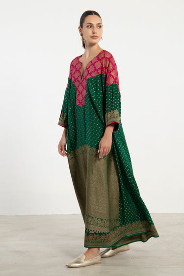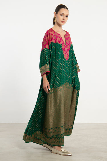 An exquisite one-of-a-kind creation, the Rania dress blends vibrant fuchsia and deep green tones in handwoven silk, elevated by intricate gold motifs. Its flowing silhouette and traditional neckline evoke timeless elegance.