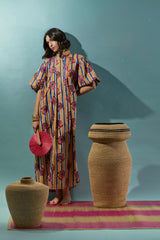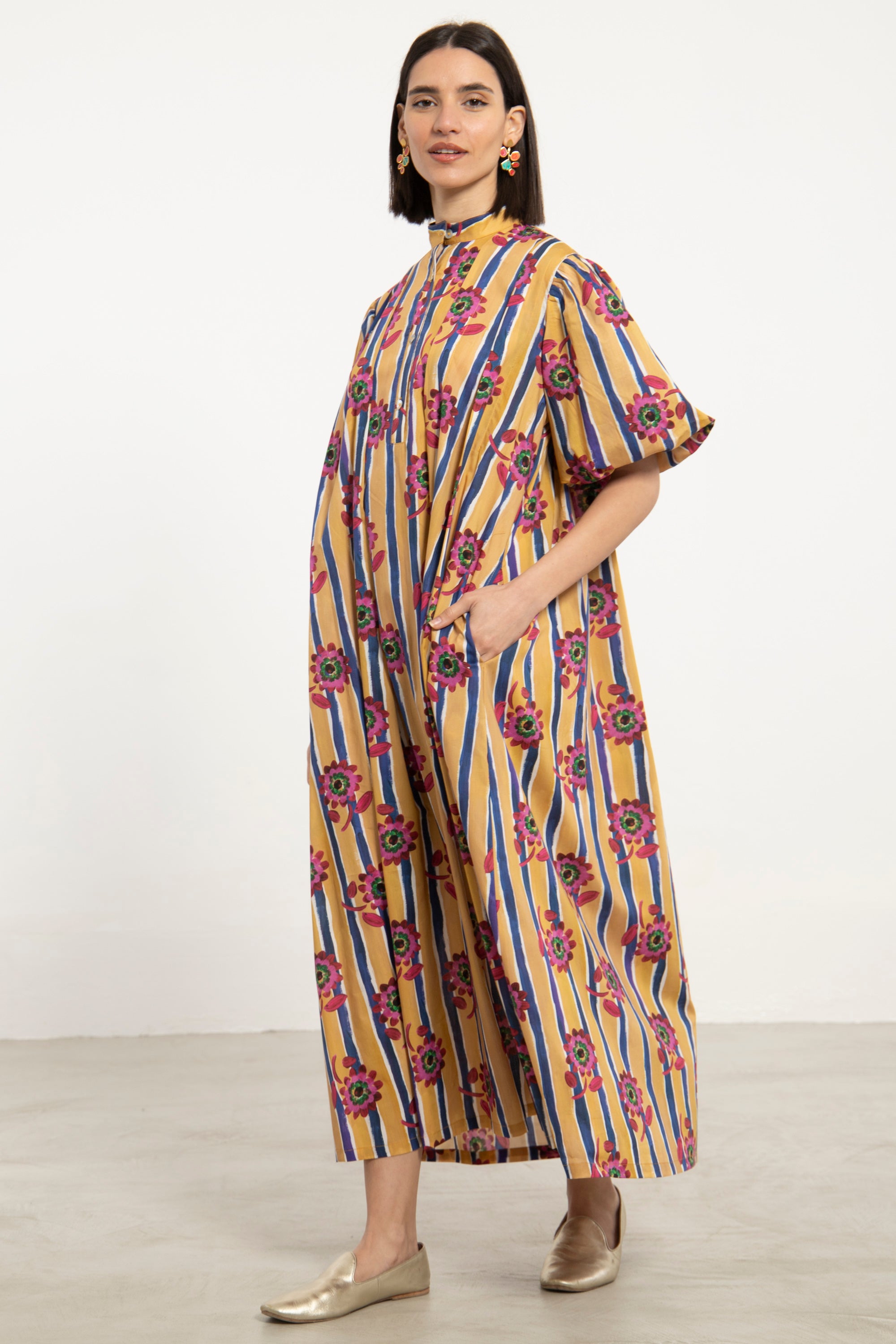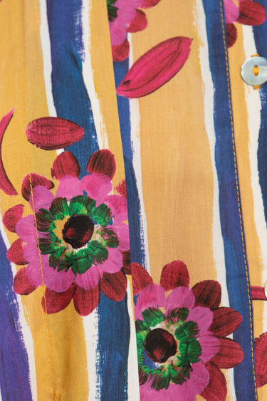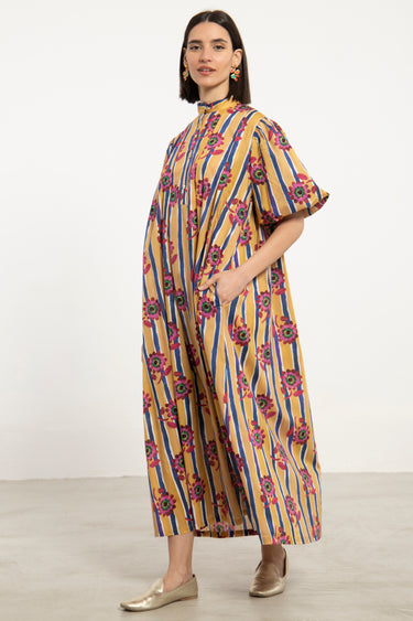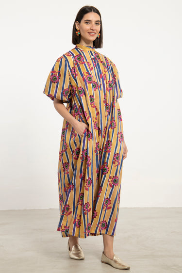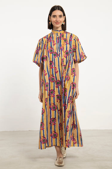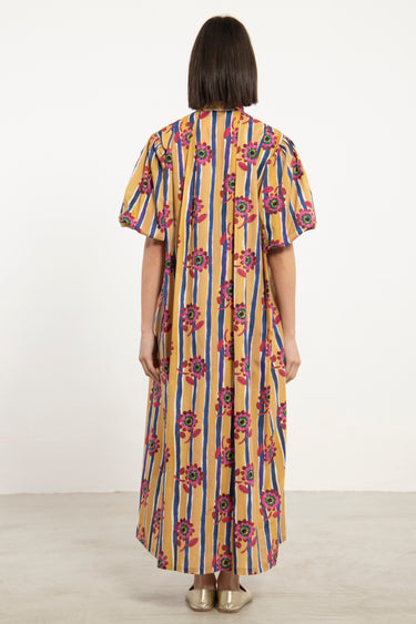 A vibrant dress crafted in lightweight cotton, featuring a bold interplay of vertical stripes and floral motifs. The structured neckline and relaxed volume create a balanced silhouette with a playful edge.