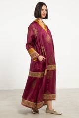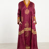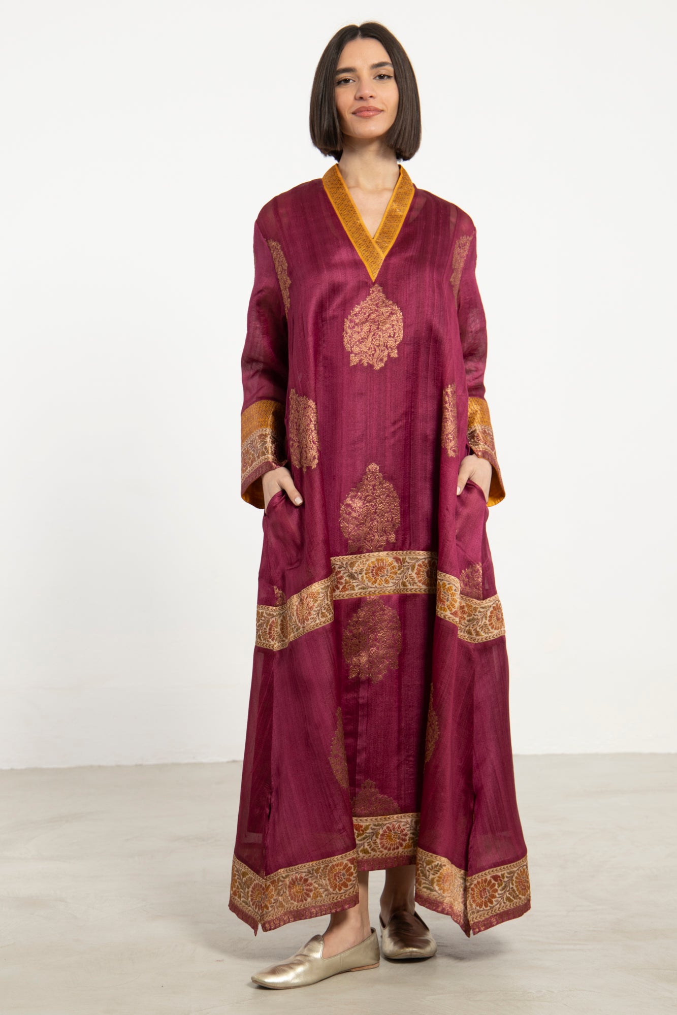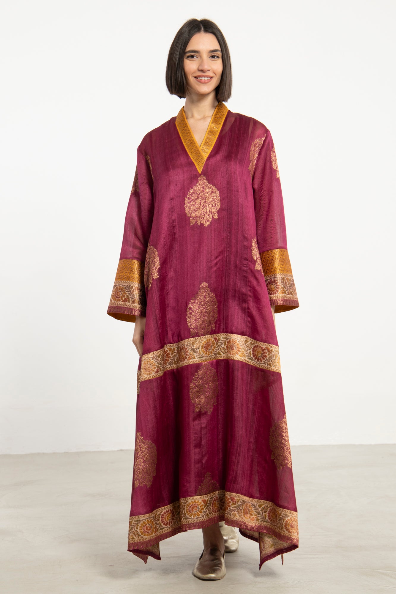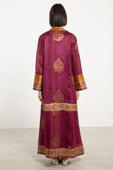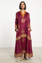 A striking one-of-a-kind piece, the Soula Dress is crafted from silk and adorned with intricate golden motifs and borders. This dress features a flowing cut, long sleeves, and an ornate front panel, offering timeless elegance.