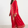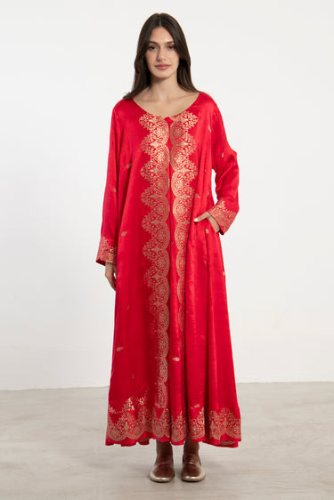 A striking one-of-a-kind piece, the Souraya dress is crafted from lustrous red silk and detailed with intricate woven golden threads along the front, cuffs, and hem. Designed with a flowing silhouette and side pockets, it merges opulence with ease.