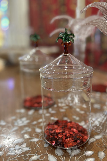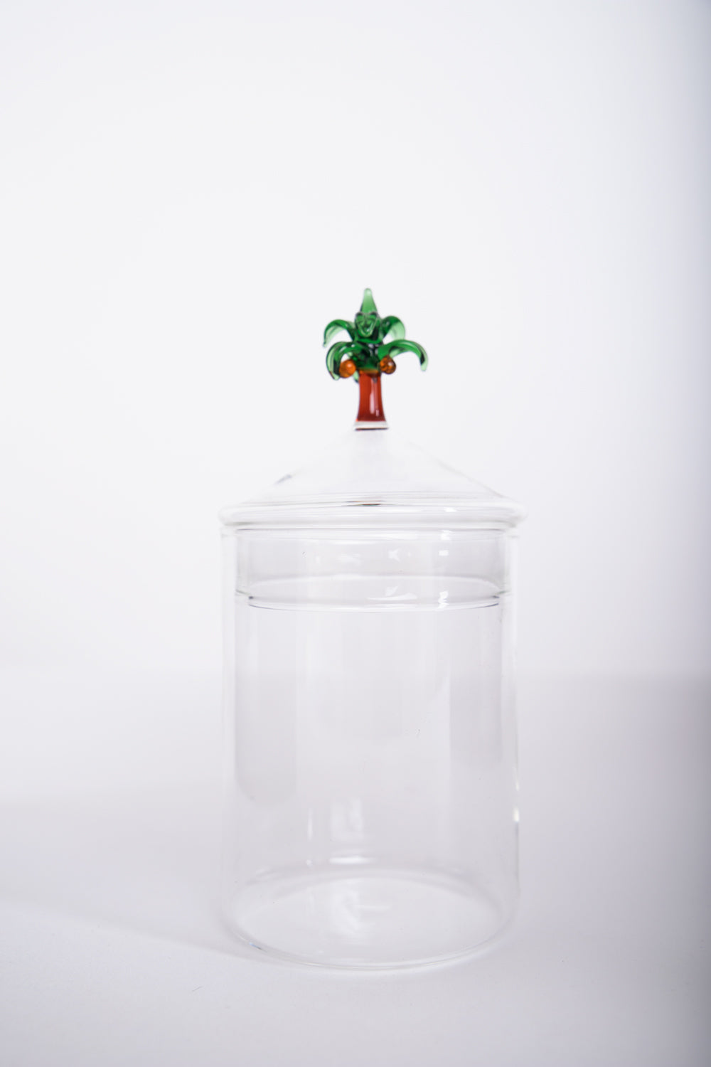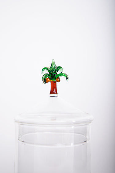 Handmade in crystal-clear glass featuring a captivating palm tree on the lid. A beautiful presence when filled or simply on display.