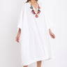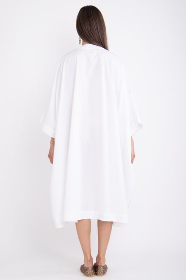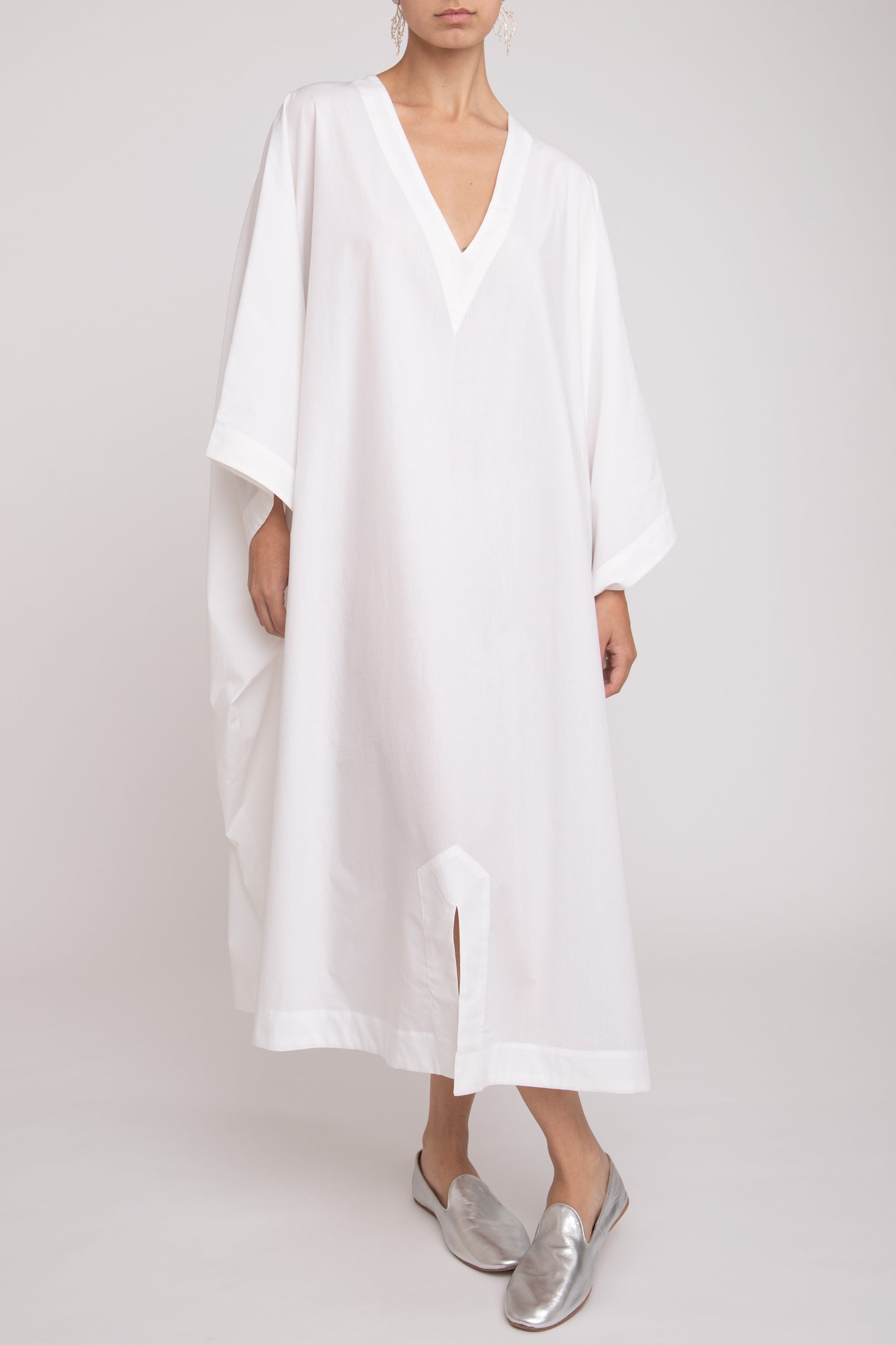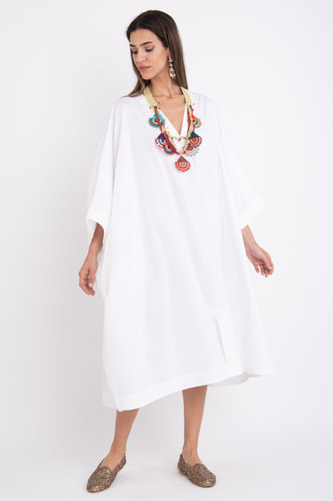 This jellaba is an in-house staple design. Crafted from a crisp poplin cotton, the jellaba "Fahed" features a V-neck, a front slit and a loose silhouette that fits all body types. This jellaba can be worn on its own or as a bikini coverup.