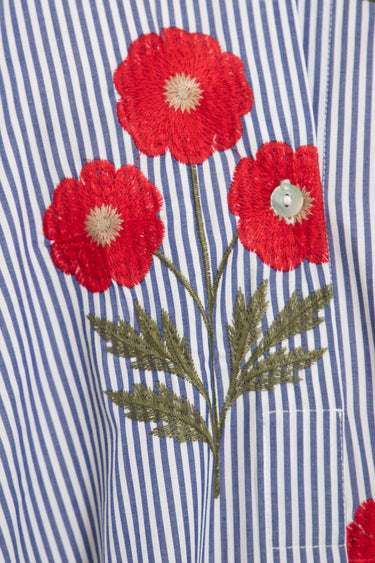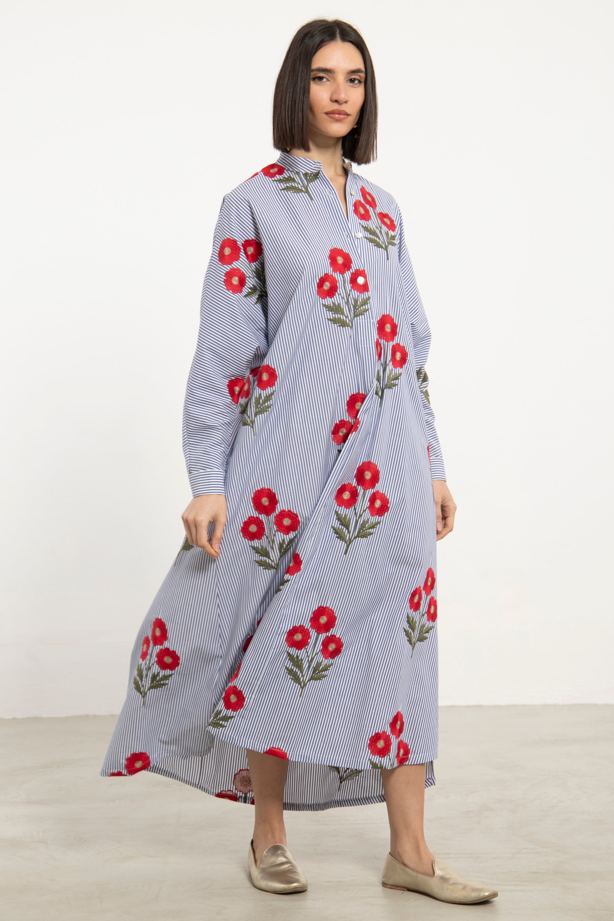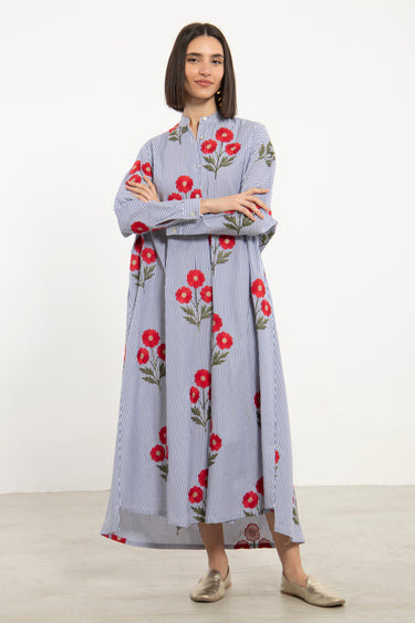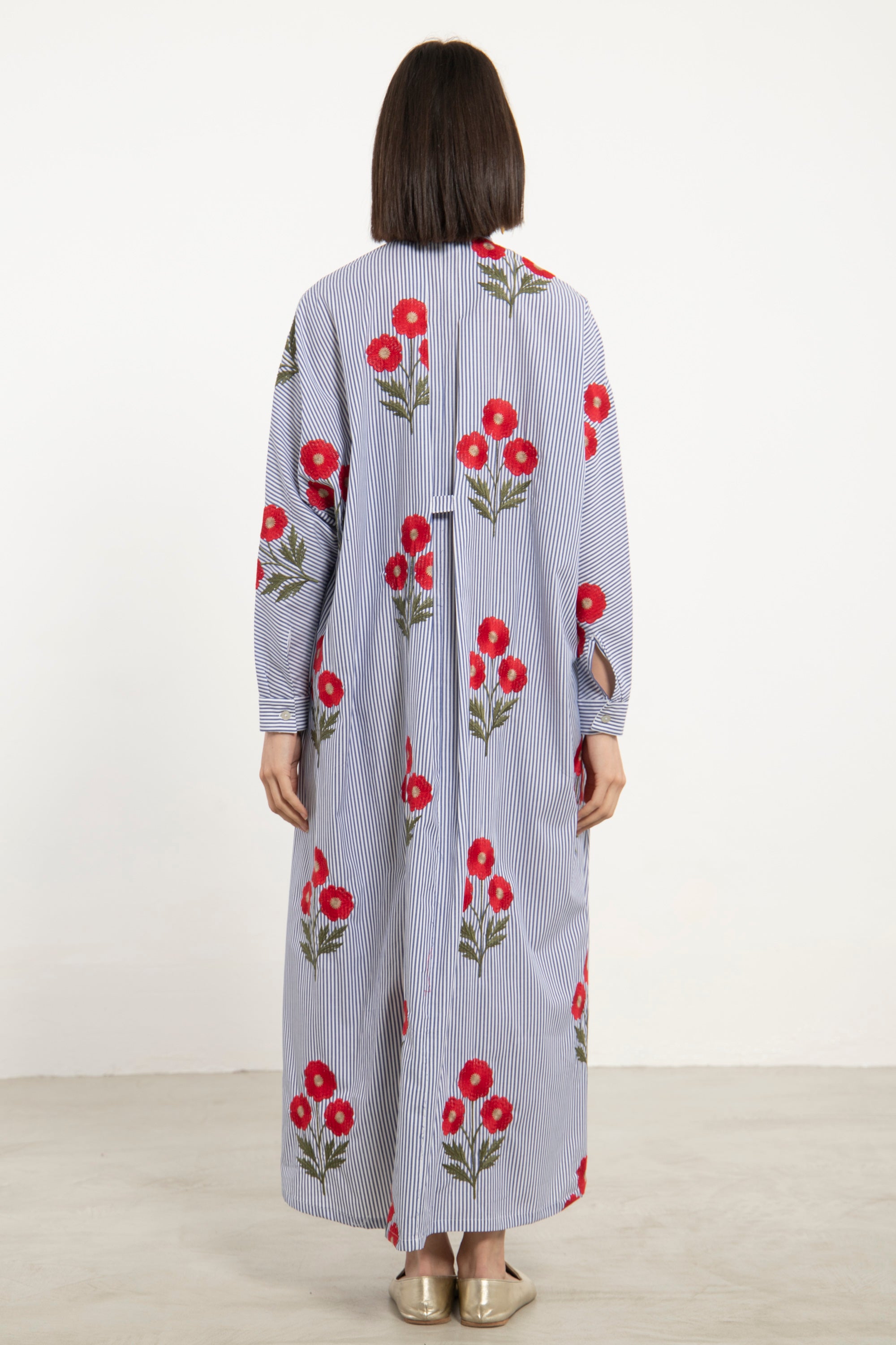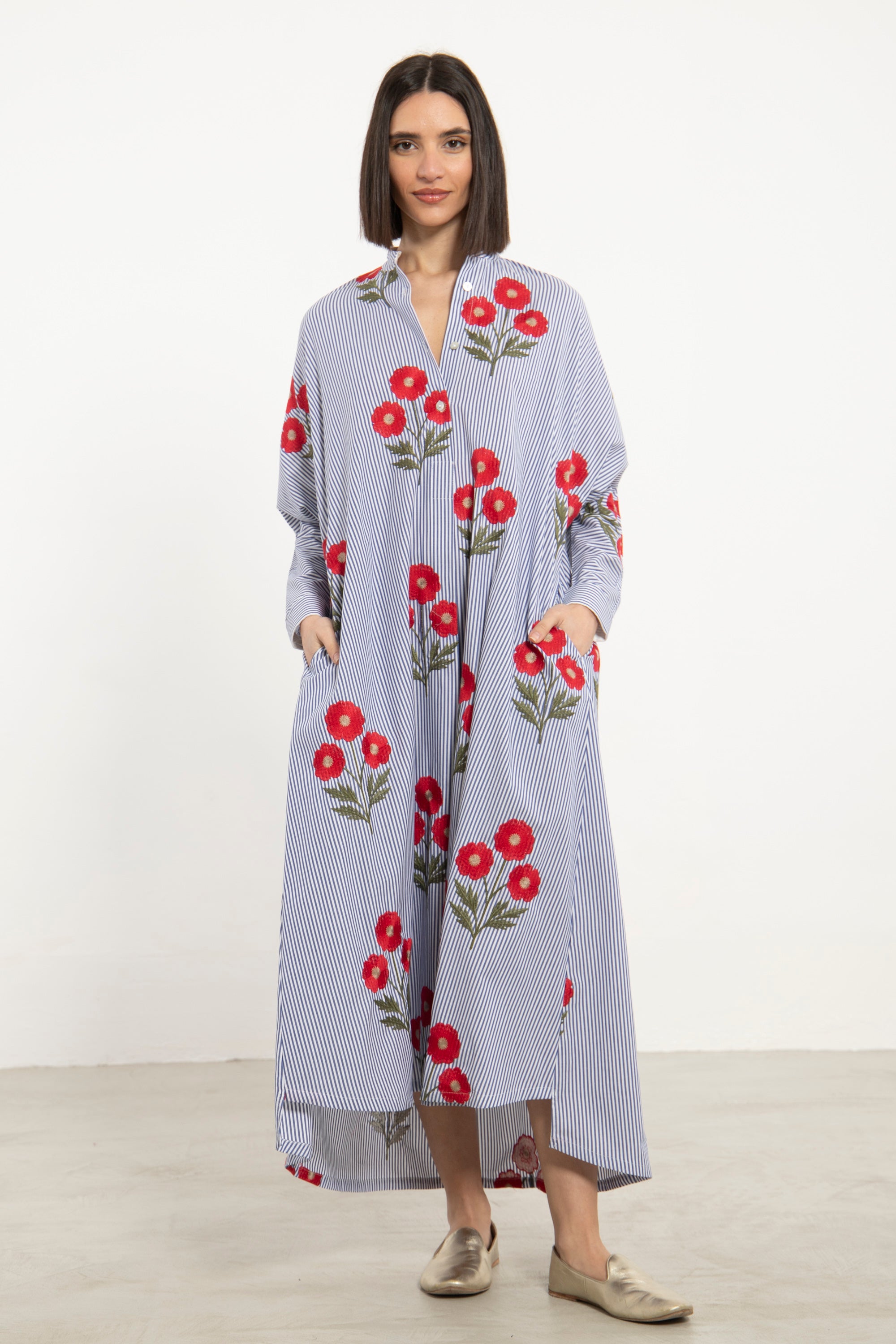 A light and airy jellaba crafted in cotton, featuring fine stripes and vibrant floral embroidery. The relaxed silhouette is complemented by soft structure and everyday ease.